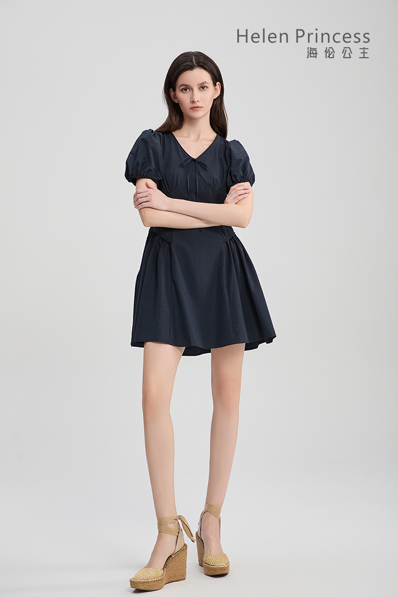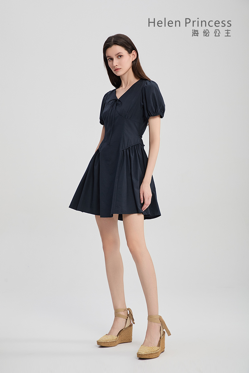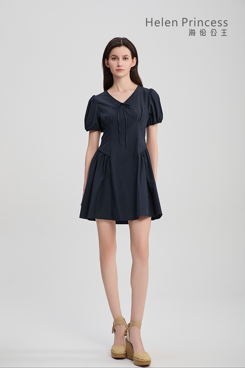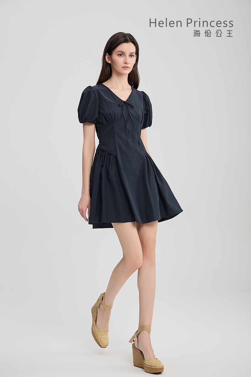 V领蝴蝶结泡泡袖连衣裙-------05532927