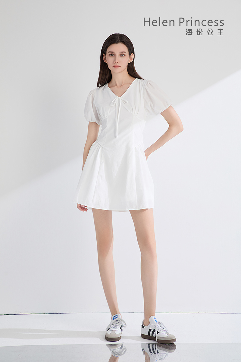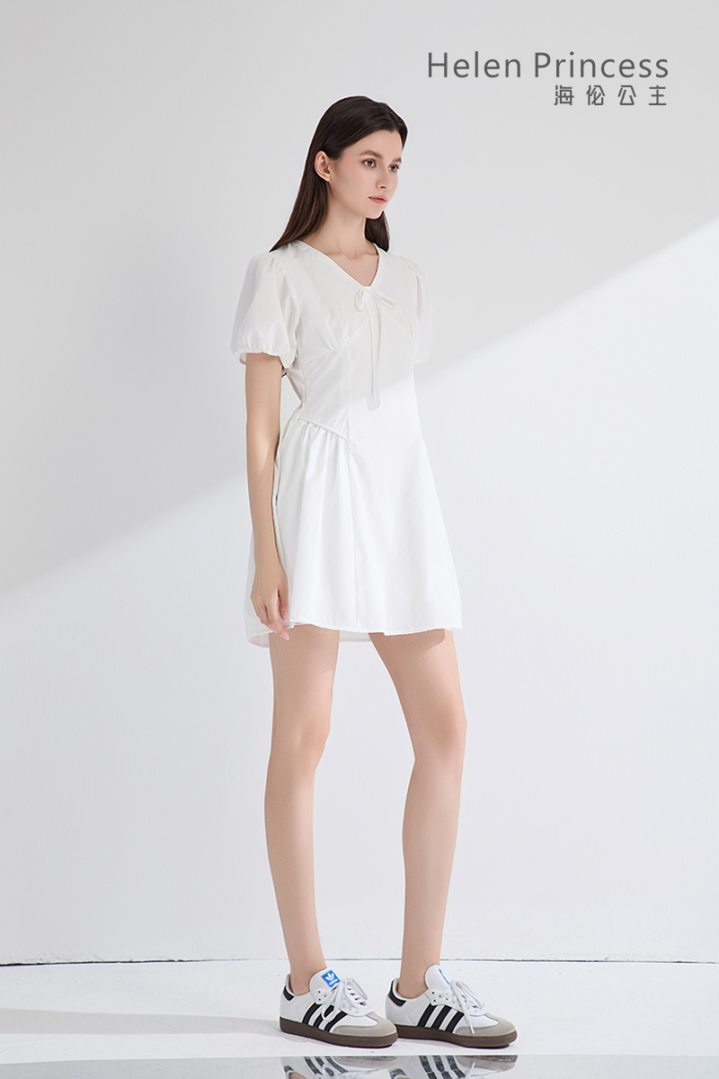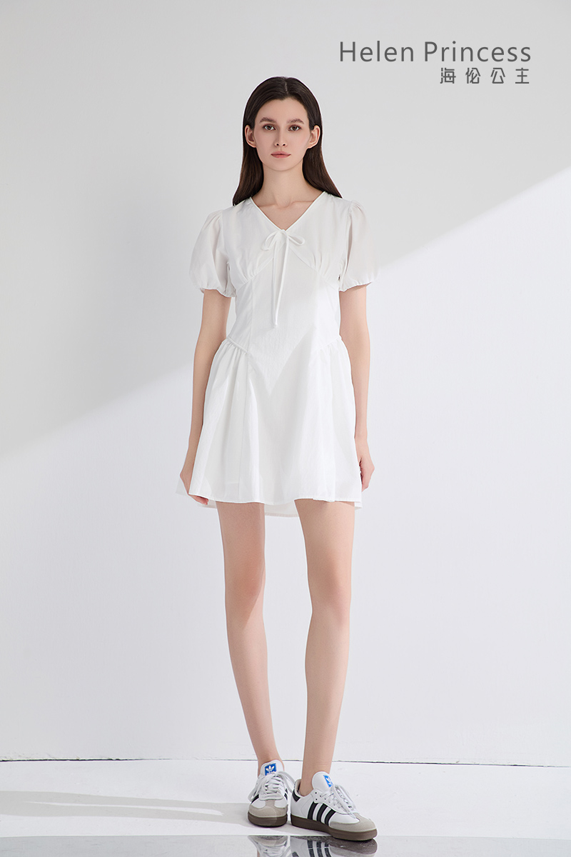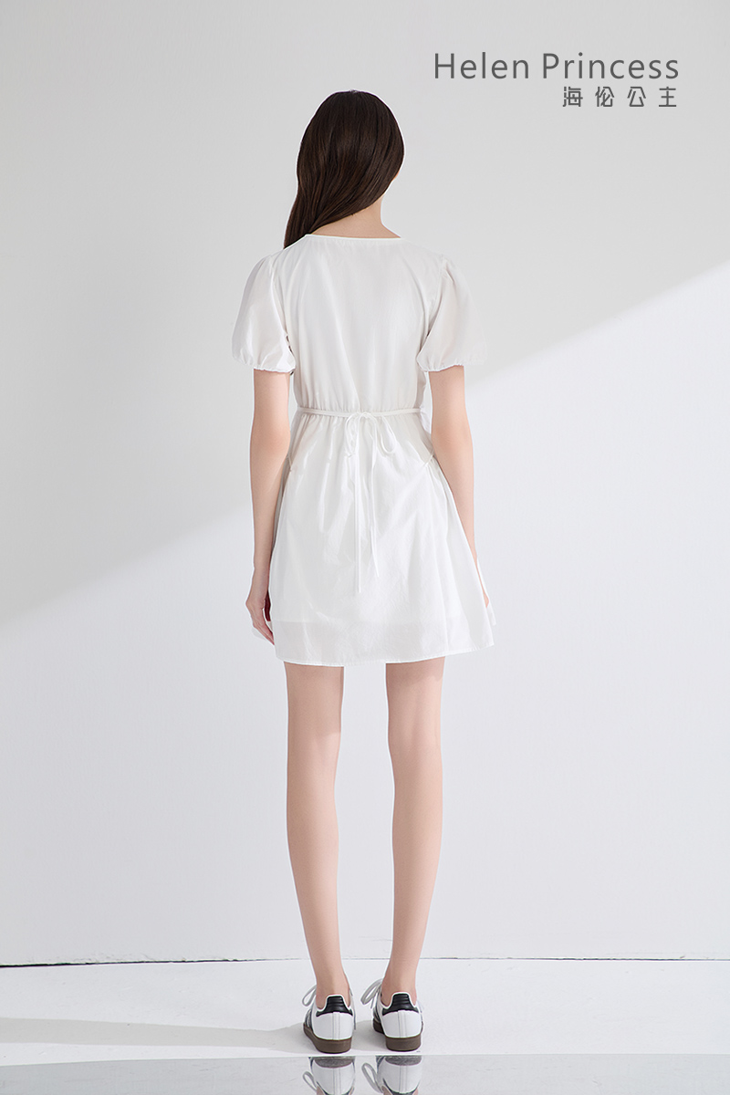 可爱的泡泡袖搭配领口处的系带设计,整体造型增添了一份甜美与灵动,裙摆处的褶皱设计独具匠心,上身更具层次感。