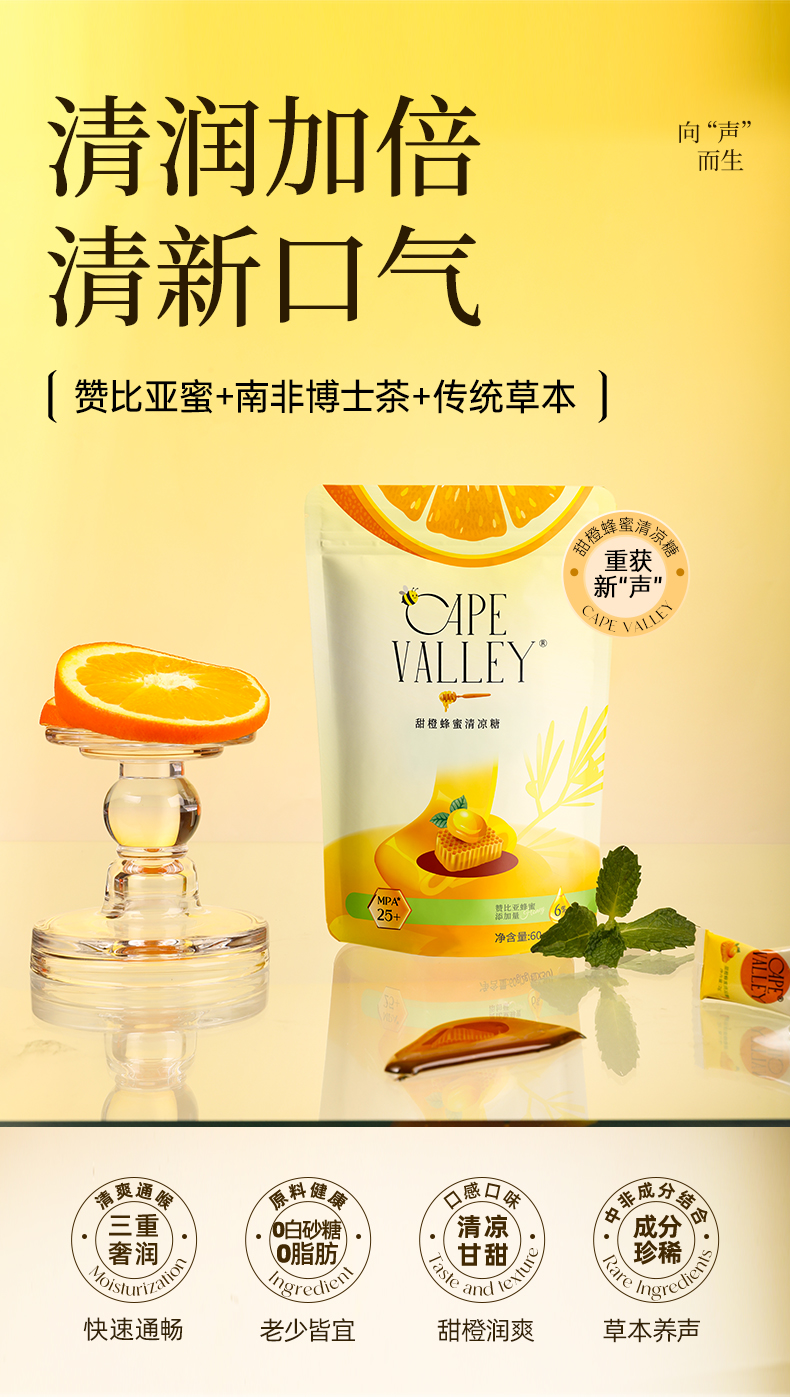 【开普山谷甜橙蜂蜜清凉糖】MPA25+无糖清新薄荷润喉糖果便携护嗓硬糖
