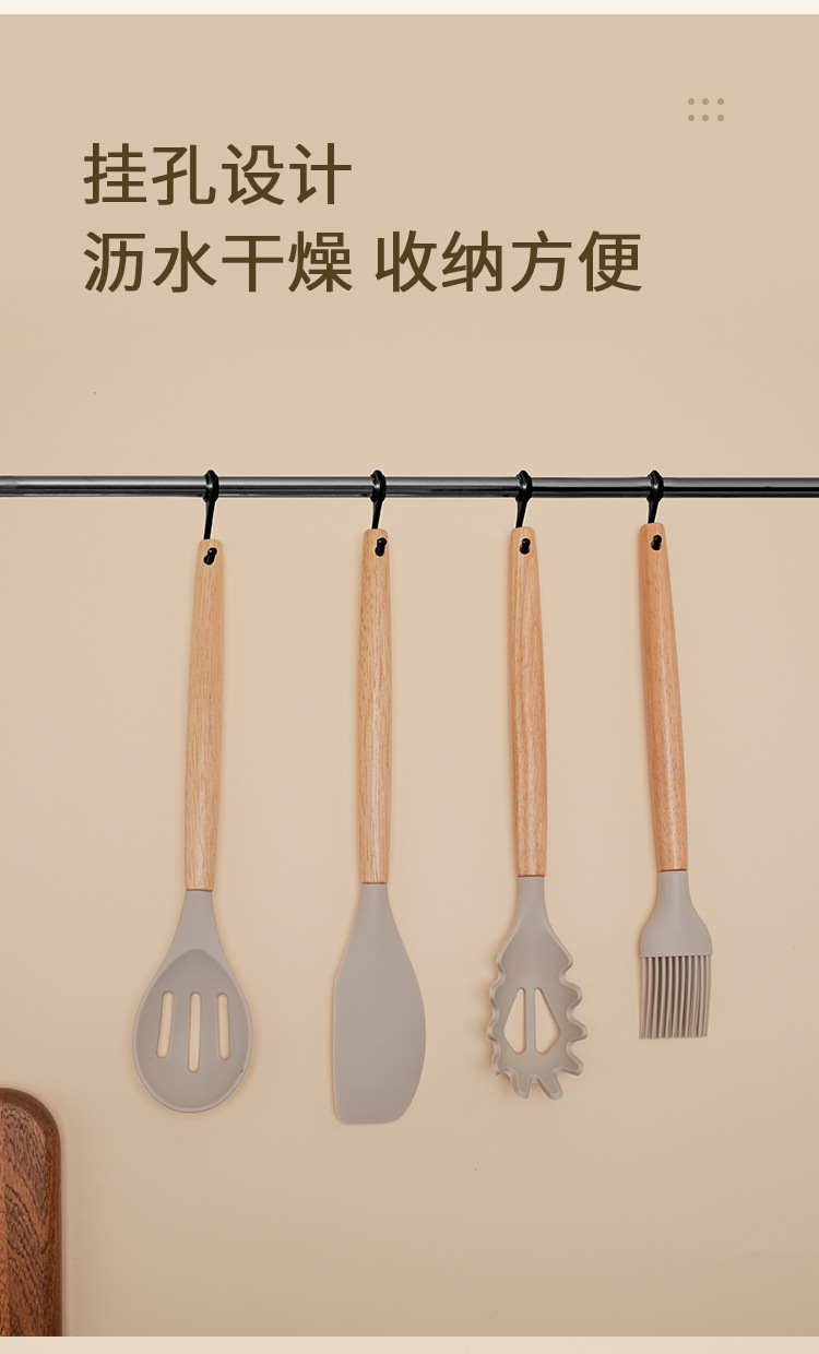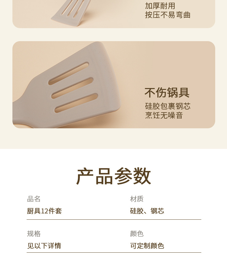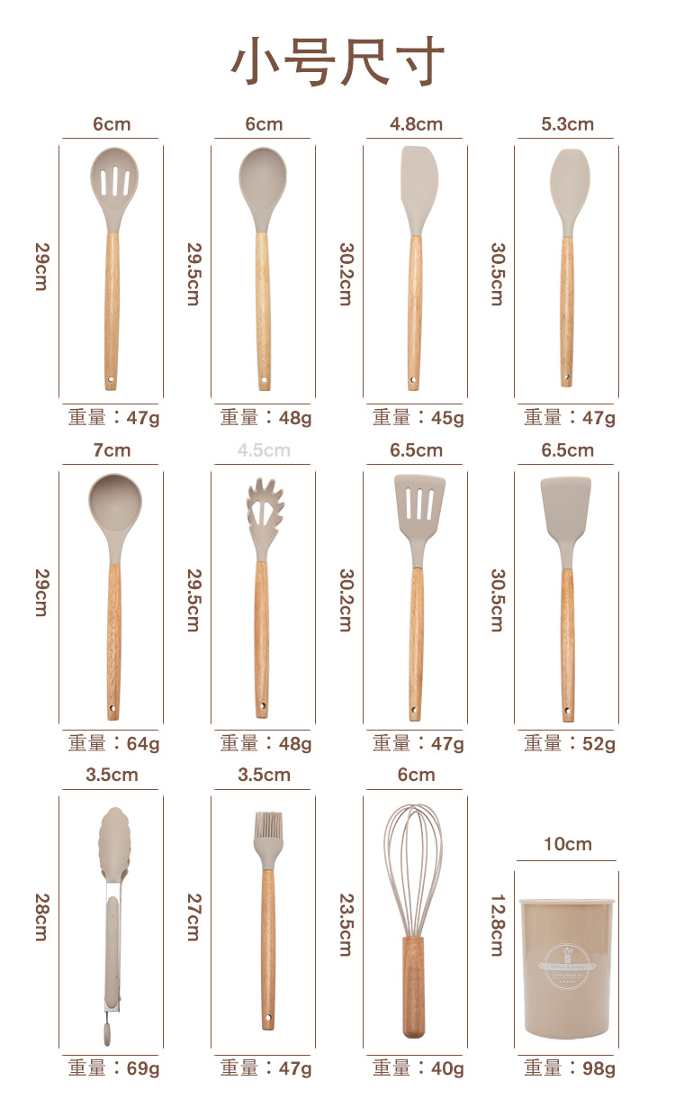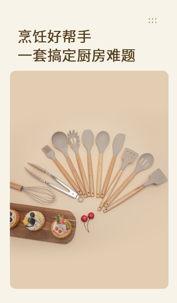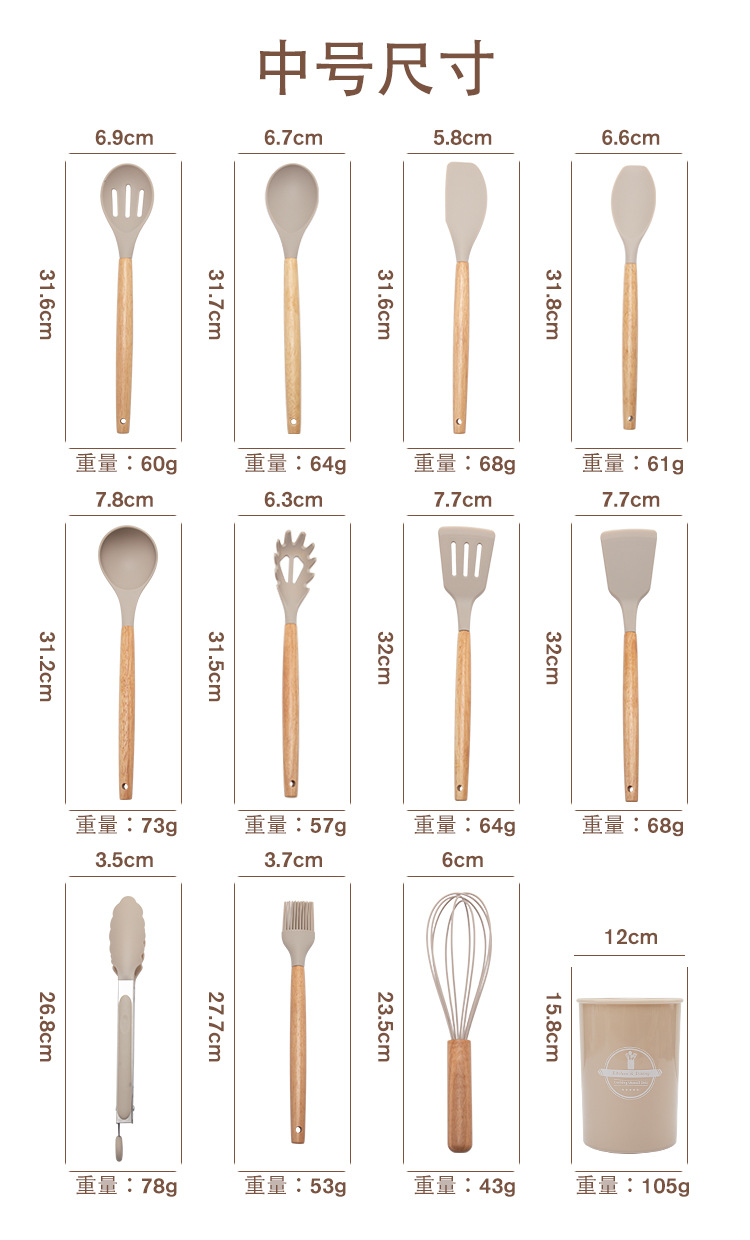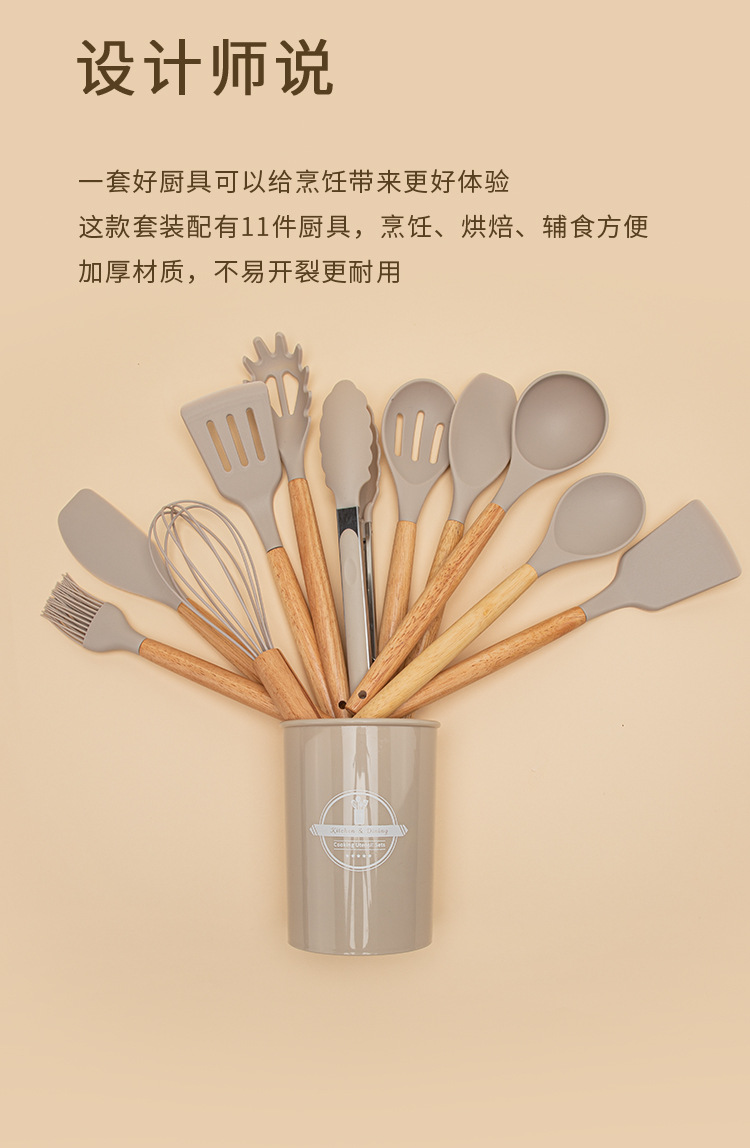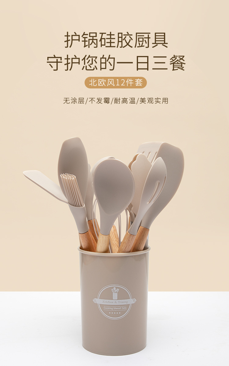 【十二件套,厨房必备!】木柄硅胶厨具套装12件套,烘焙工具收纳桶,不粘锅铲厨房用具烹饪套装