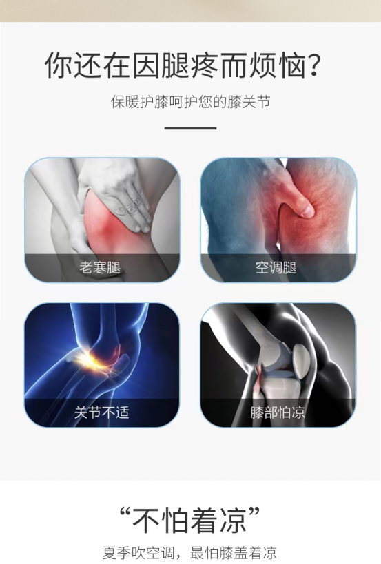 这条空调护膝袜 就是为了保护你的膝盖健康而生! 护膝保暖在空调底下穿着最合适不过了~ 穿上10分钟左右 就能缓解膝盖因为空调冷风导致的“骨头痛” 温热保暖,带动血液循环,让膝盖感觉暖暖的~