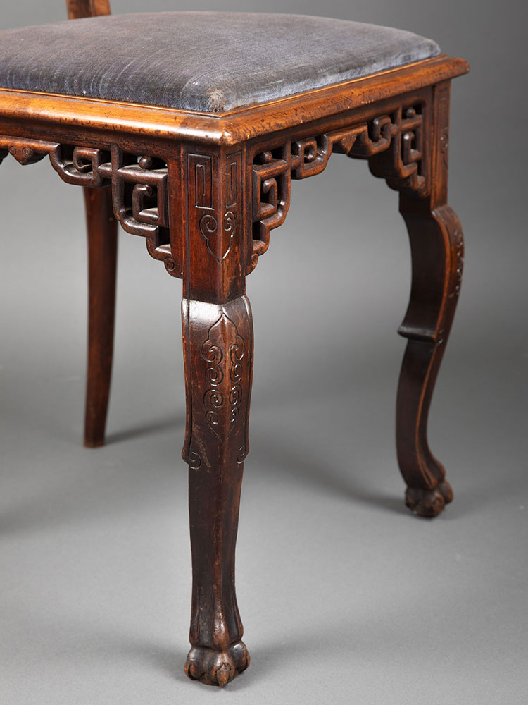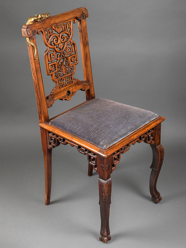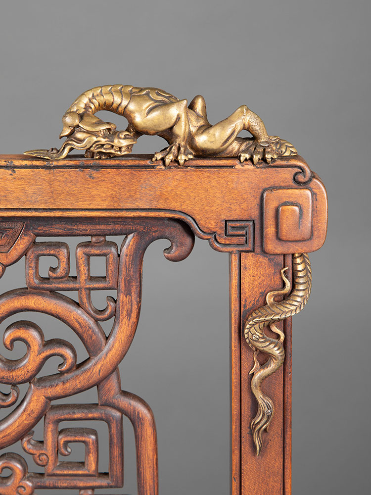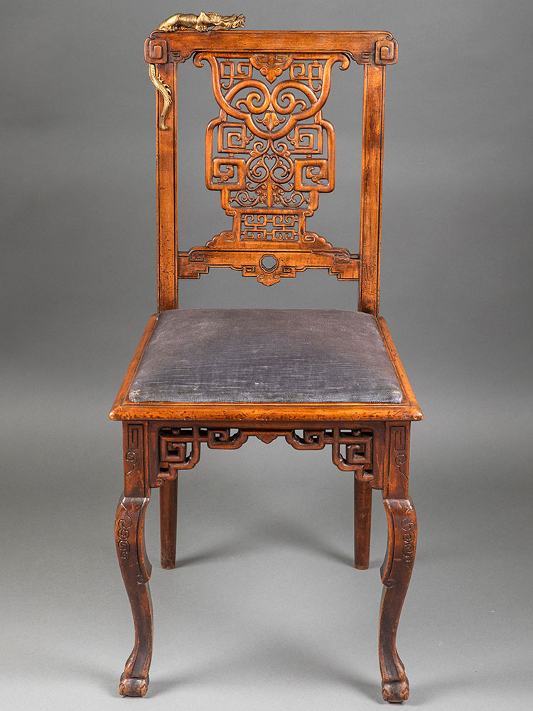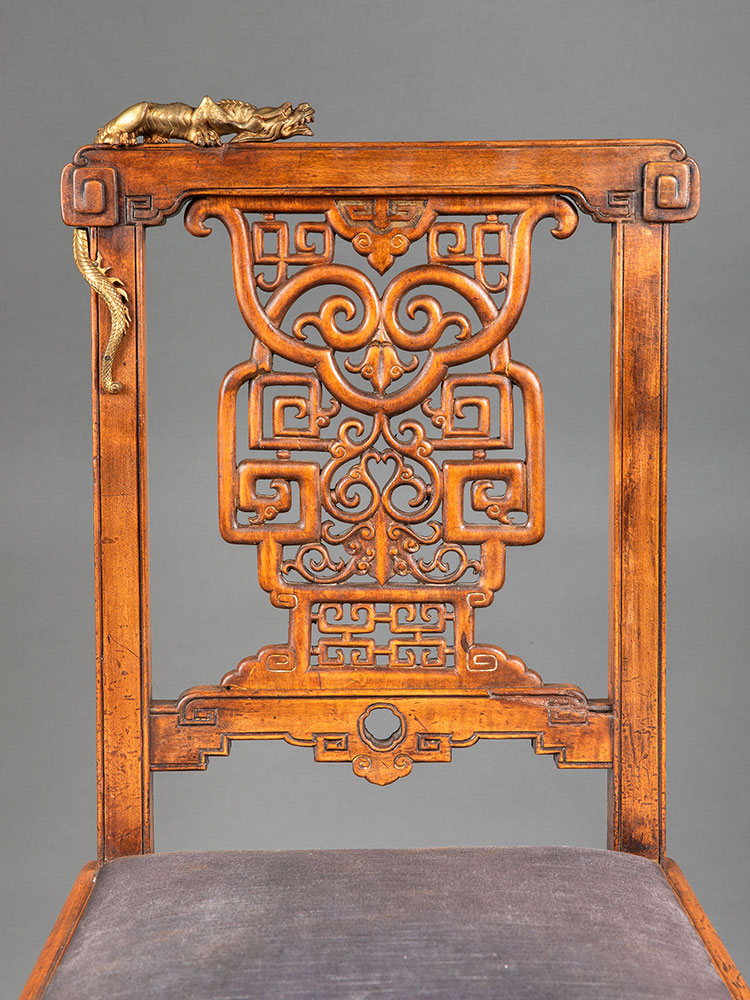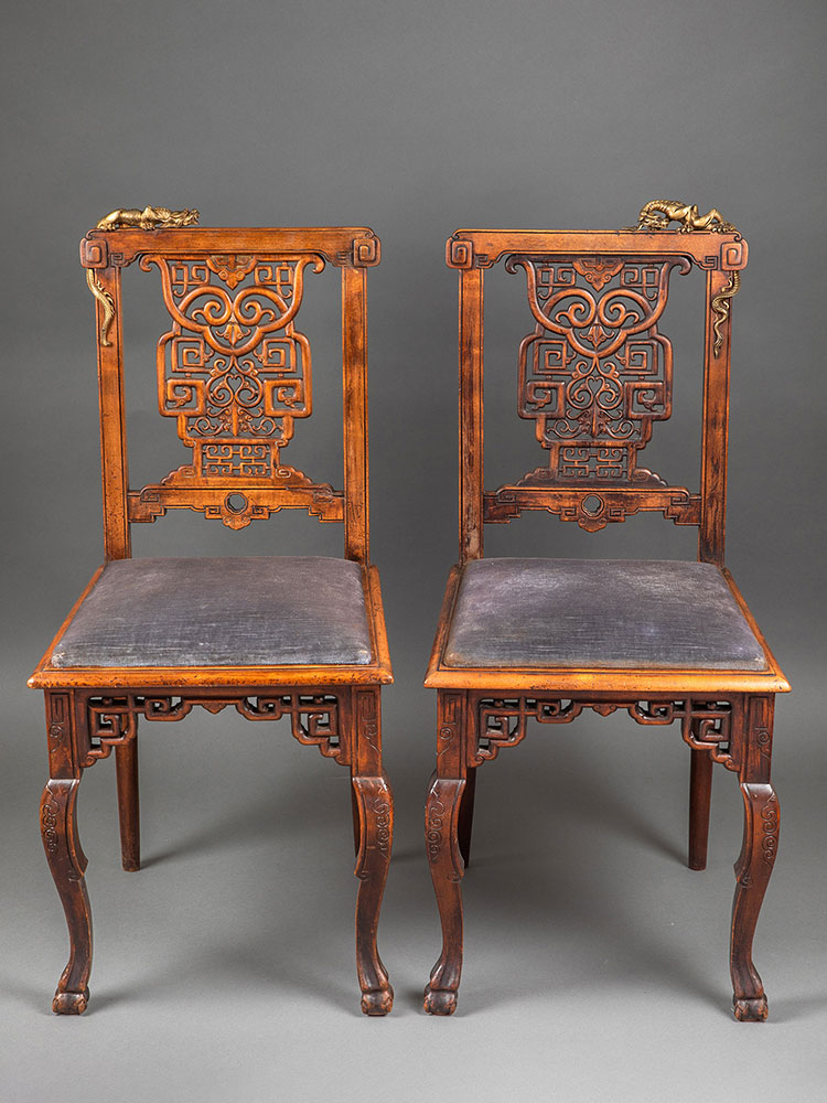 19世纪法国出品维多东方风格祥纹镂雕蟠龙木鎏金装饰单人椅一对