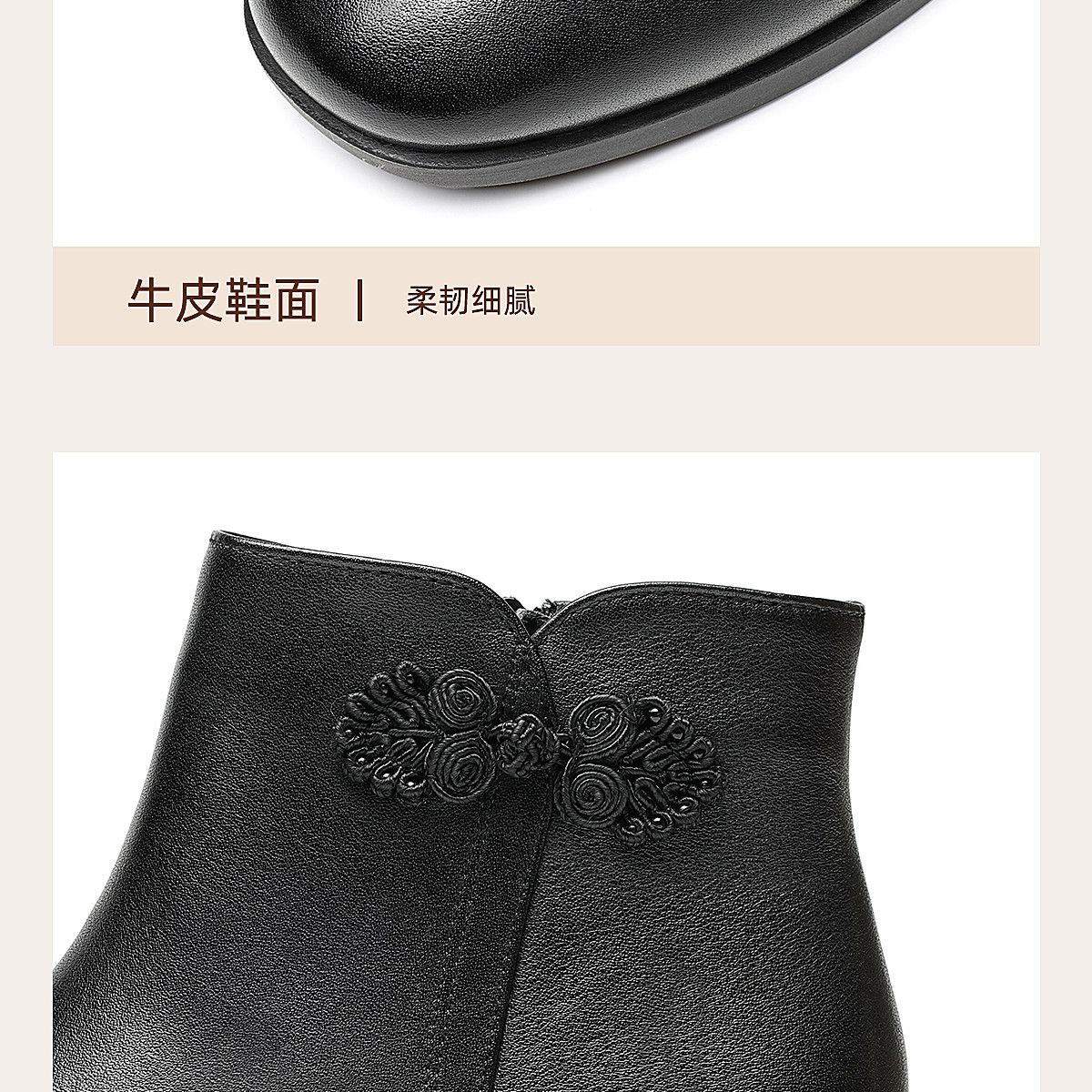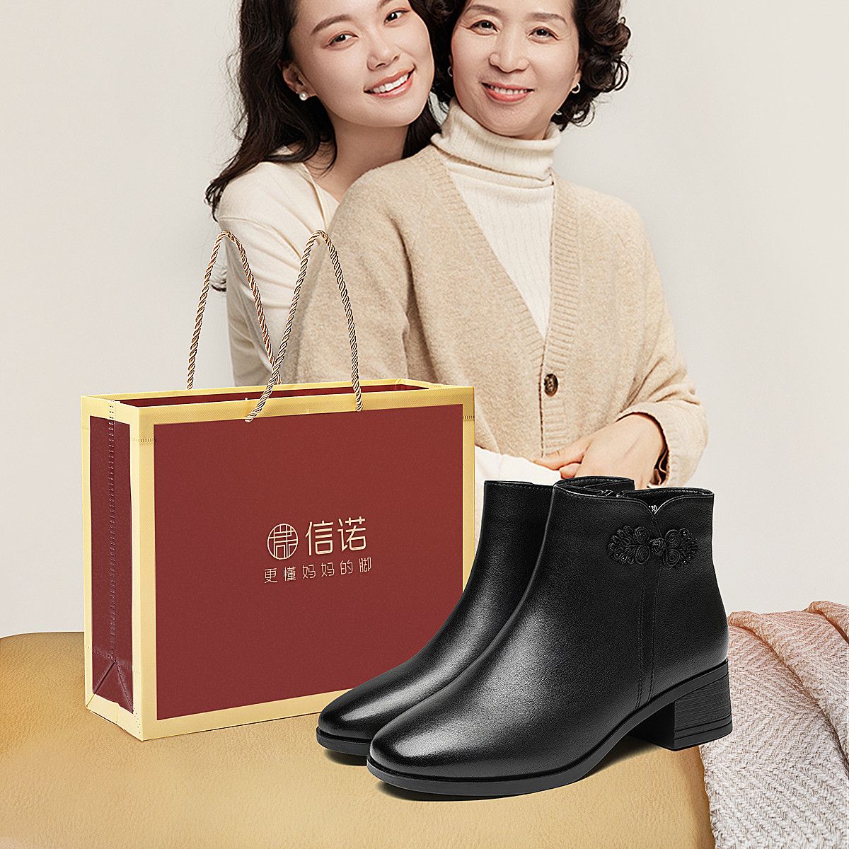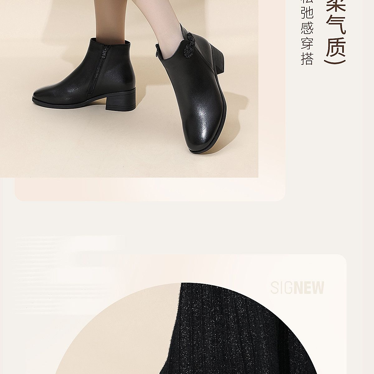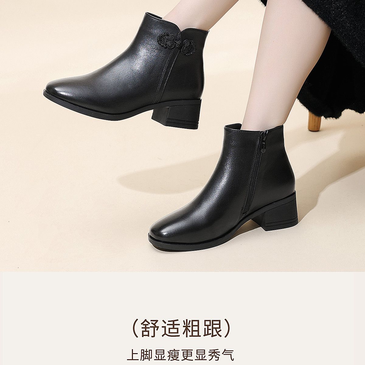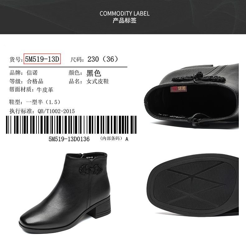信诺真皮妈妈短靴粗跟靴子女2025冬季新款中老年加绒保暖棉鞋皮鞋5M519-13D