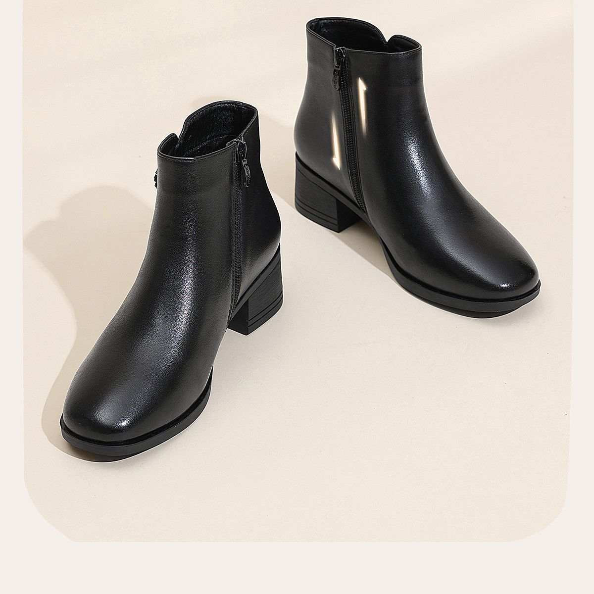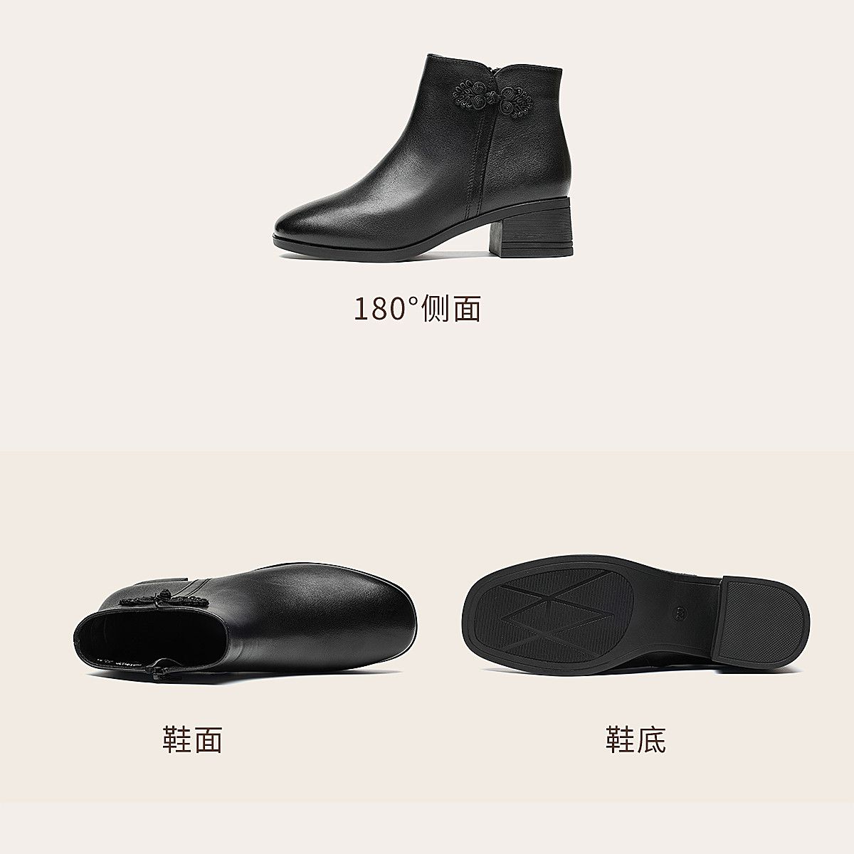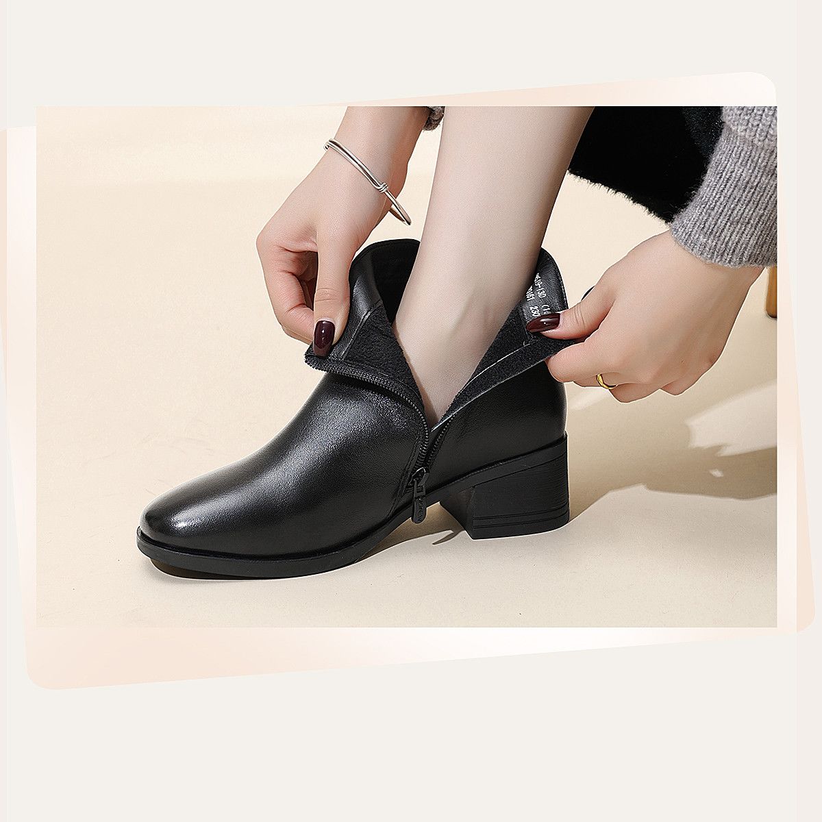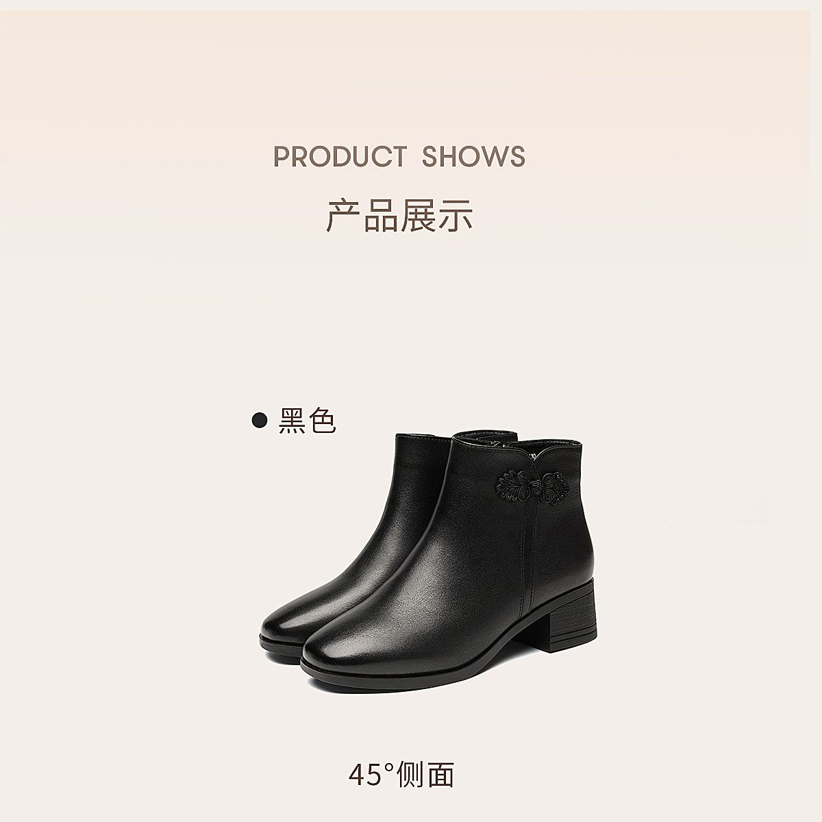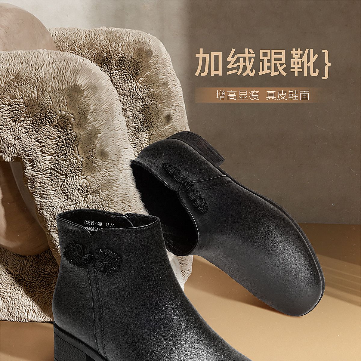 信诺真皮妈妈短靴粗跟靴子女2025冬季新款中老年加绒保暖棉鞋皮鞋5M519-13D