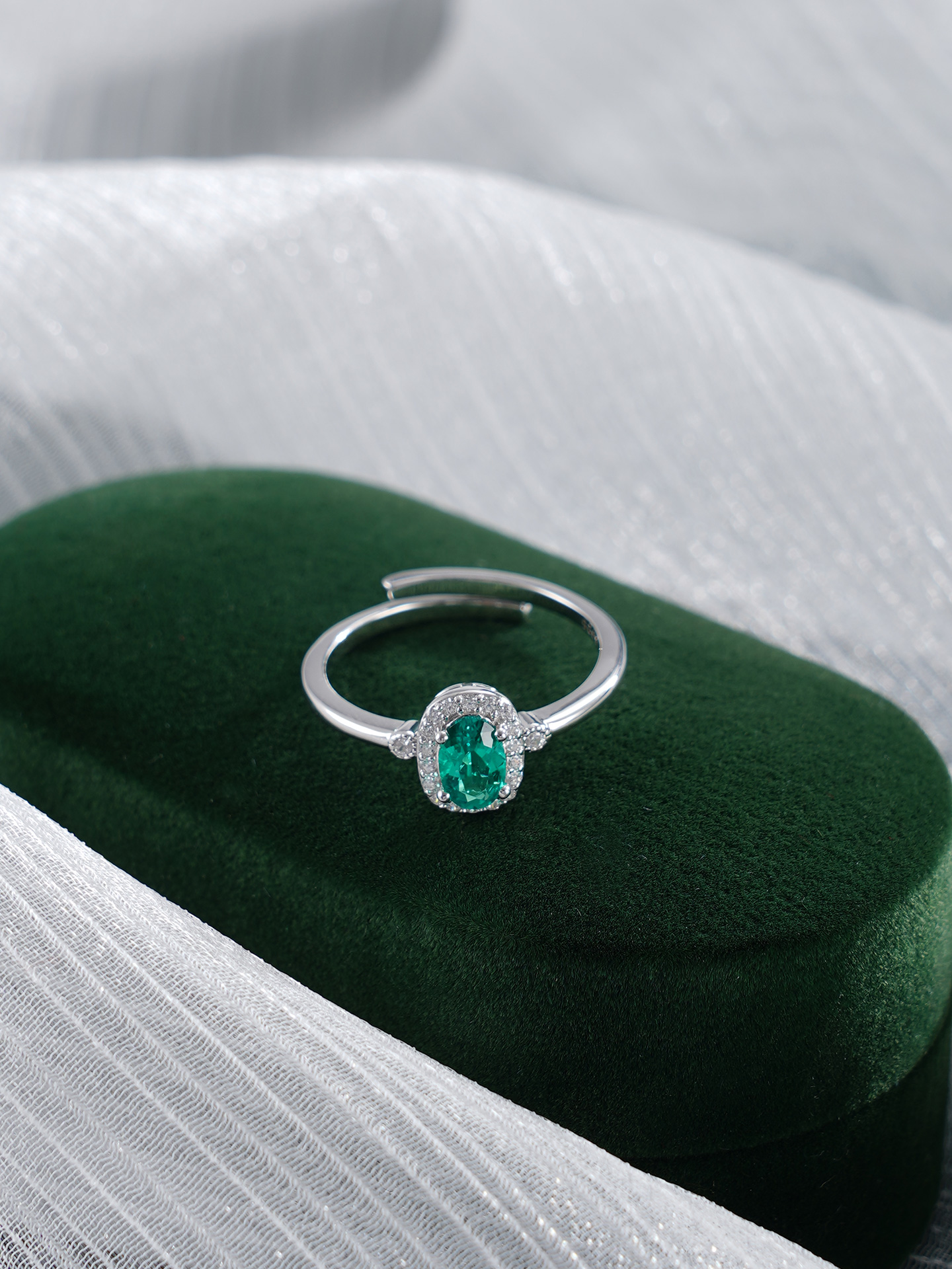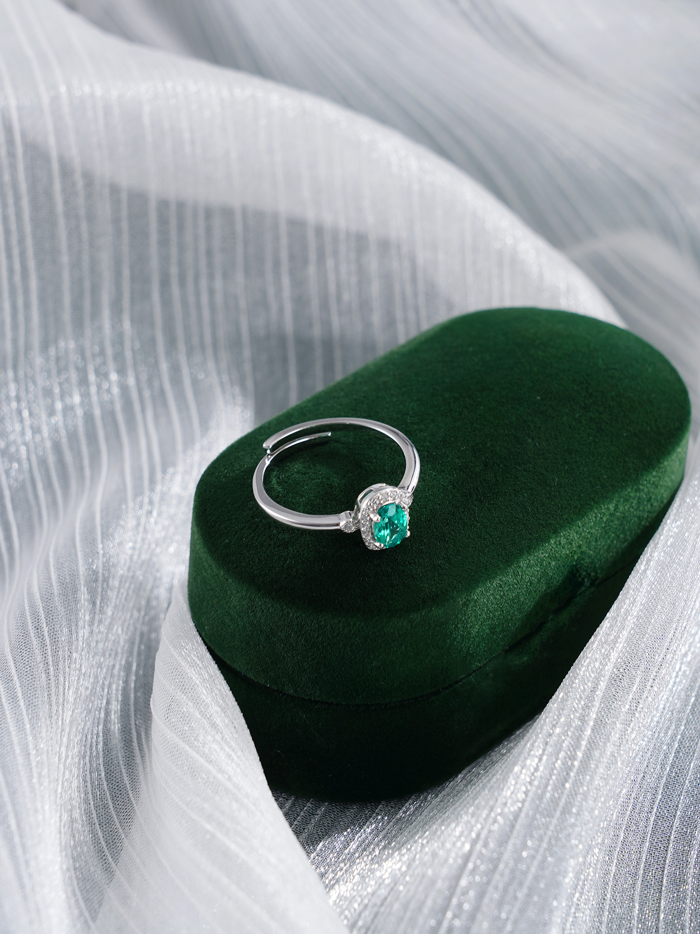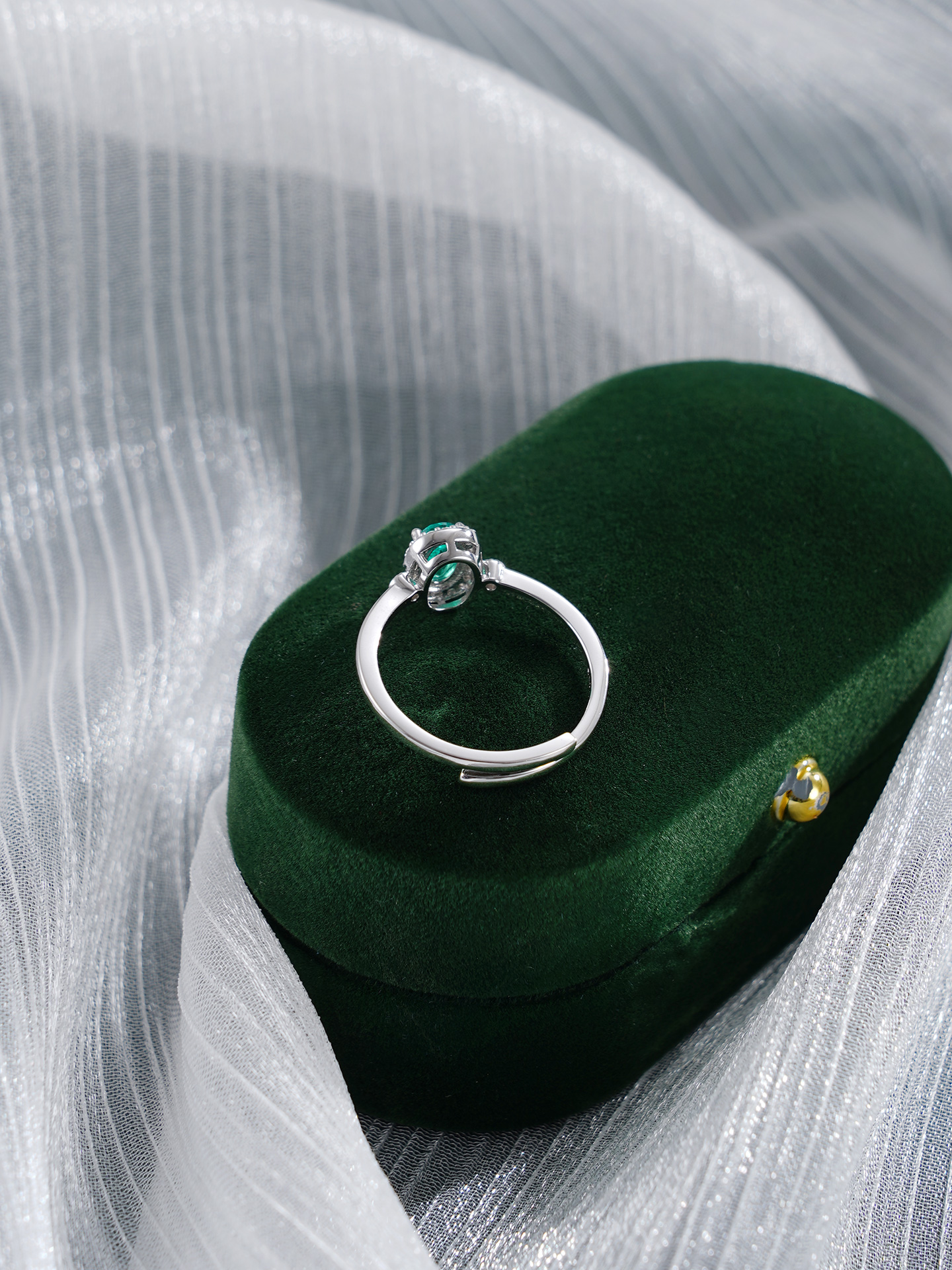 【寓意】:戒指采用极简设计,纯银戒托镶嵌青翠宝石,光影流转间演绎自然生长的力量感,寓意凝驻时光之韵,绽放优雅之美。