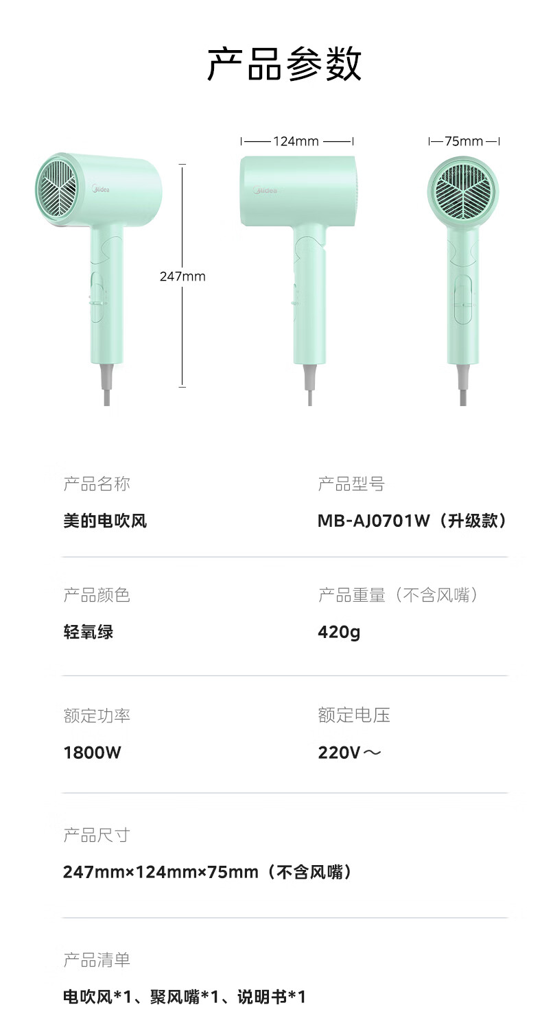 【分仓直发包邮】美的负离子吹风机MB-AJ0701