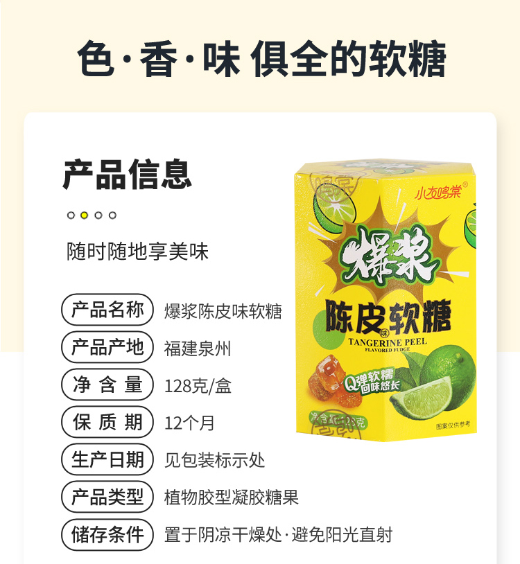 小友鸣棠爆浆陈皮软糖*2盒(128g/盒)生产日期: 11月