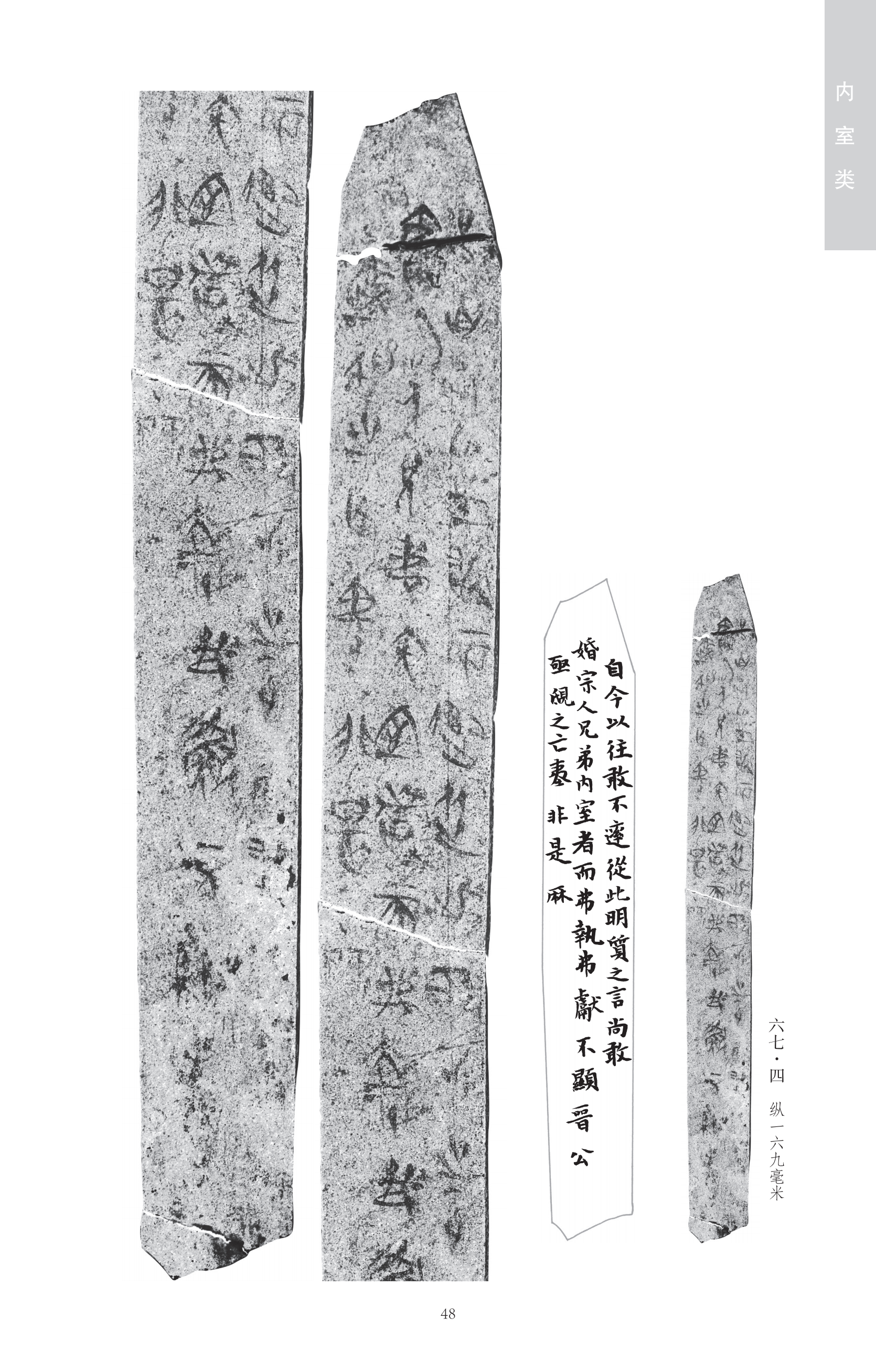 春秋时期盛行“盟誓”,“盟书”也称“载书”,一式两份,一份藏于盟府,一份埋于地下或沉入水中。侯马盟书是迄今所见中国古代最早用毛笔书写并且篇章完整的公文。内容主要有三大类:宗盟类,也称主盟类,指同姓同宗的人举行盟誓;委质类,也称委誓类,是把自己抵押给某个人,一生永不背叛;内室类,“内”同“纳”,“室”包括人口和财产,内室就是把别人的“室”夺取过来归为己有,参盟人自己不“纳室”,也要反对和声讨宗族兄弟们中间的这种行为,否则甘愿接受诛灭的制裁。一九七六年文物岀版社出版的《侯马盟书》,临摹发表六五六件,考订盟誓时间为公元前四九六年前后,主盟人晋国卿大夫赵鞅在索取“卫贡五百家”的事件中,为团结宗族,打击赵尼等政敌而举行盟誓活动。