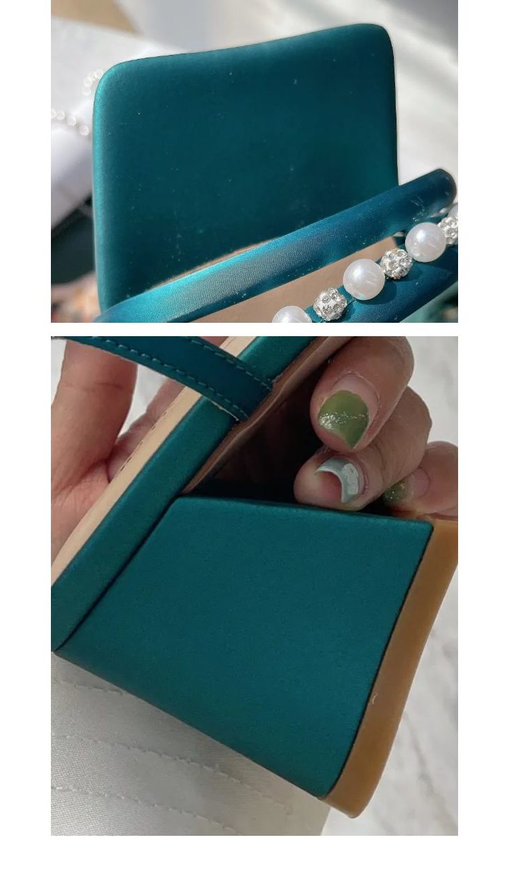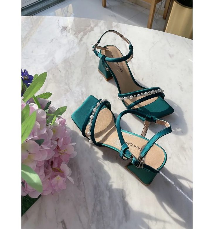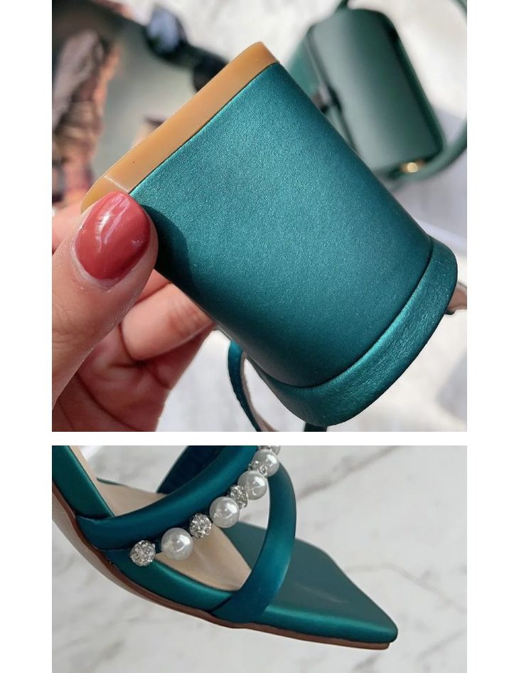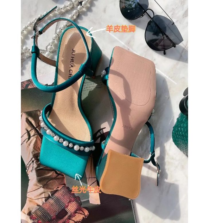 【断码特惠不退换】花花品质生活-花痴力荐|yi线品牌代工厂定制款 -孔雀蓝丝绸牛皮一字珍珠凉鞋