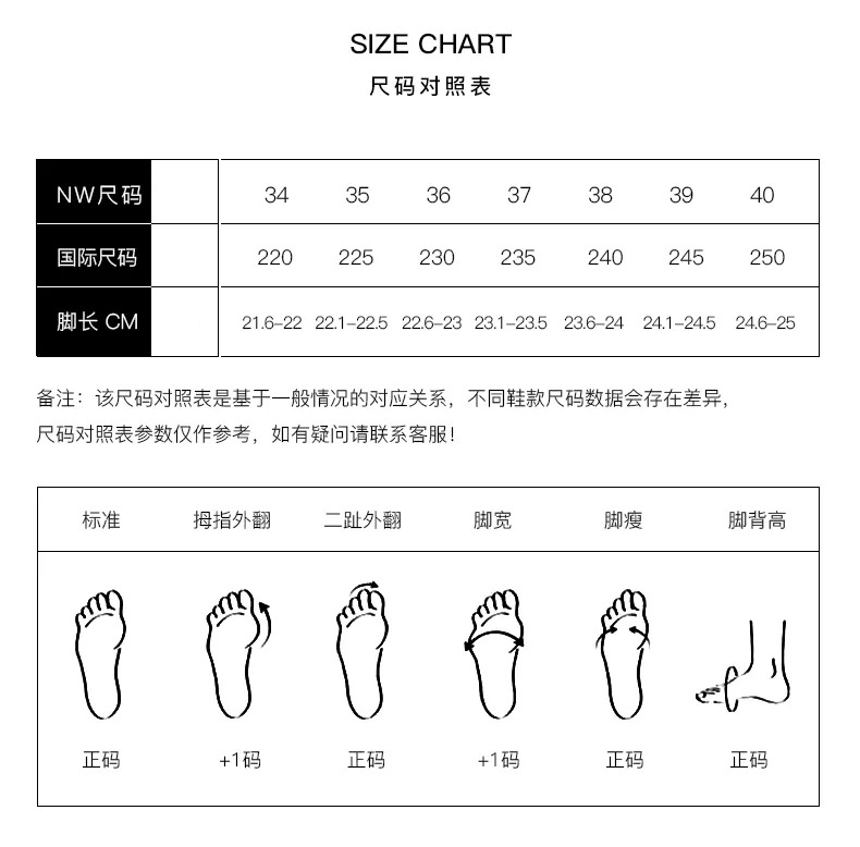 而且鞋子会越穿越宽松,不建议选大一码,除了脚背特宽/大脚趾跖骨突出很宽 建议选择大一号。其他的建议按照正常高跟鞋尺码选择即可。
