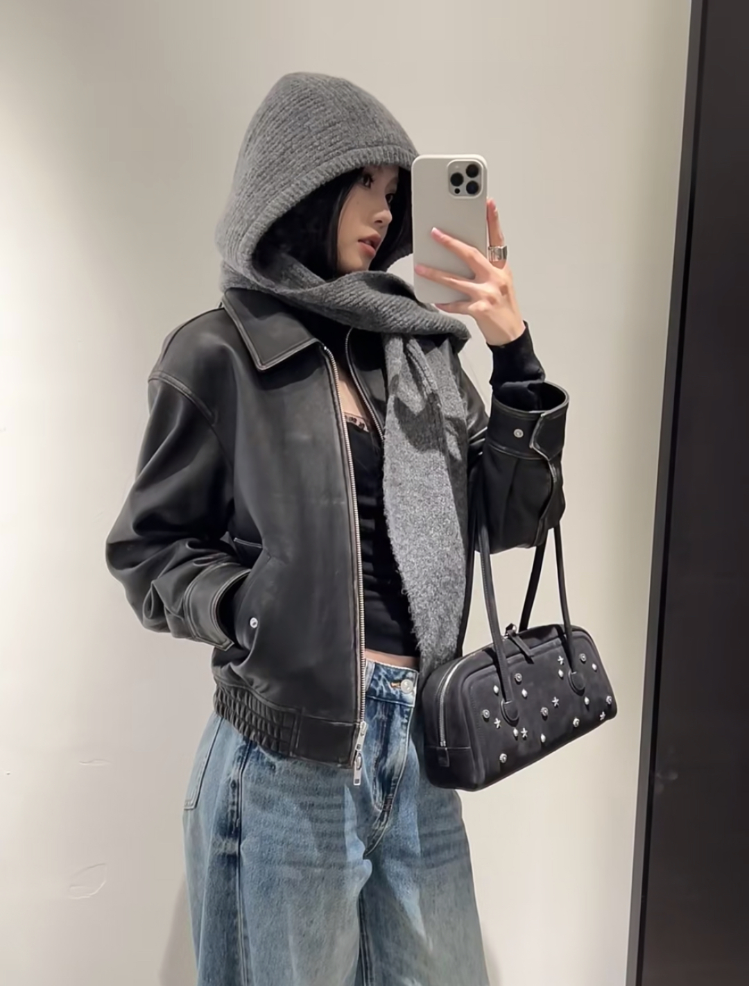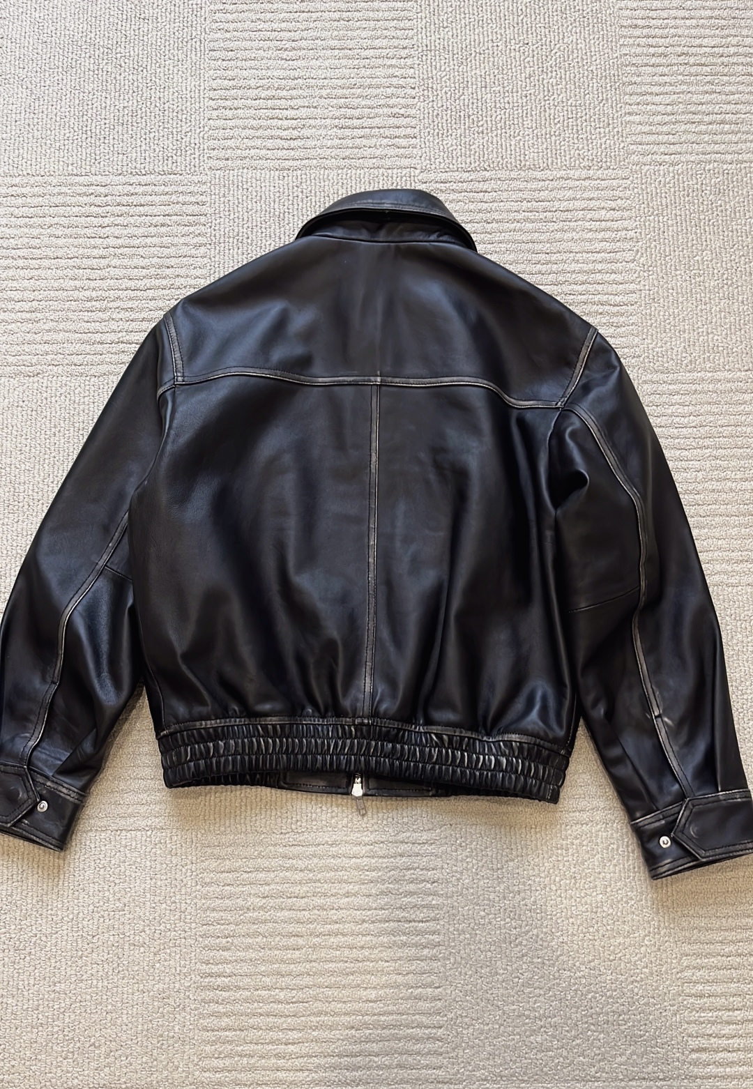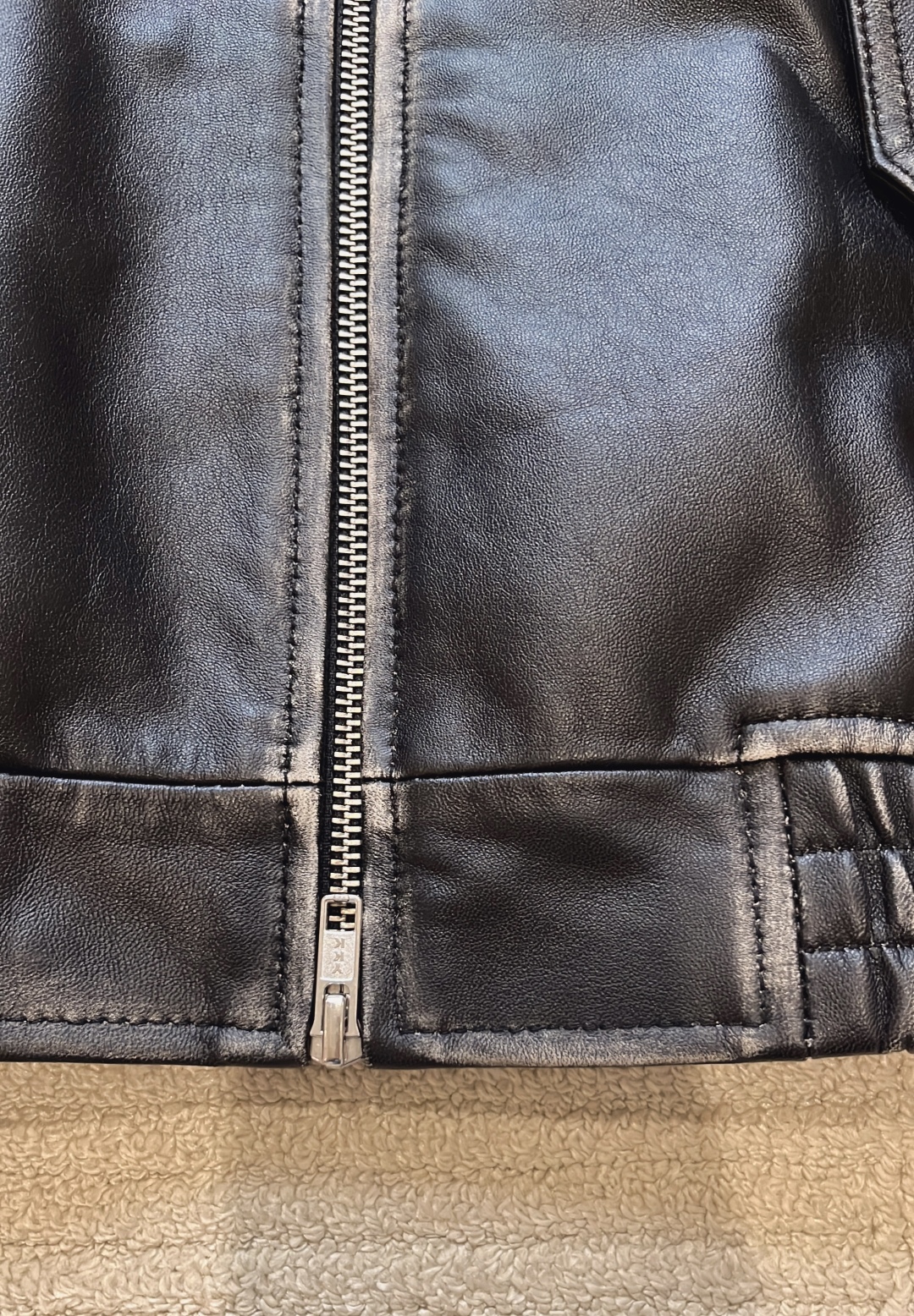 你们看做旧工艺复古时尚,合身版型,小个子客户很好穿,翻领➕松紧下摆,复古做旧的擦色太美了!皮质整件非常挺括,但是摸上去却是很细腻很软的手感,整体是纯哑光的,质感很好,颜色是很深的棕褐色,不是黑色哈