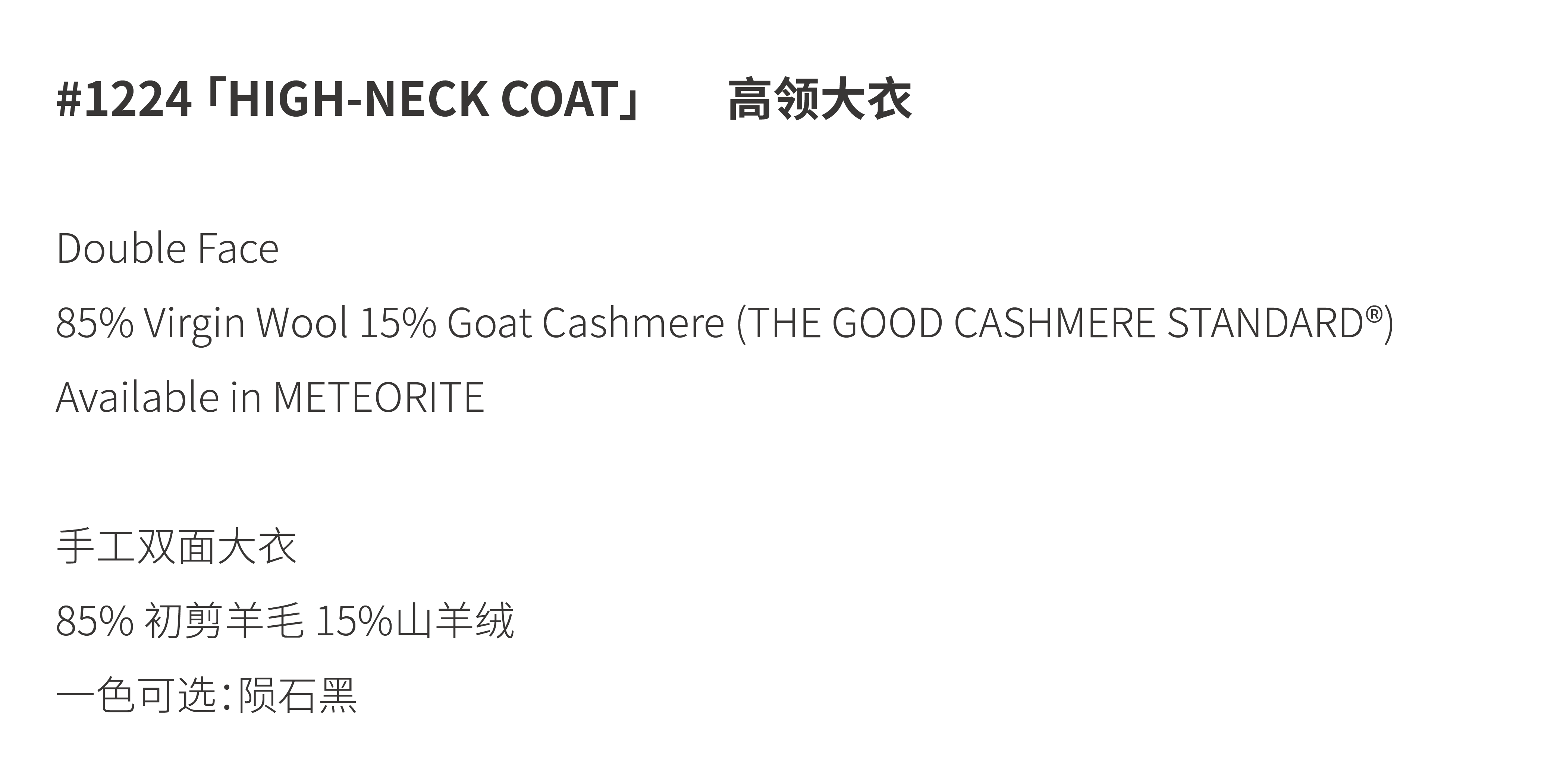 #1224「HIGH-NECK COAT」85% WOOL 15% CASHMERE 高领大衣