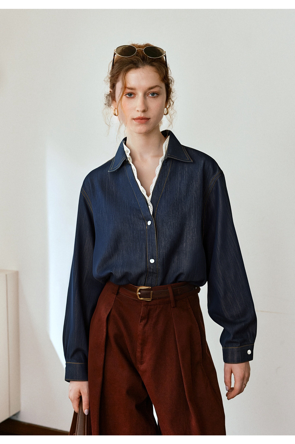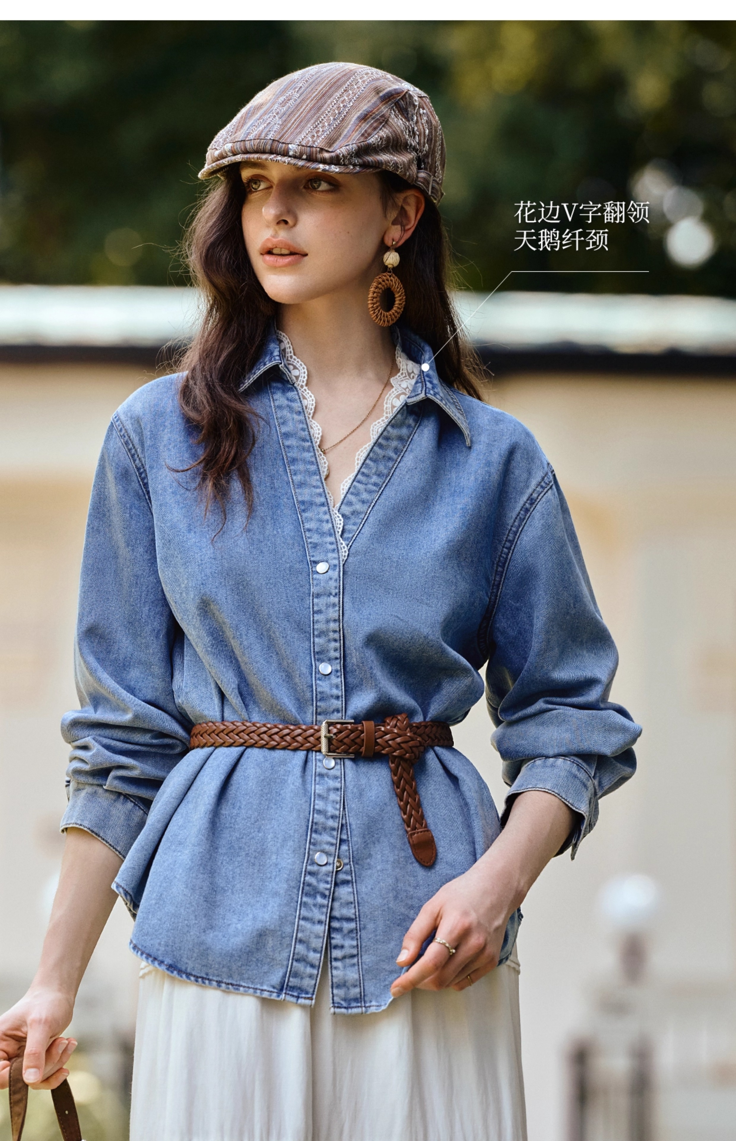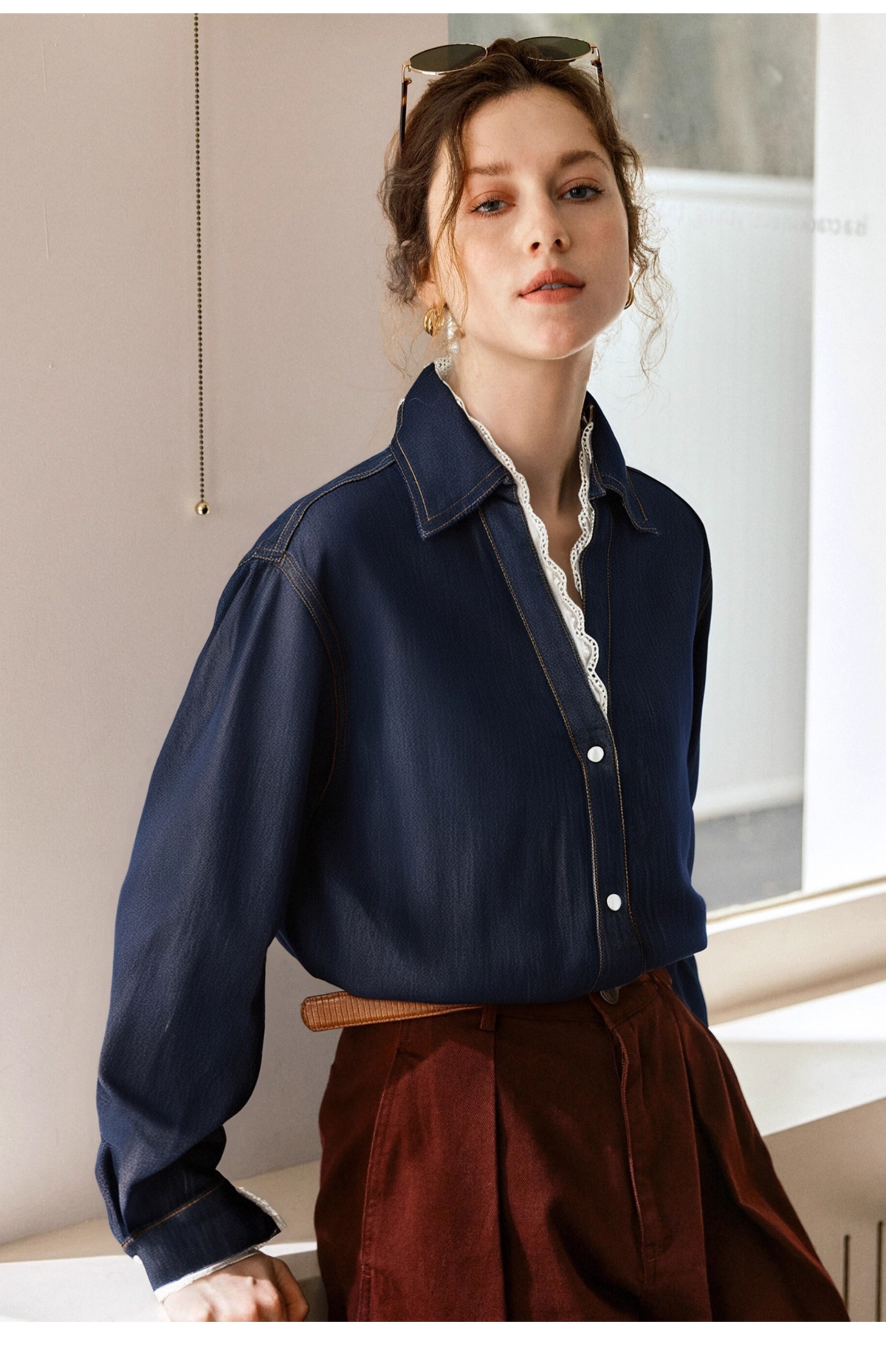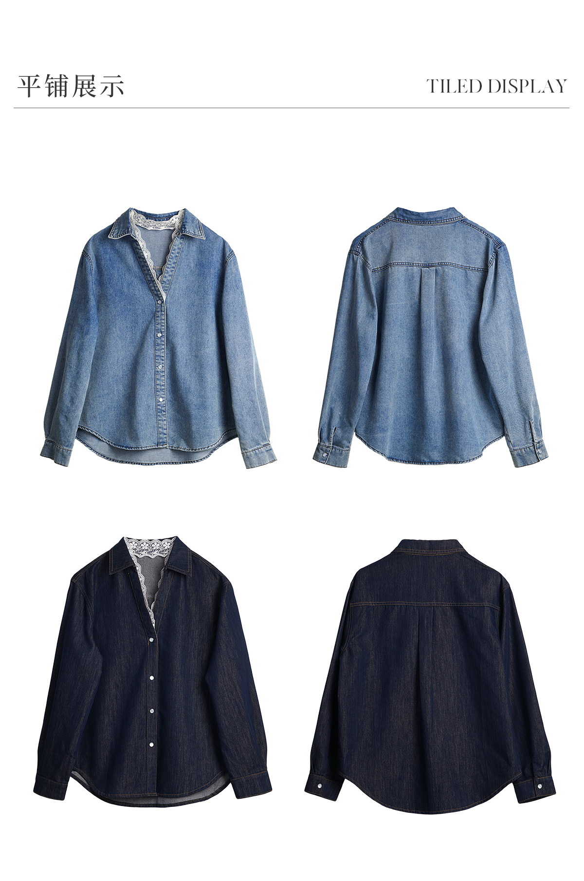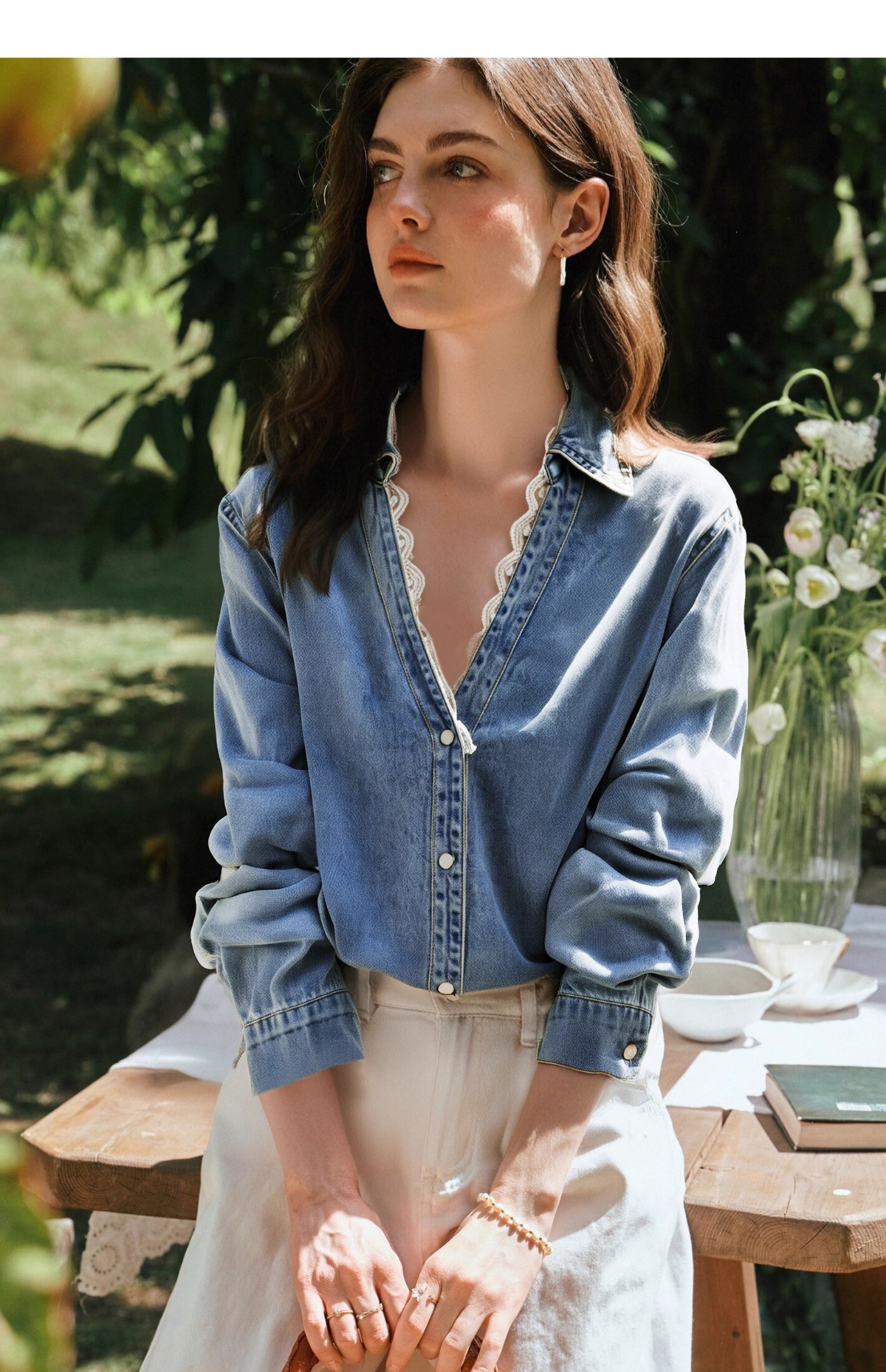 OLrain欧芮儿法式蓝色牛仔衬衫2025秋季新款翻领拼接花边上衣