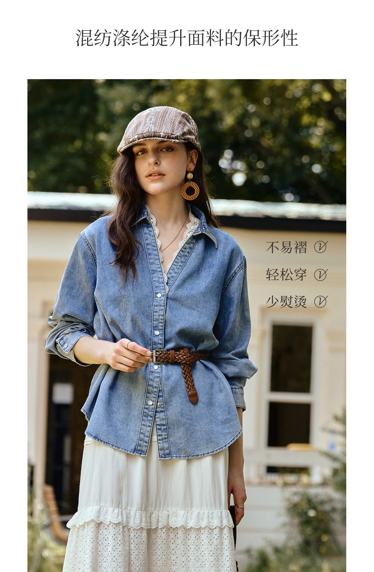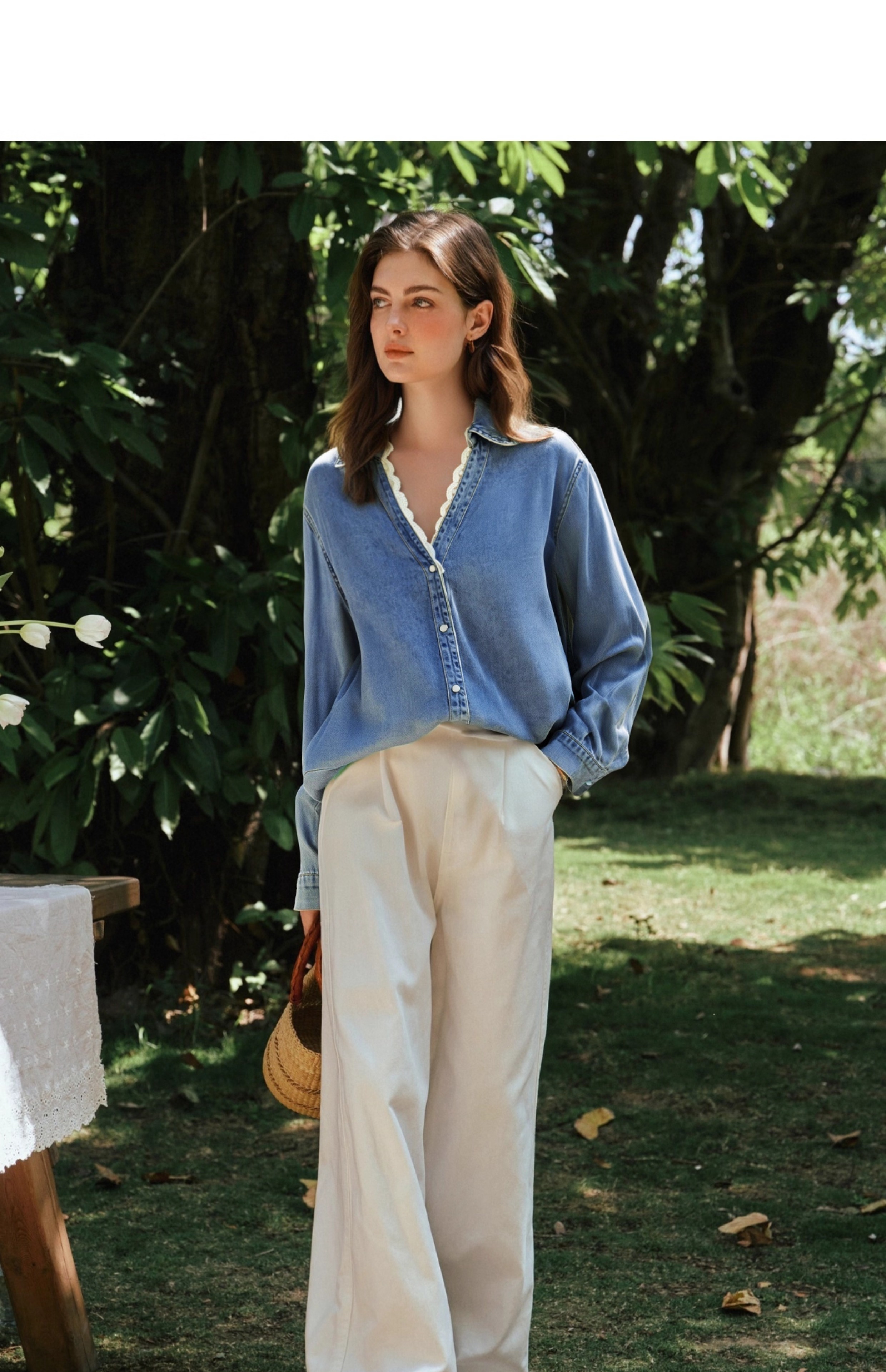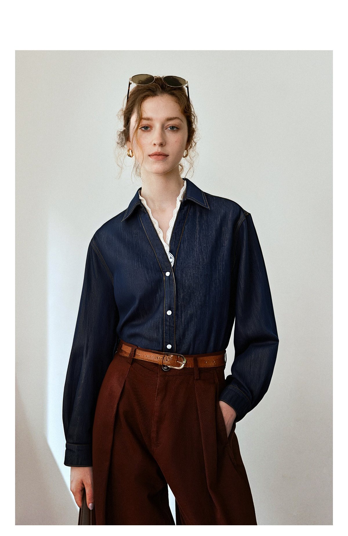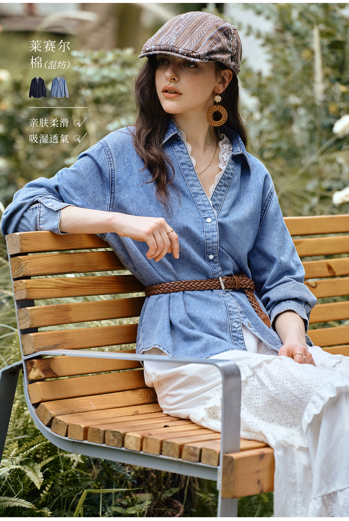 OLrain欧芮儿法式蓝色牛仔衬衫2025秋季新款翻领拼接花边上衣