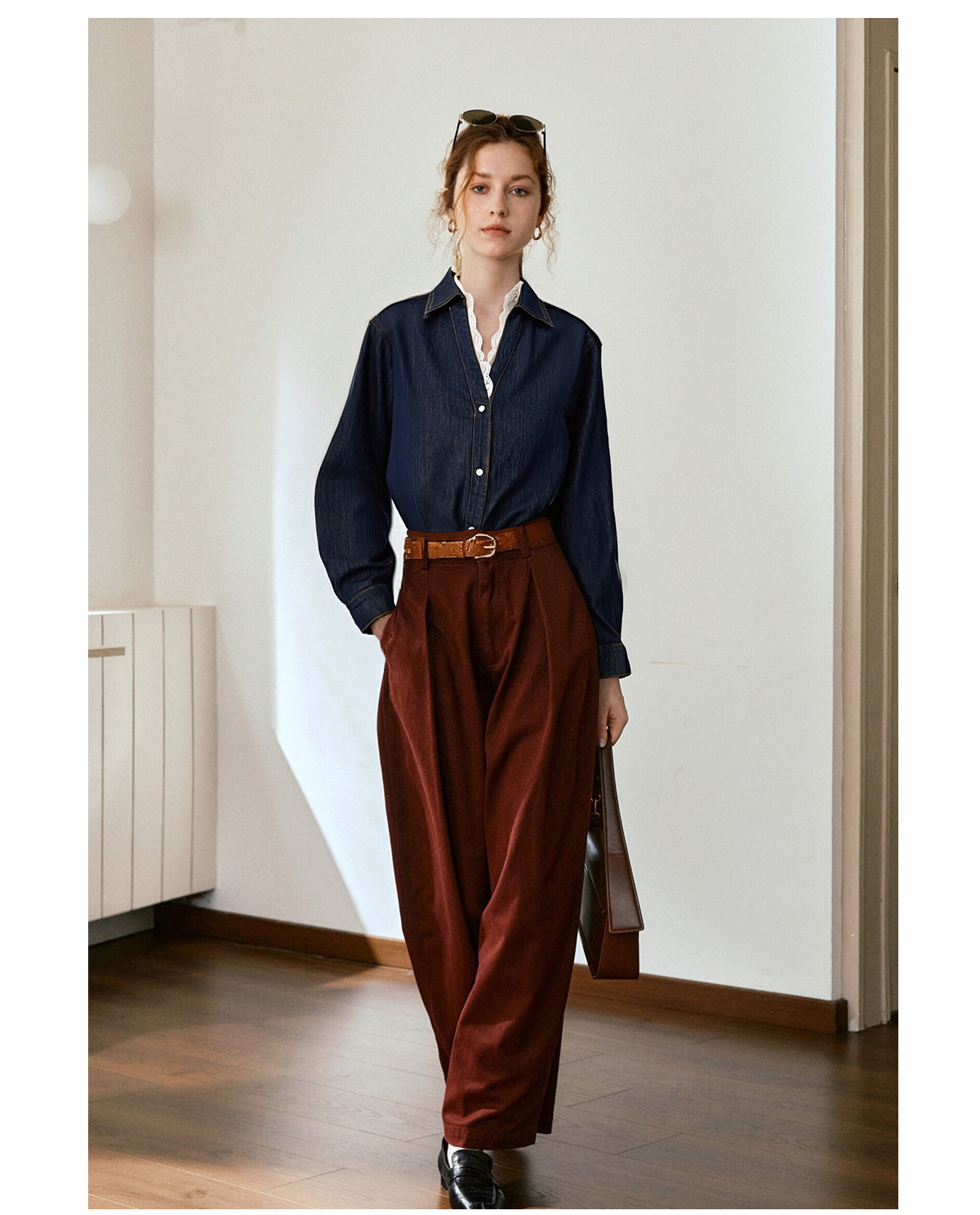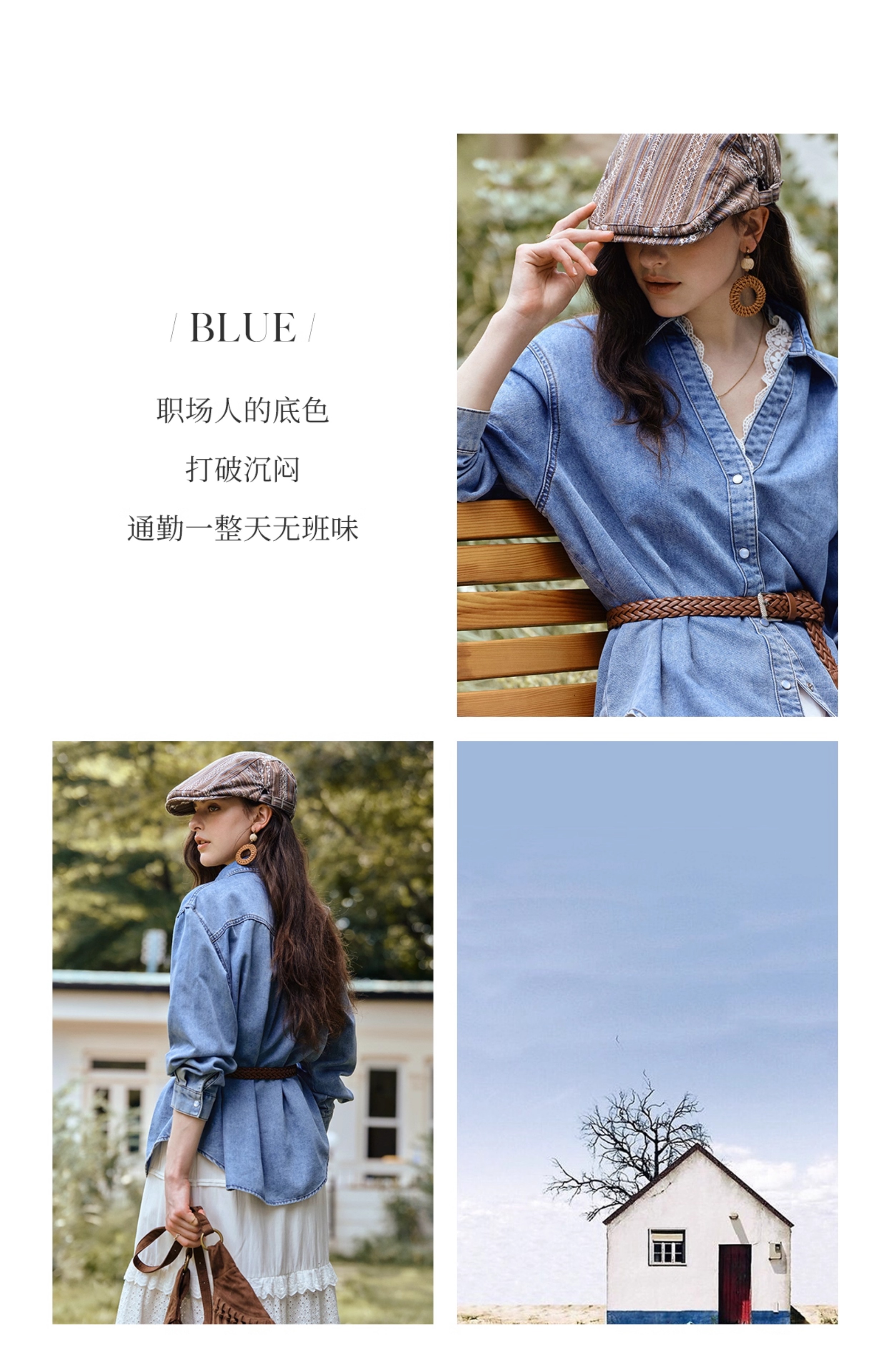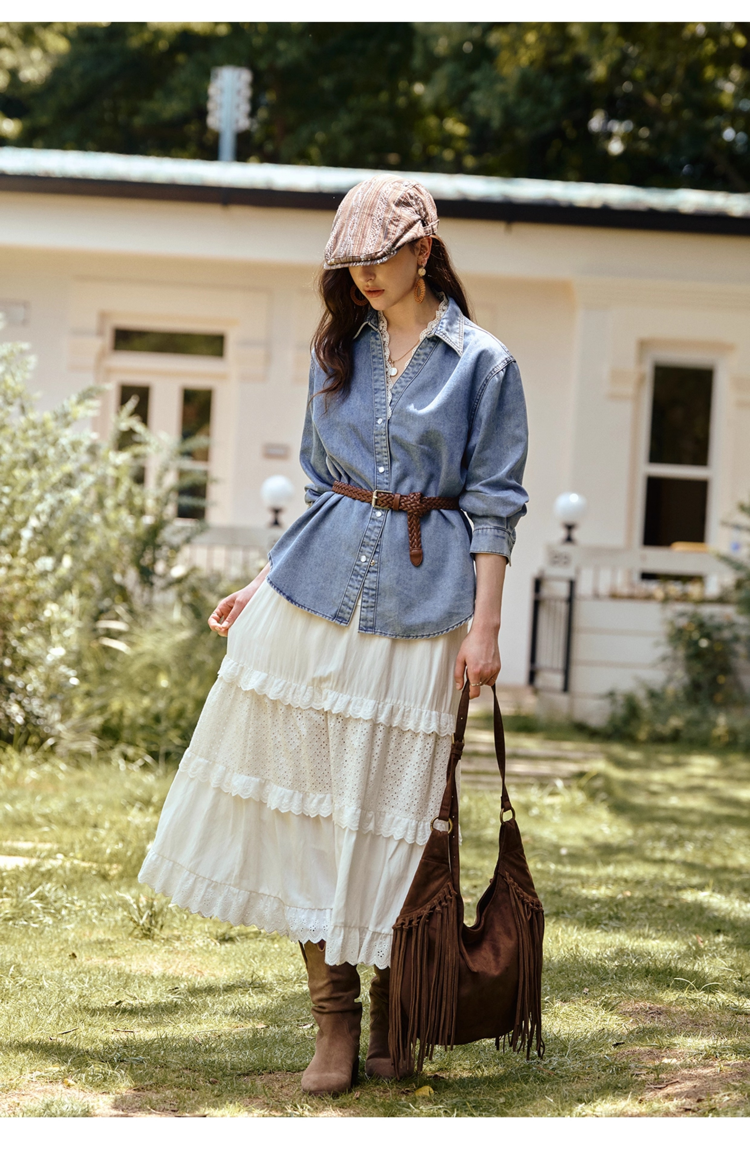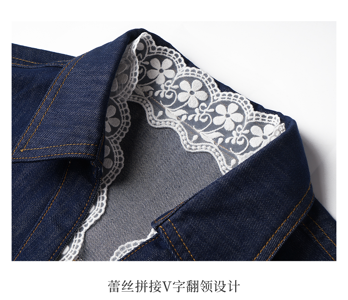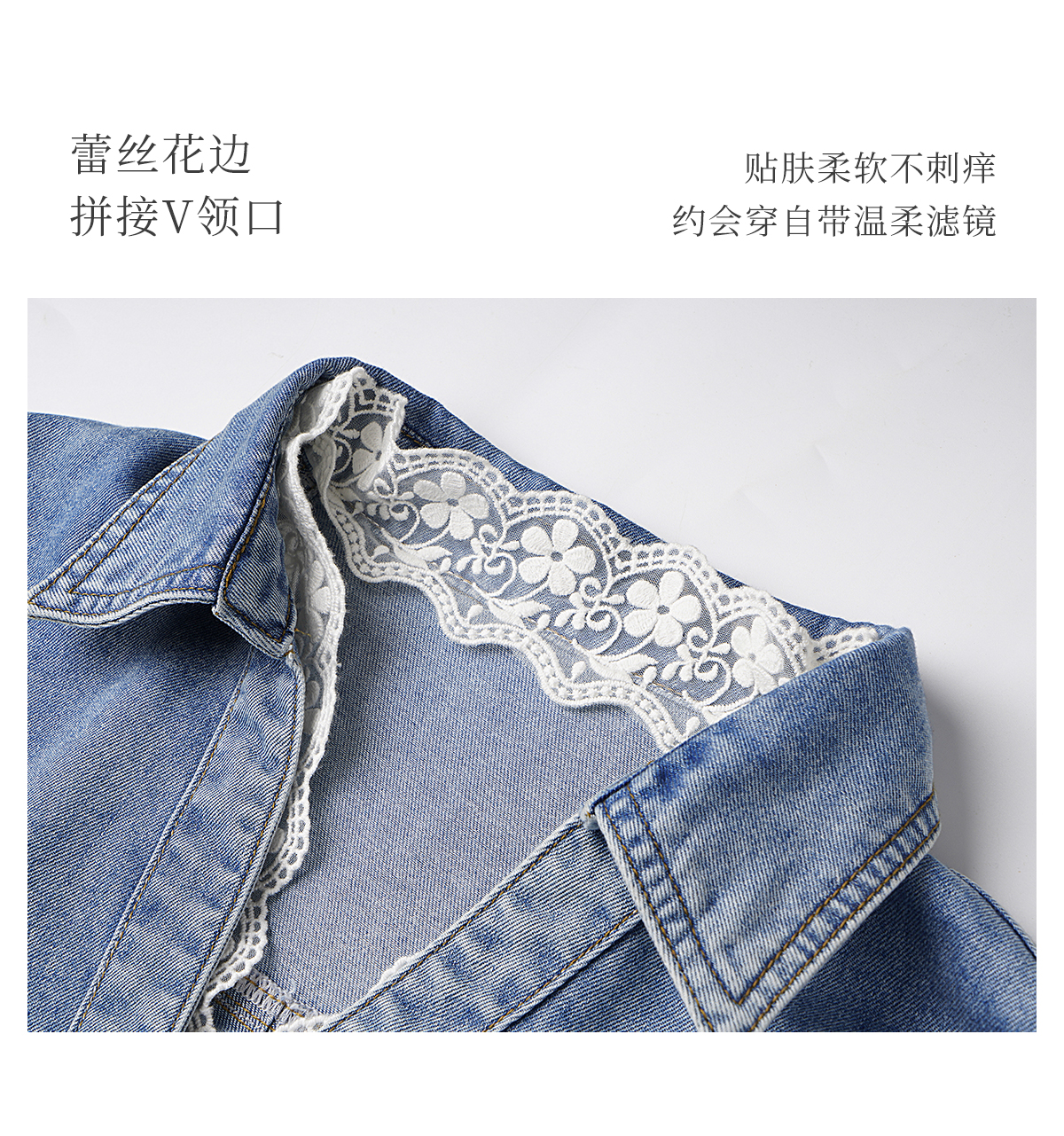 OLrain欧芮儿法式蓝色牛仔衬衫2025秋季新款翻领拼接花边上衣