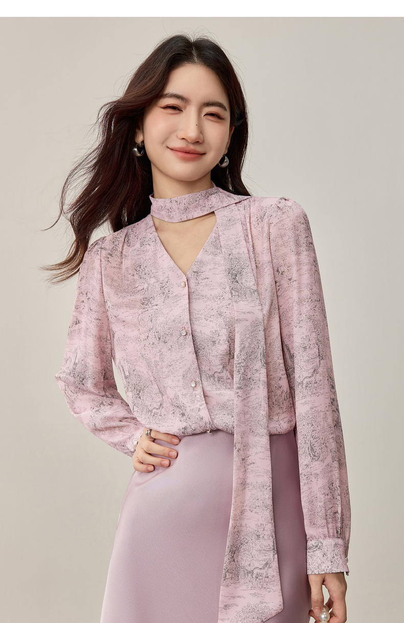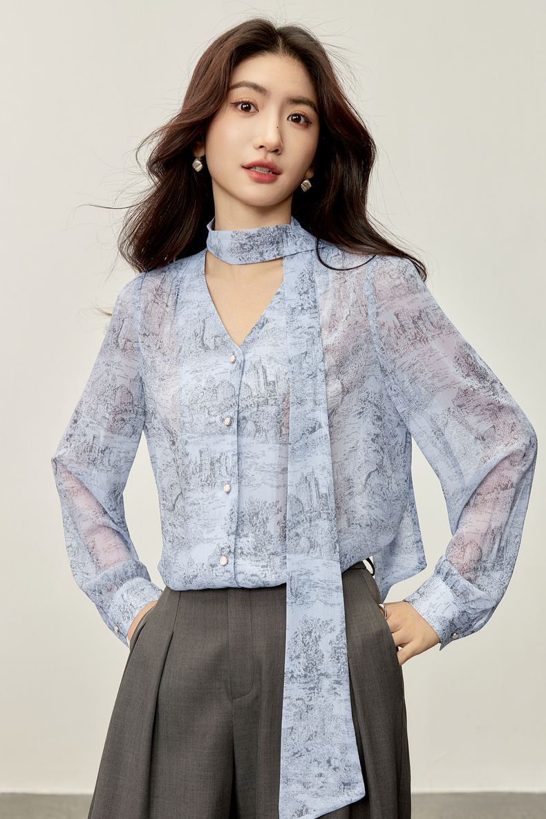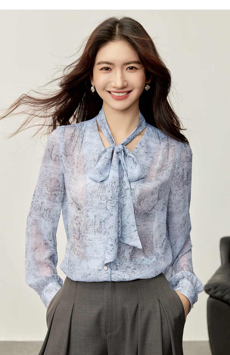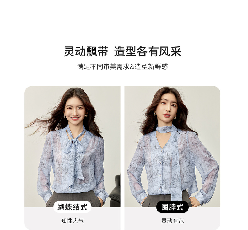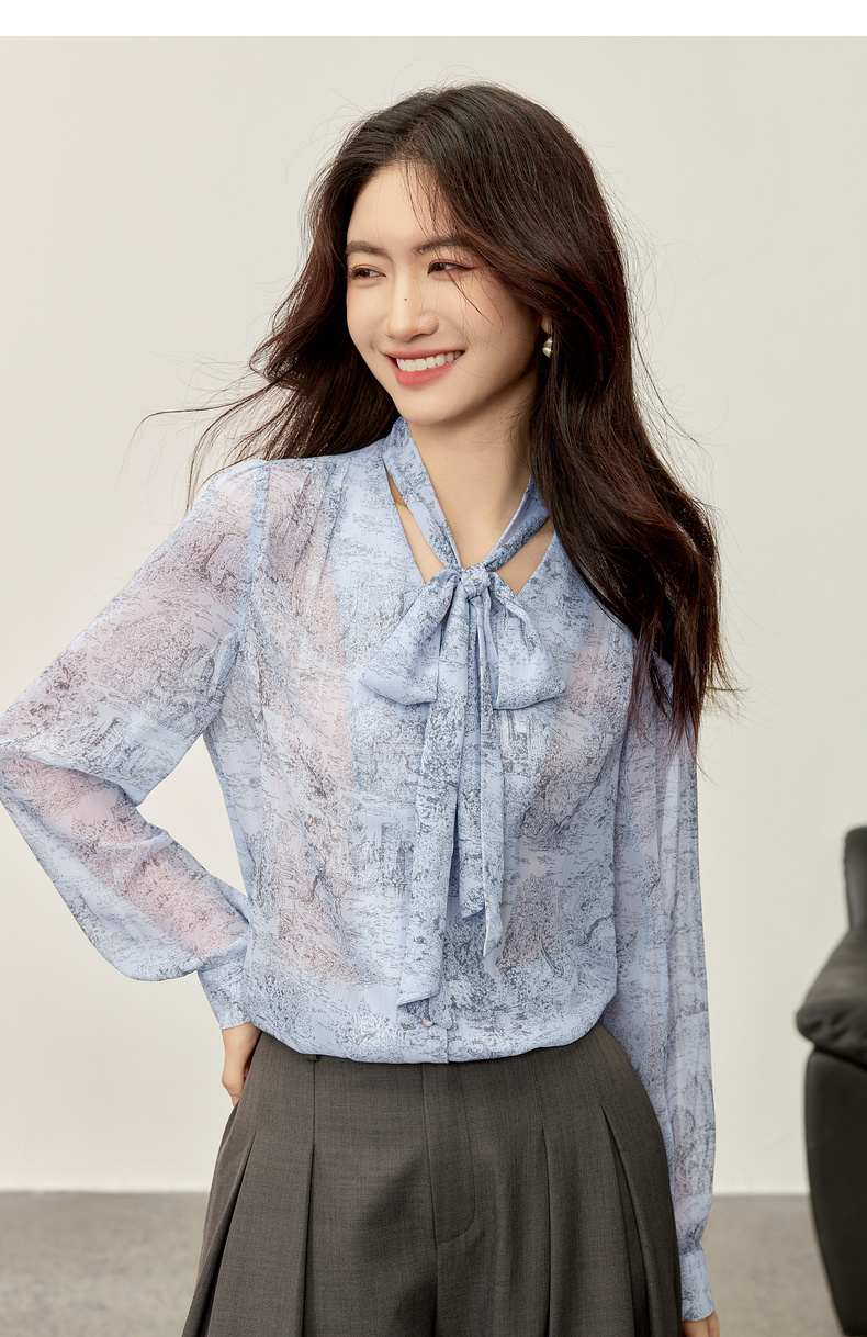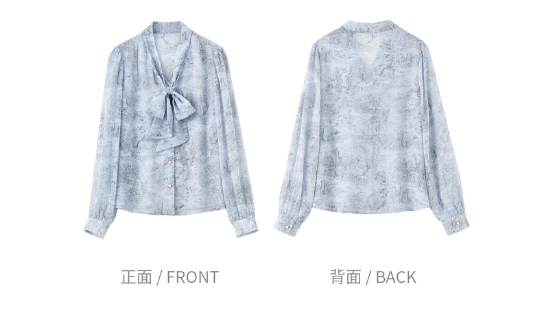 【内购】【灵动飘带】气质通勤系带V领金属珠扣宽松显瘦微透长袖雪纺衫-153VC2613