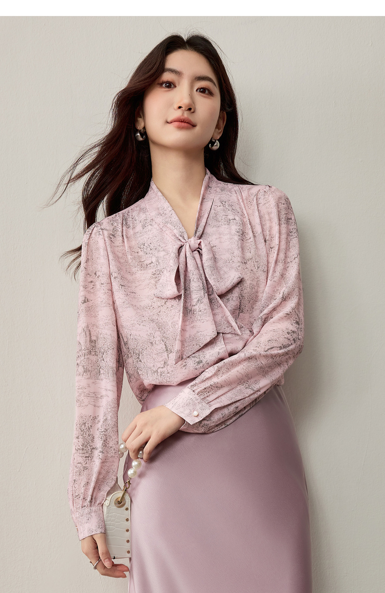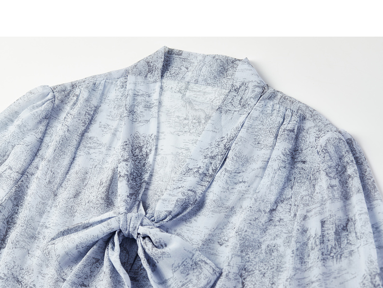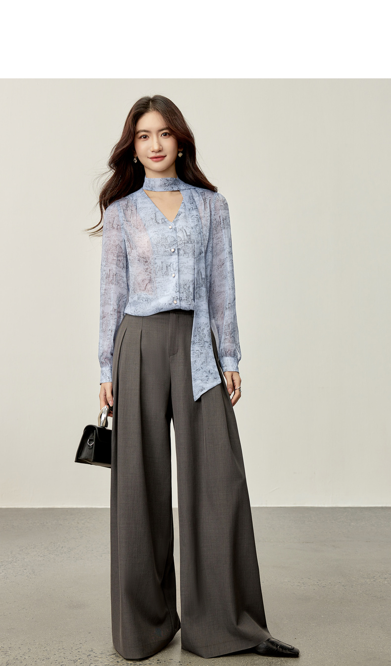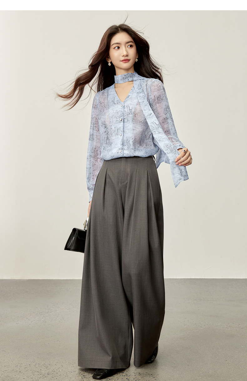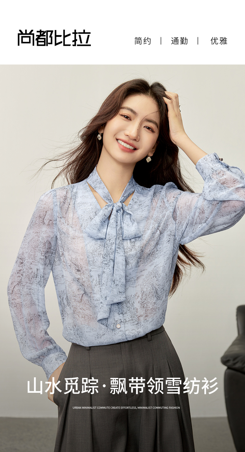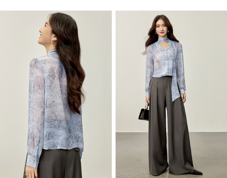 【内购】【灵动飘带】气质通勤系带V领金属珠扣宽松显瘦微透长袖雪纺衫-153VC2613
