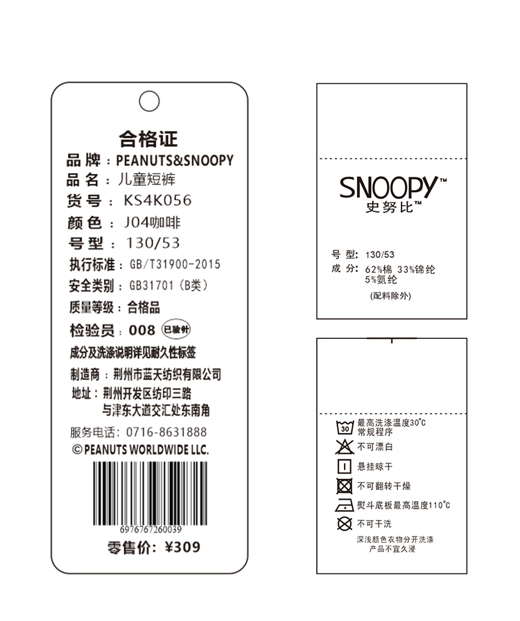 【130-160】【史努比】中大童运动简约百搭短裤