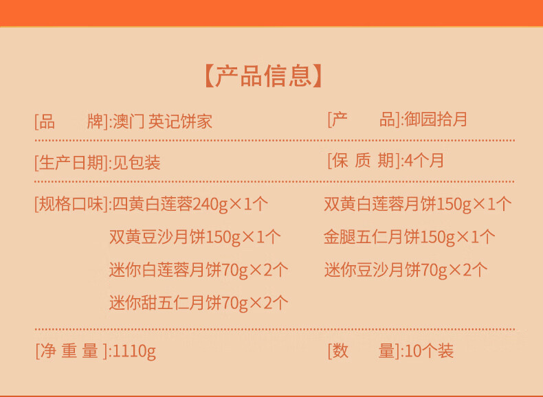 【一件包邮】澳门英记御园拾月月饼1.11kg 七种口味组合款款美味 甘肃/青海/内蒙古/新疆/西藏/宁夏/海南/港澳台不发货