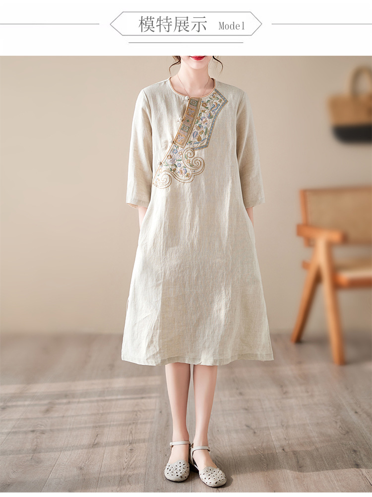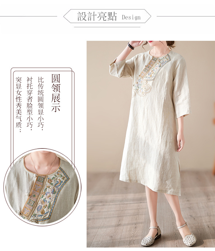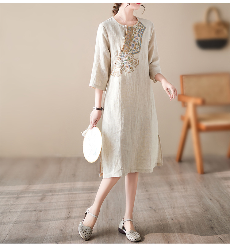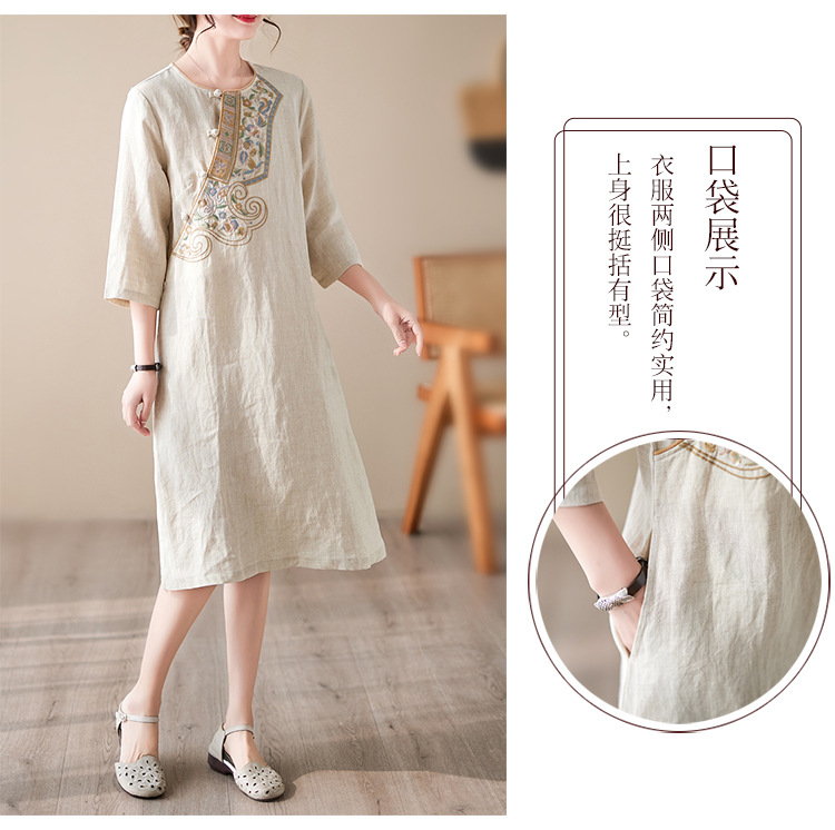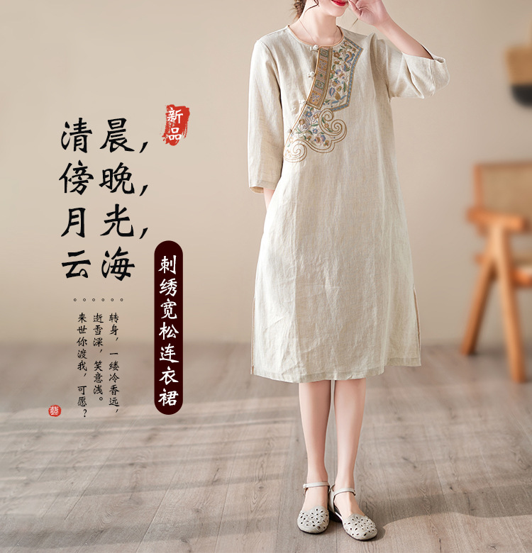 中国风棉麻连衣裙复古盘扣刺绣花中式茶服中长裙SJ-9261