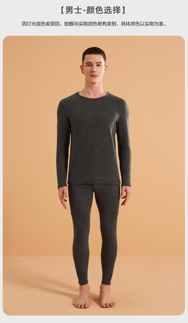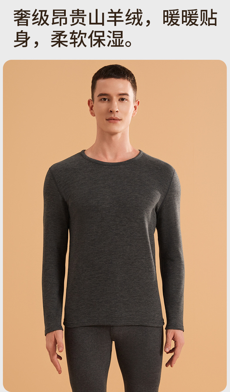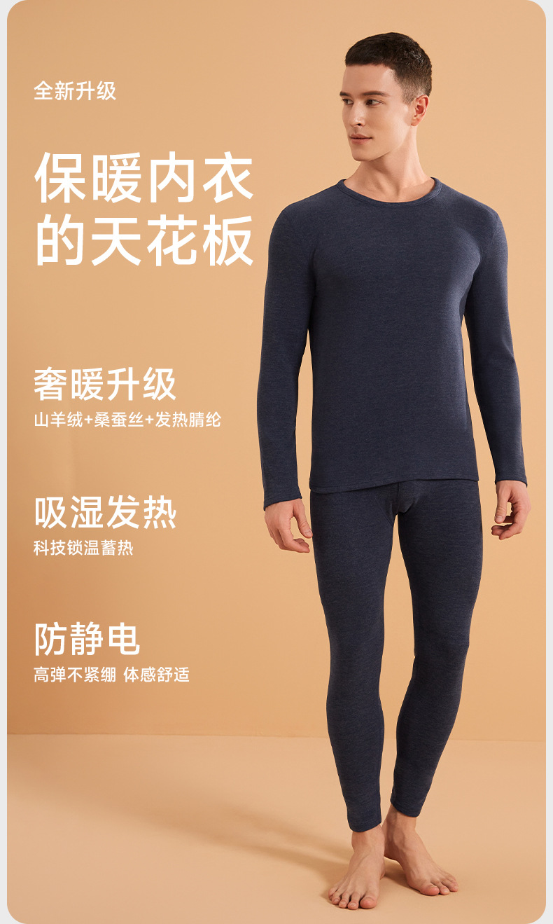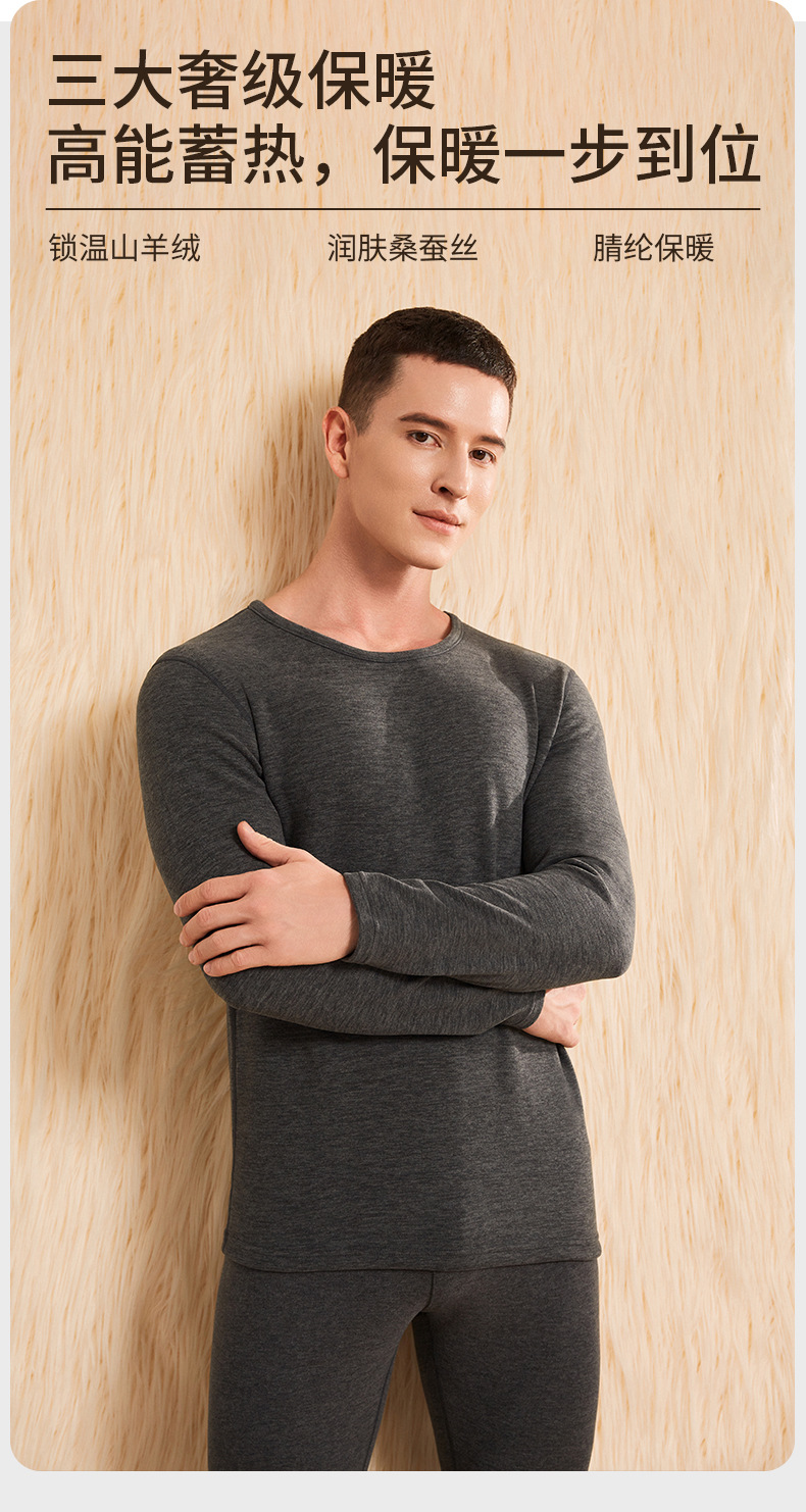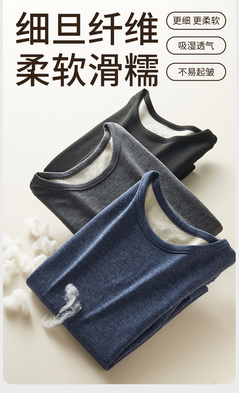 山羊绒蚕丝德绒保暖内衣 圆领加绒新款7A抗菌羊绒蚕丝包边保暖内衣女 加绒男士秋衣秋裤套装打底衫