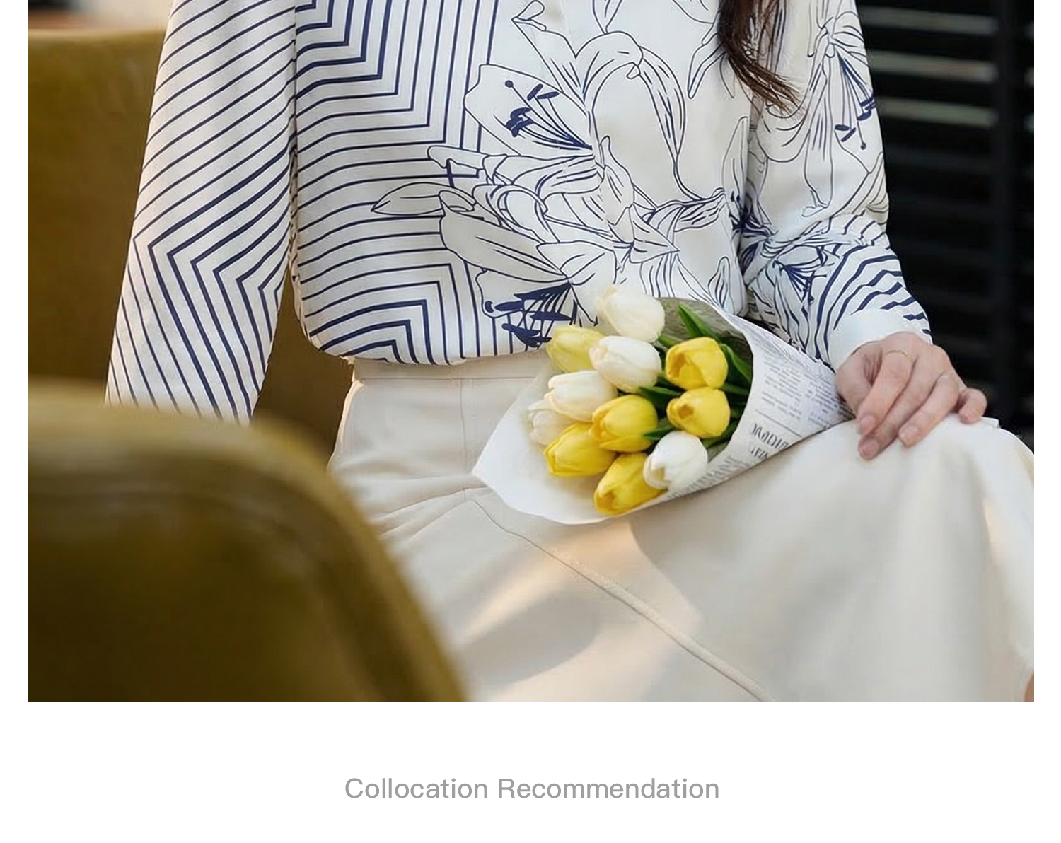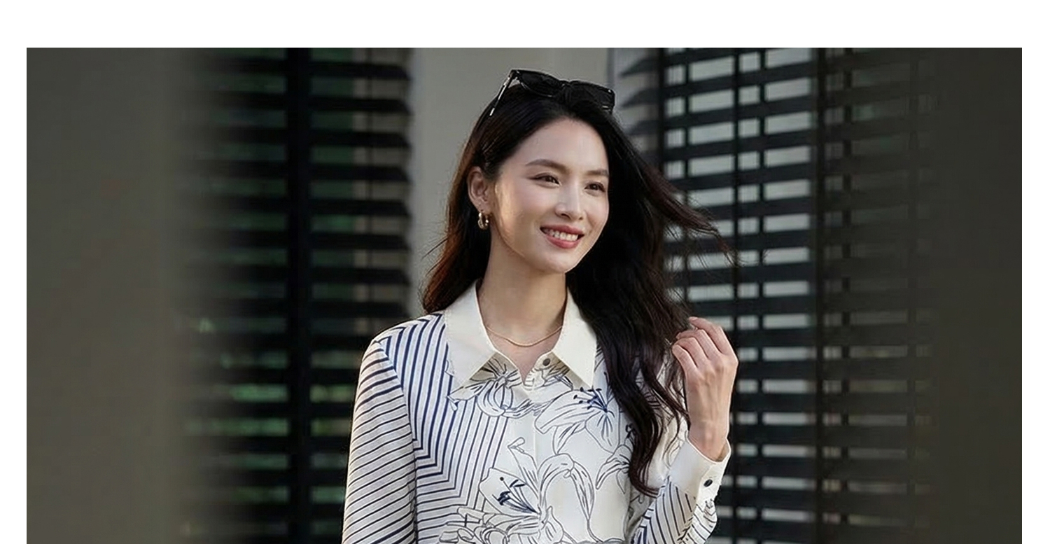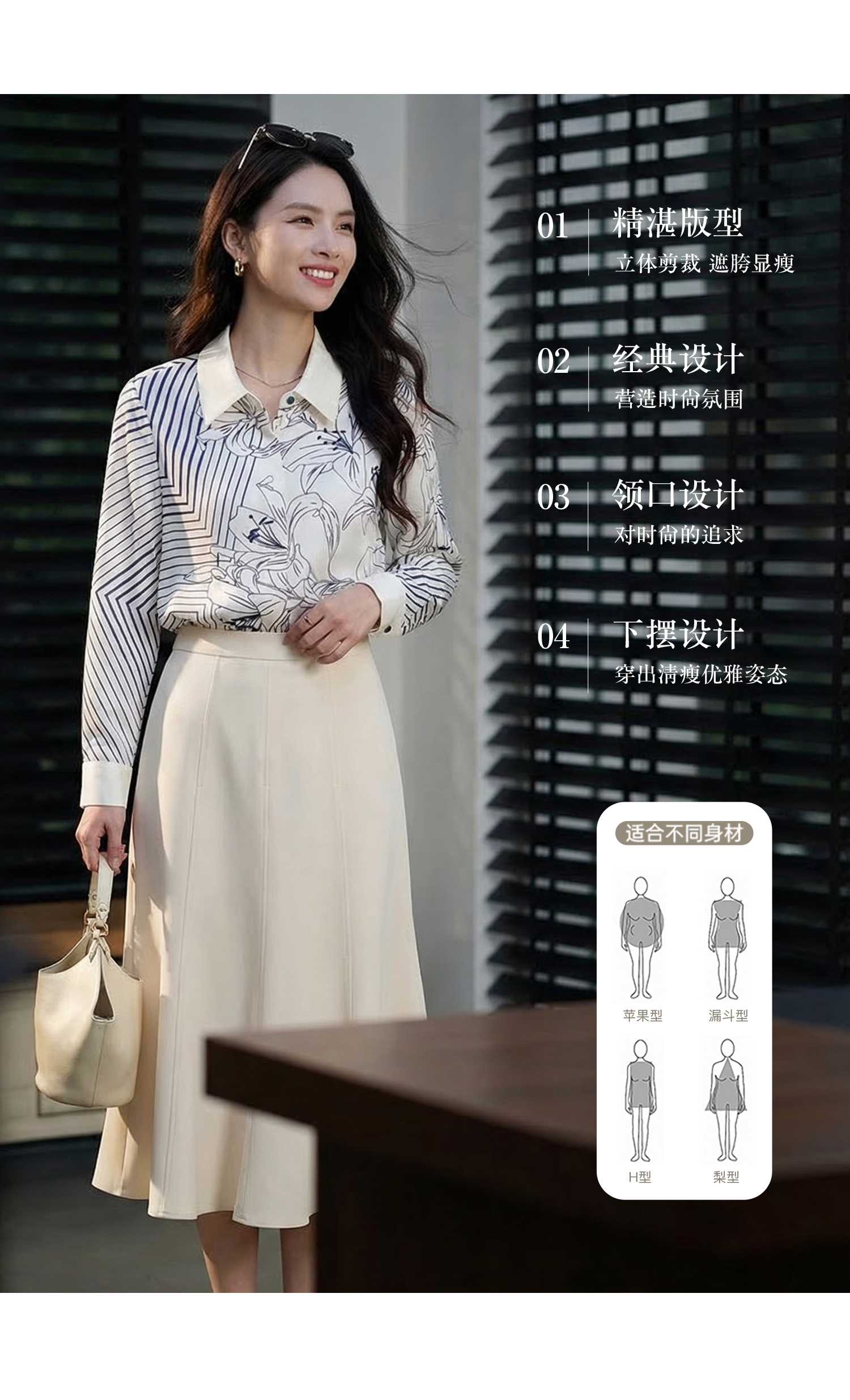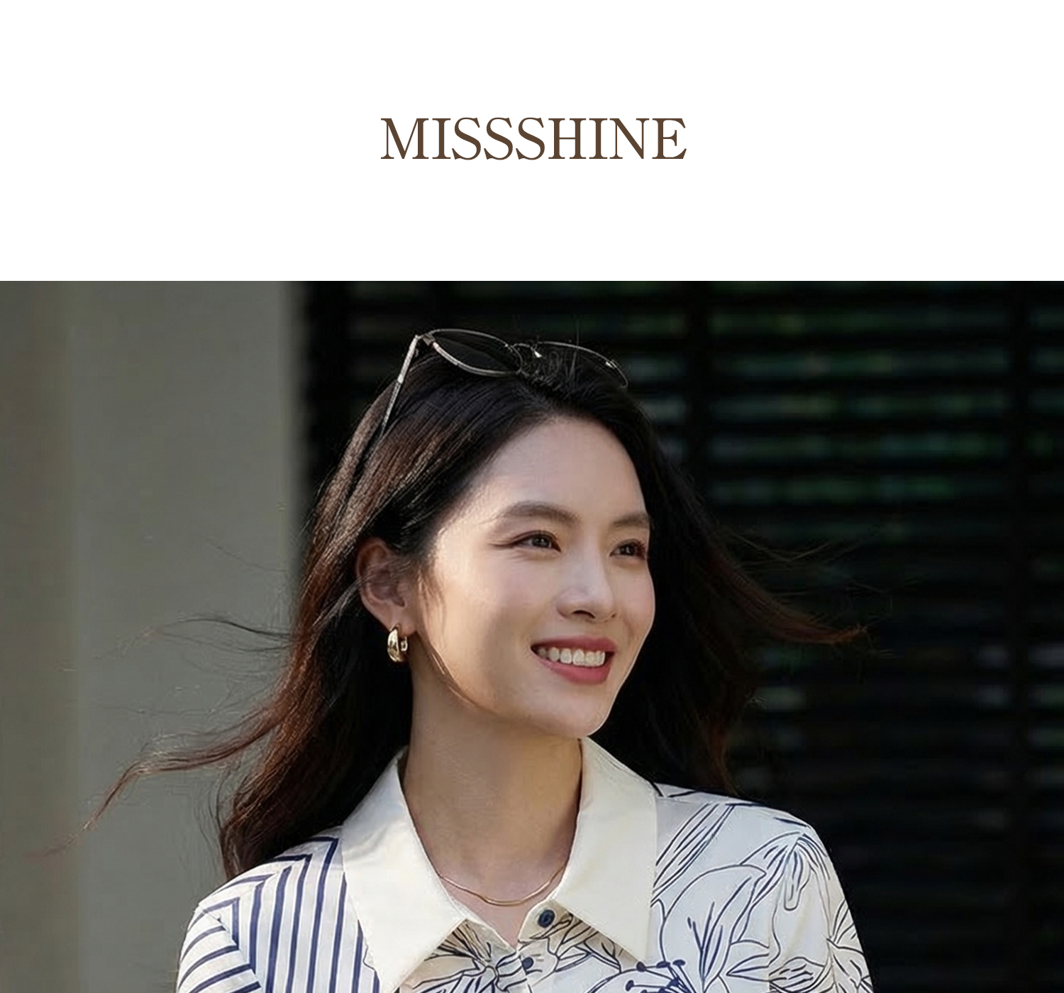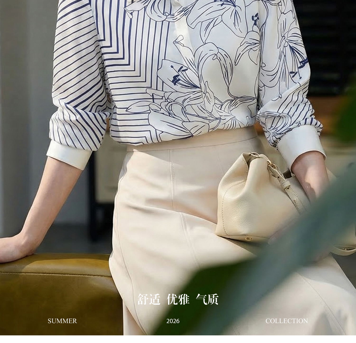 米思阳2026春季新品通勤OL满印抽象印花100%桑蚕丝艺术感衬衫领口拼接上衣女1177