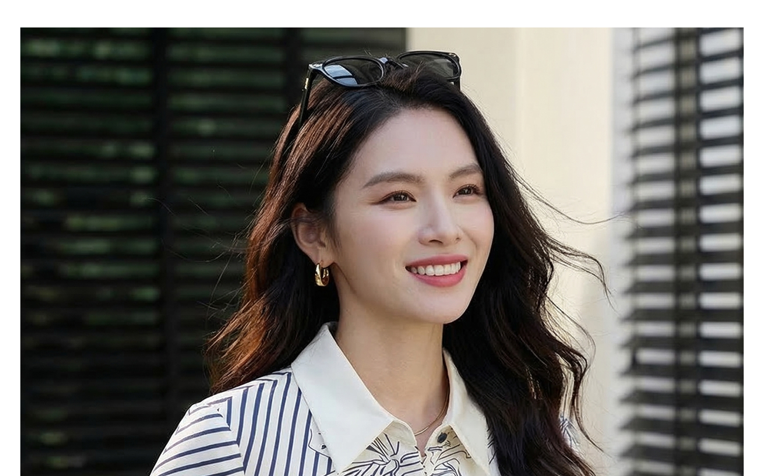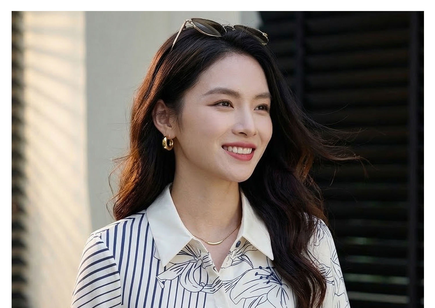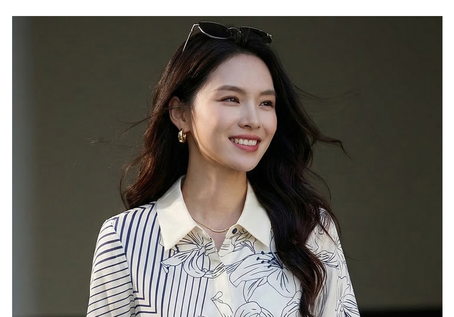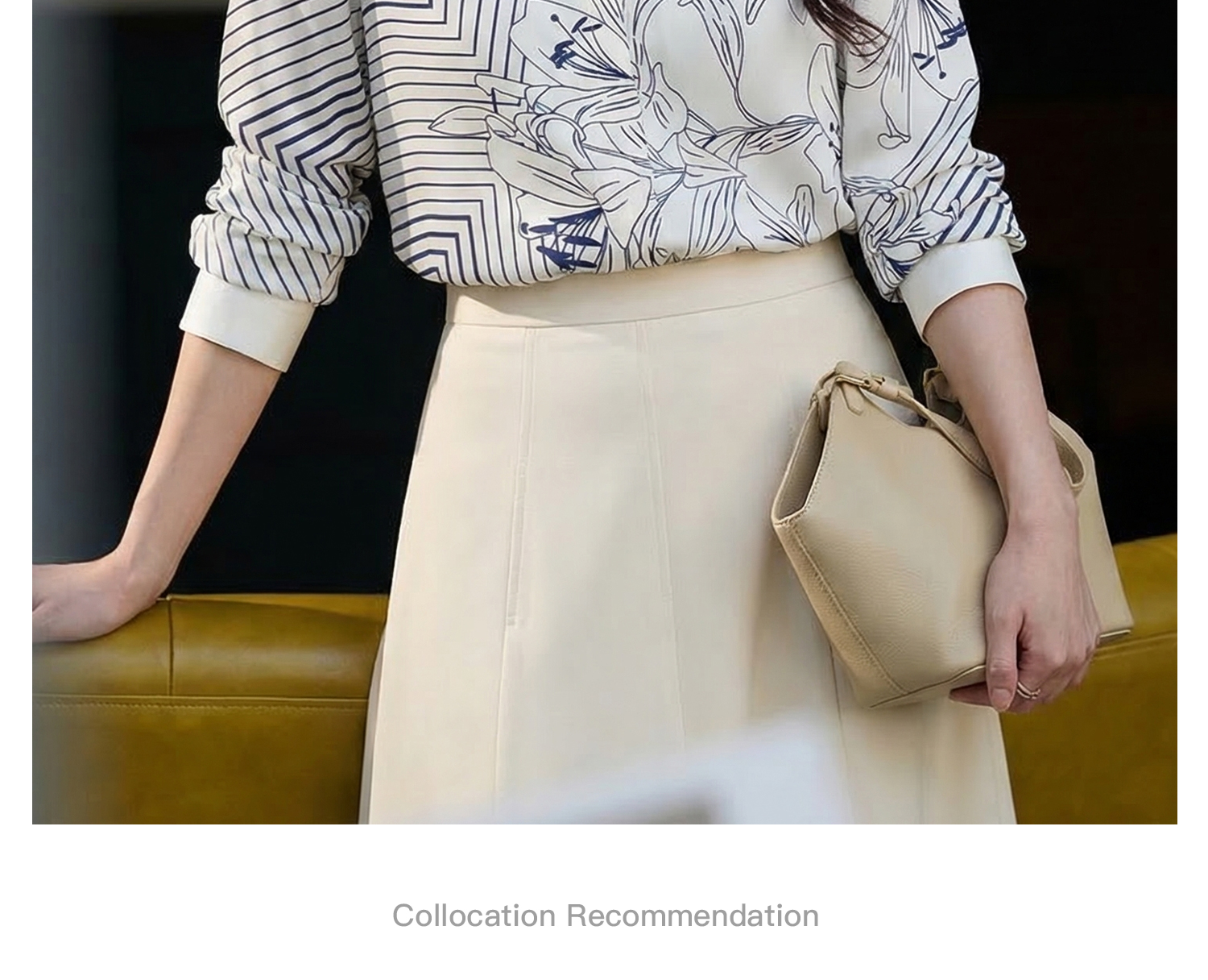 米思阳2026春季新品通勤OL满印抽象印花100%桑蚕丝艺术感衬衫领口拼接上衣女1177