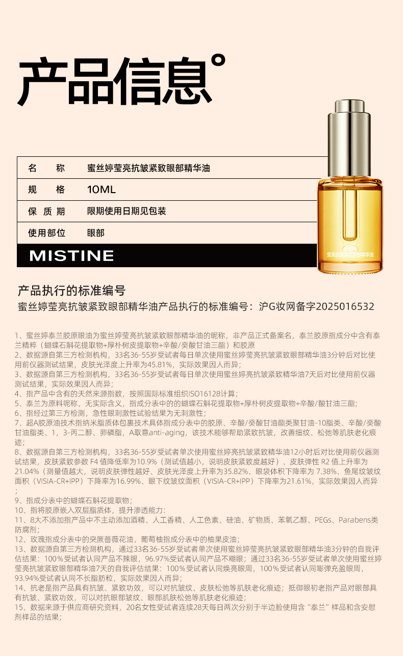 【重磅新品】Mistine蜜丝婷泰兰胶原油眼油紧致抗皱淡纹眼霜修护眼部精华油