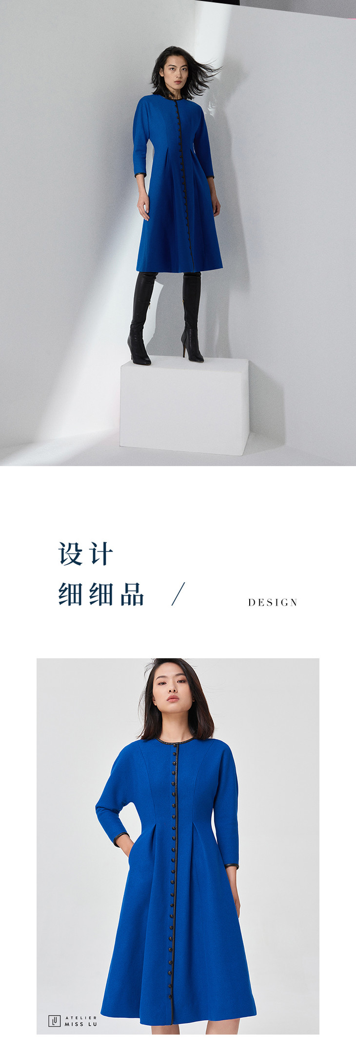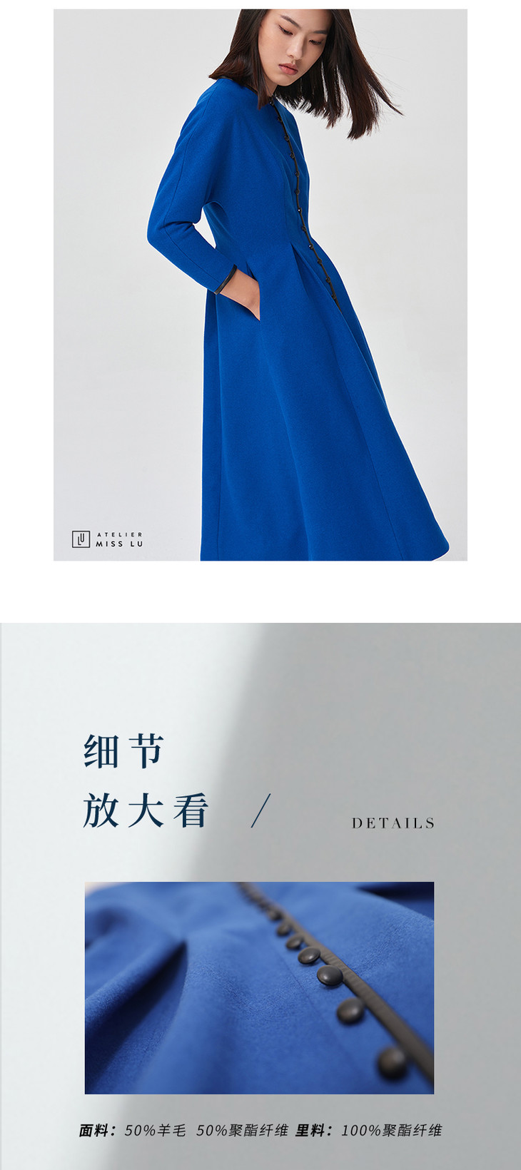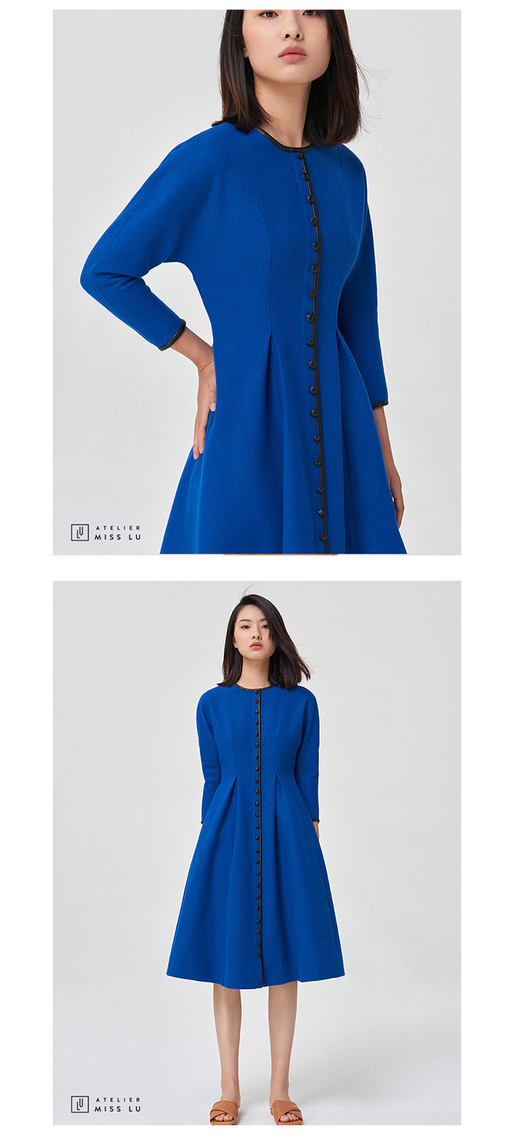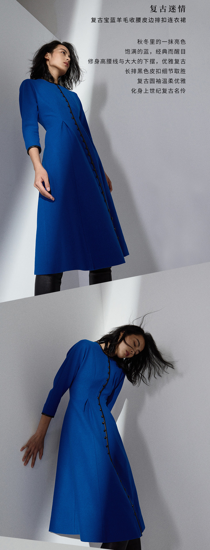 【复古迷情】复古宝蓝羊毛收腰皮边排扣连衣裙