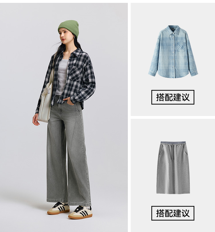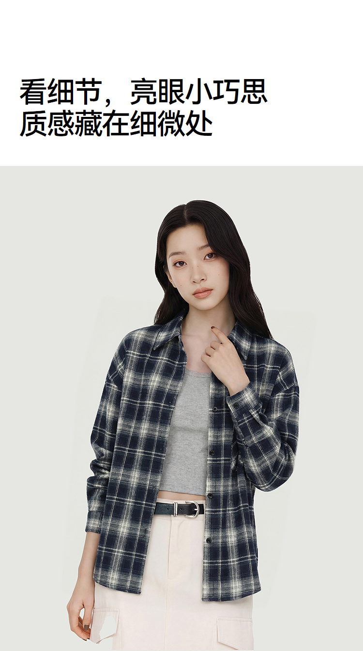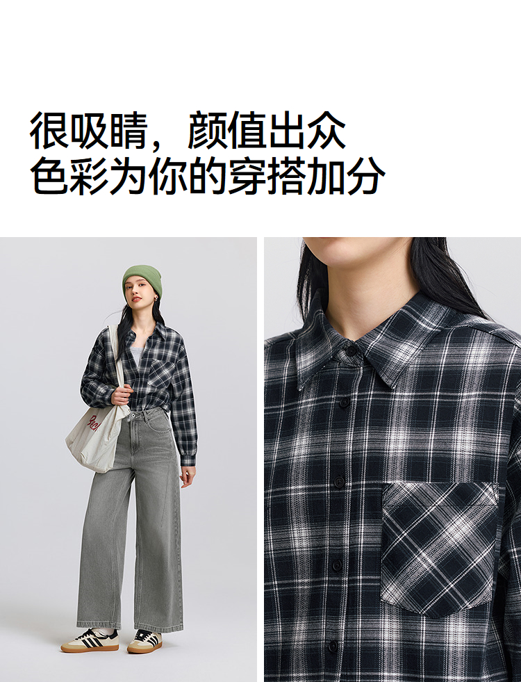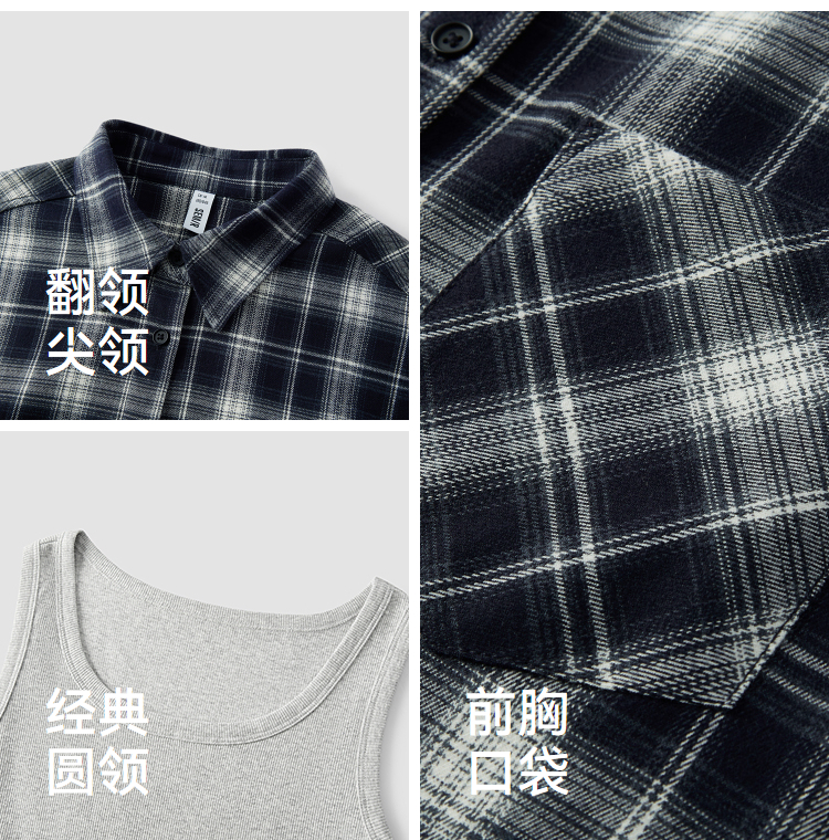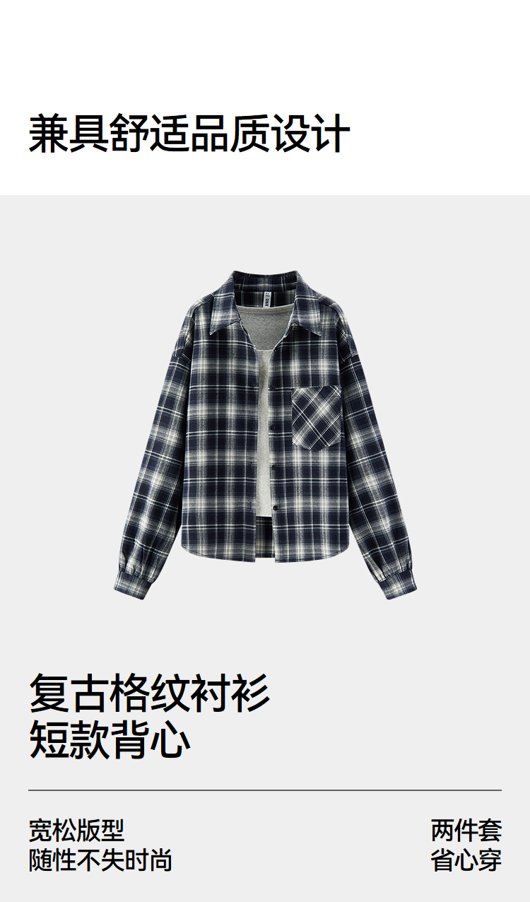 森马长袖衬衫女春季短背心宽松格纹衬衣复古港风盐系小个子两件套
