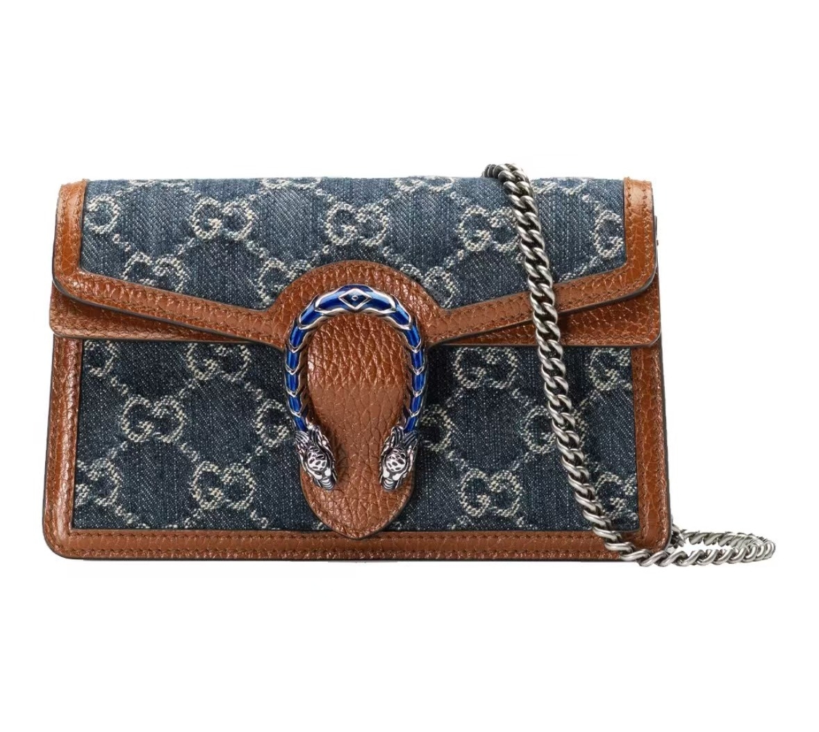 GUCCI古驰 Dionysus 酒神 虎头扣老花Logo 牛仔布拼皮革 链条包斜挎单肩包 超迷你 女款 灰蓝色/棕色