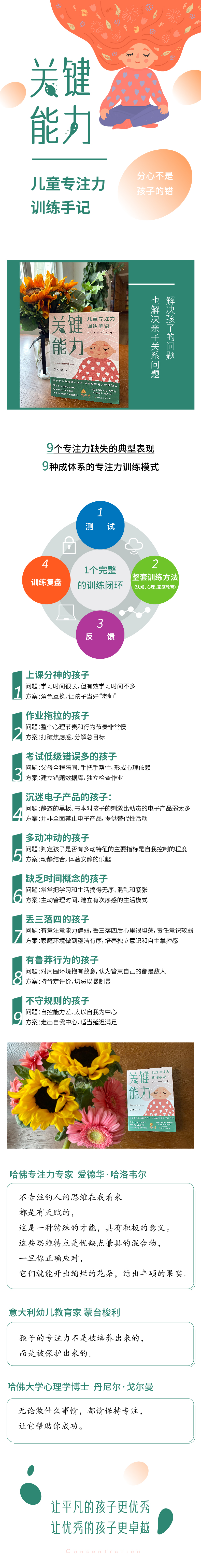这是一本写给家长的,针对4-14岁孩子专注力缺失的图书。本书用真实的案例详尽地介绍了孩子不专注的表现和根源,用一套科学的理论和实践方法训练孩子的注意力,不仅解决孩子在学业上、生活上、性格上有关专注力缺失的问题,也能缓解家长的焦虑,从中获得专注力的训练。用成体系的方法来训练孩子的专注力,比如有测试、针对测试进行有效训练以及反馈,是一个完整的训练闭环。训练的方法既专业又易操作,语言通俗,比喻形象,代入感强,包括分析孩子和家长的心理动机,从源头解决问题,有很强的说服力。