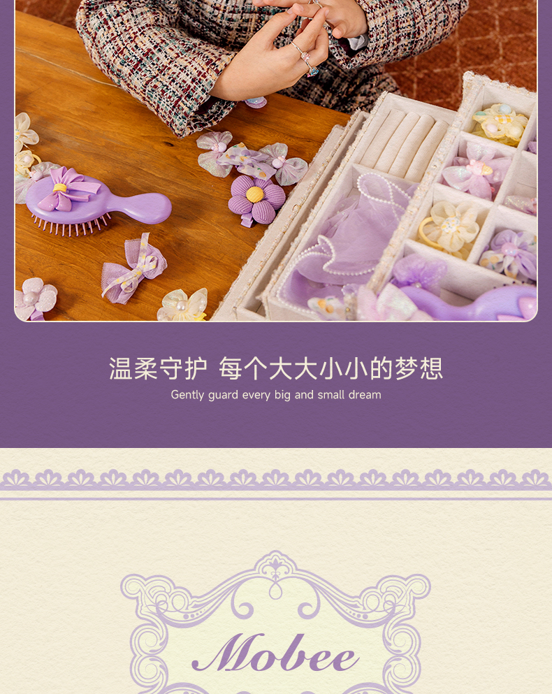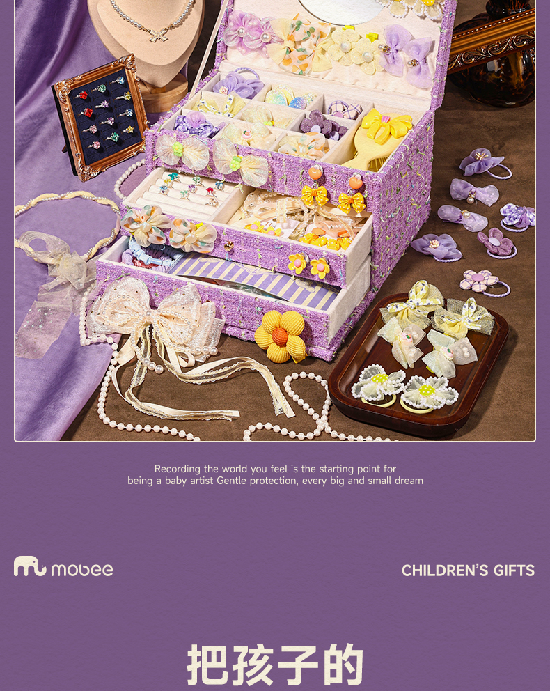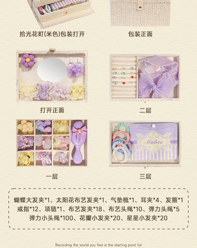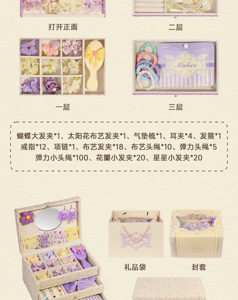 【赠礼袋】mobee儿童发饰礼盒套装 女孩侧边发夹箍头绳皮筋 迷迭花园 拾光花町首饰收纳礼盒装 可做发圈 发卡 发箍 梳子 项链等