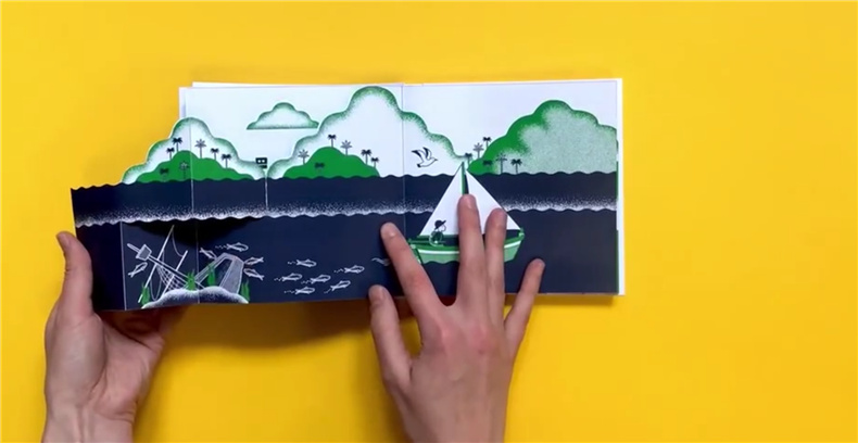 Une traversée poétique dans un album dont les pages, en papier découpé imprimé en deux couleurs pantone bleu et vert, se déploient pour faire apparaître des paysages et des animaux.