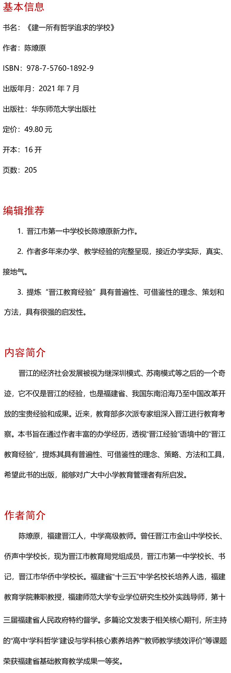 1. 晋江市第一中学校长陈燎原近期新力作。2. 作者多年来办学、教学经验的完整呈现,接近办学实际,真实、接地气。3. 提炼“晋江教育经验”具有普遍性、可借鉴性的理念、策划和方法,具有很强的启发性。