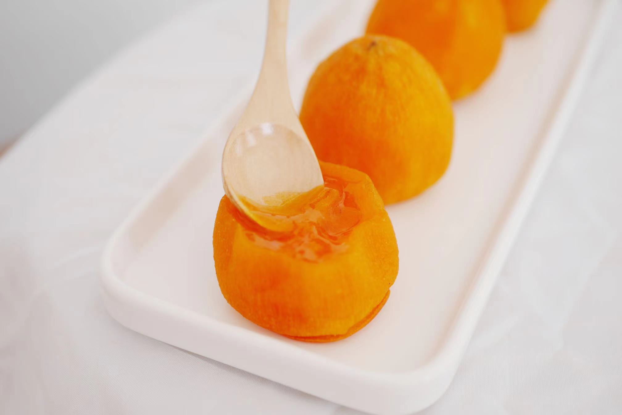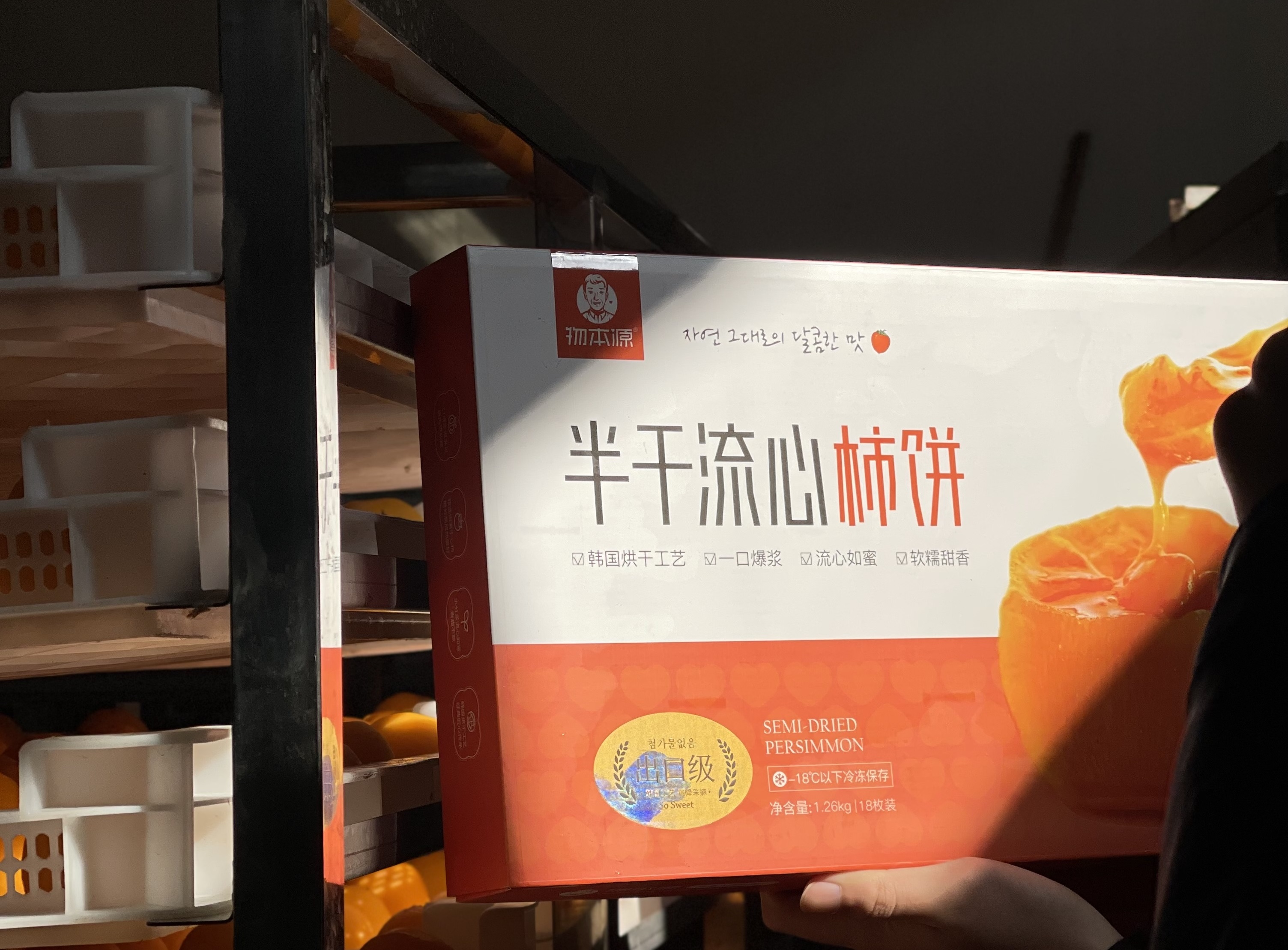 最后吹干表皮锁住内部水分,这样一枚53°甜流心柿饼就制作好了,独立包装,好吃干净。