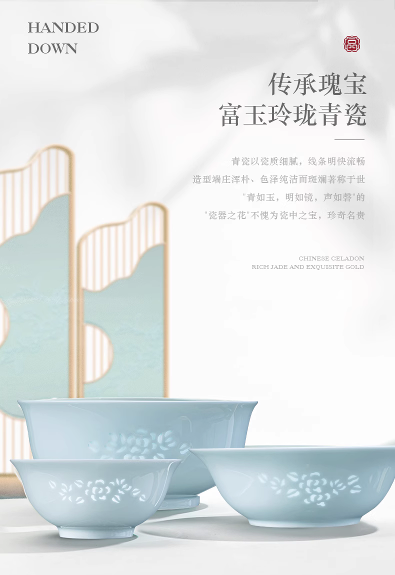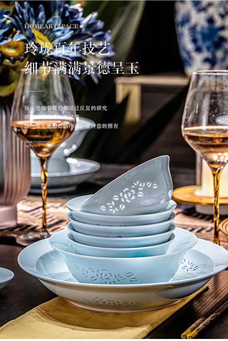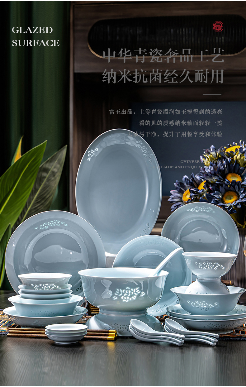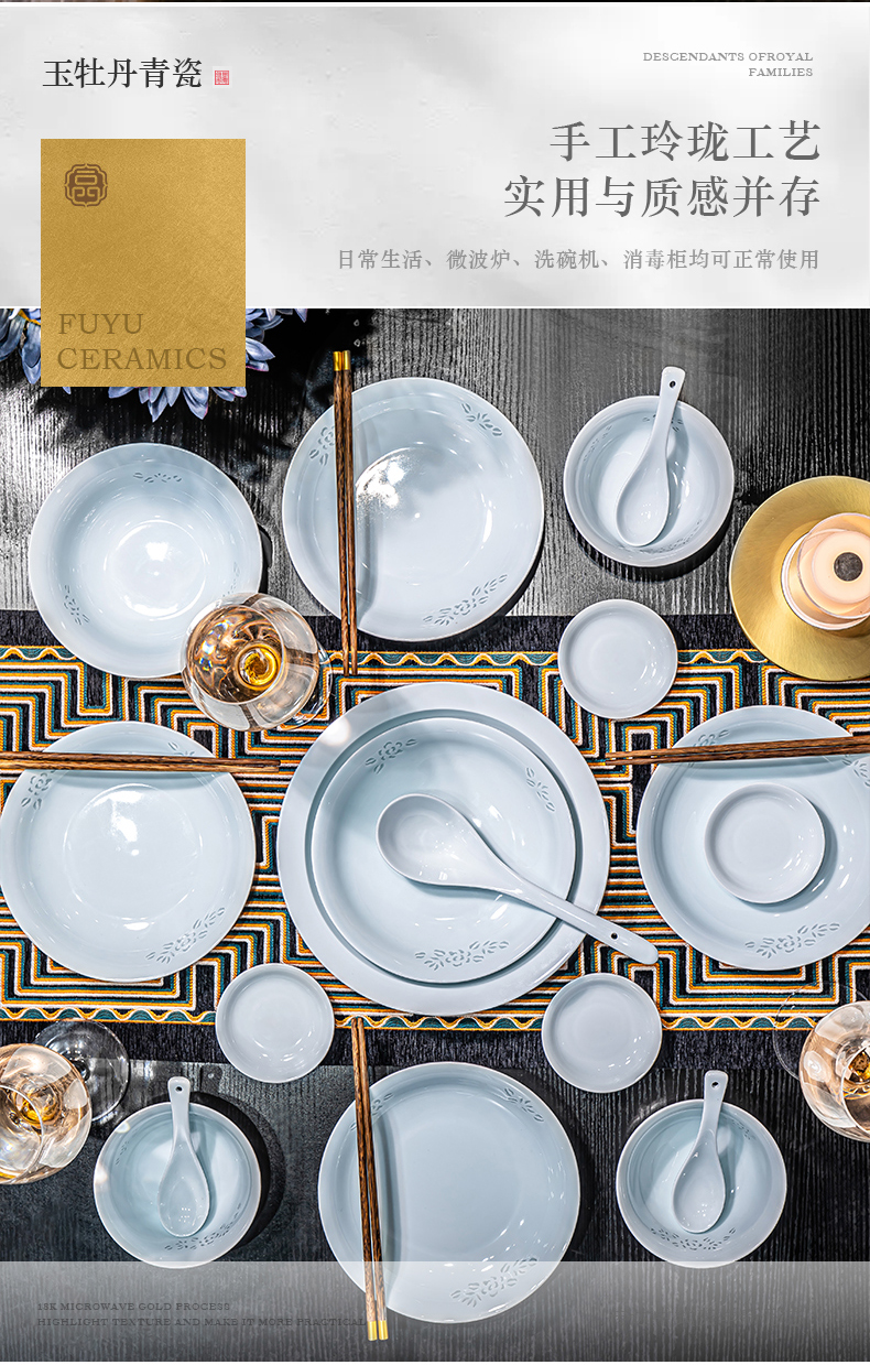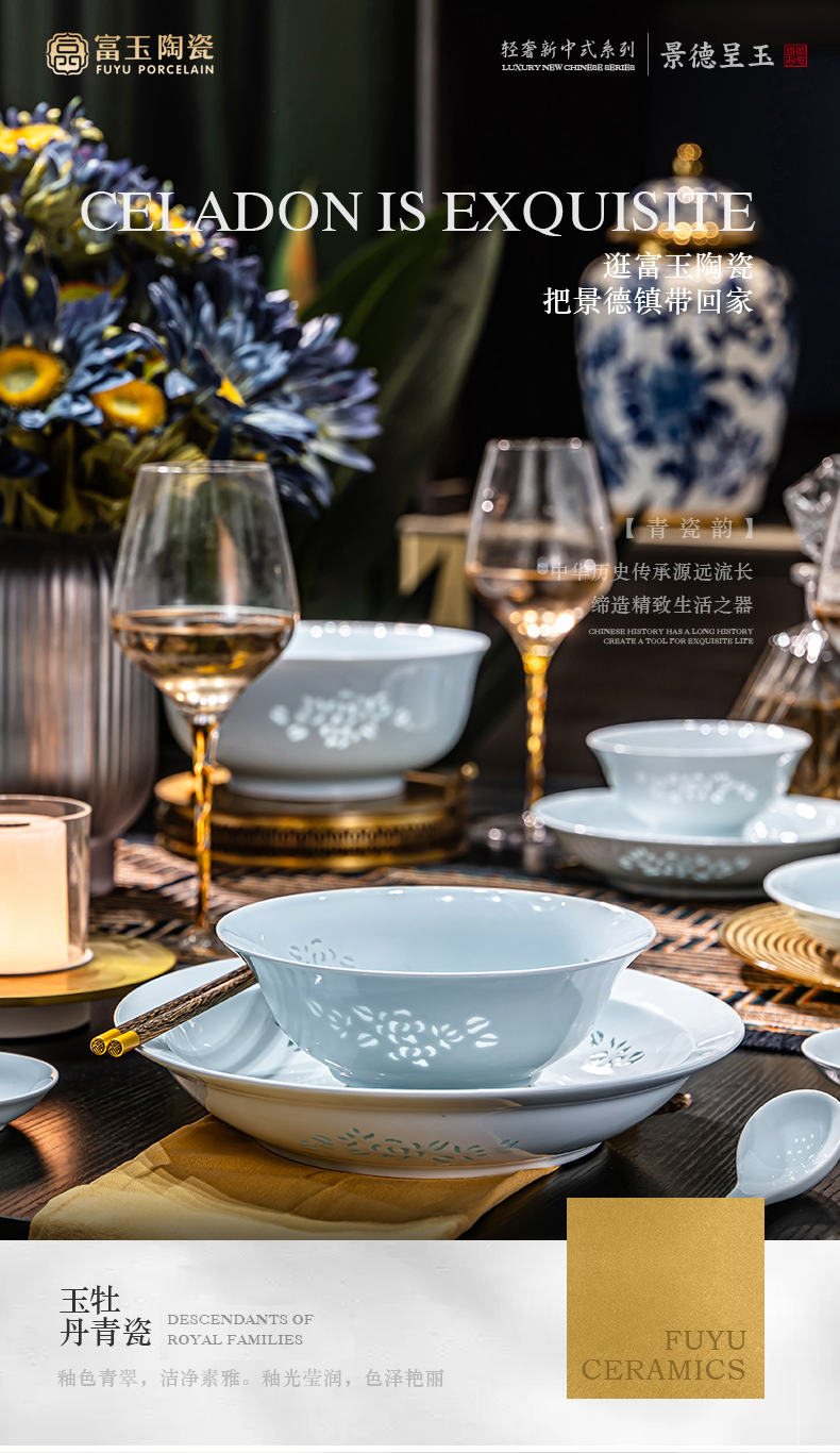 富玉 | 景德镇高温玲珑瓷青釉玉牡丹釉下餐具组合装礼盒装
