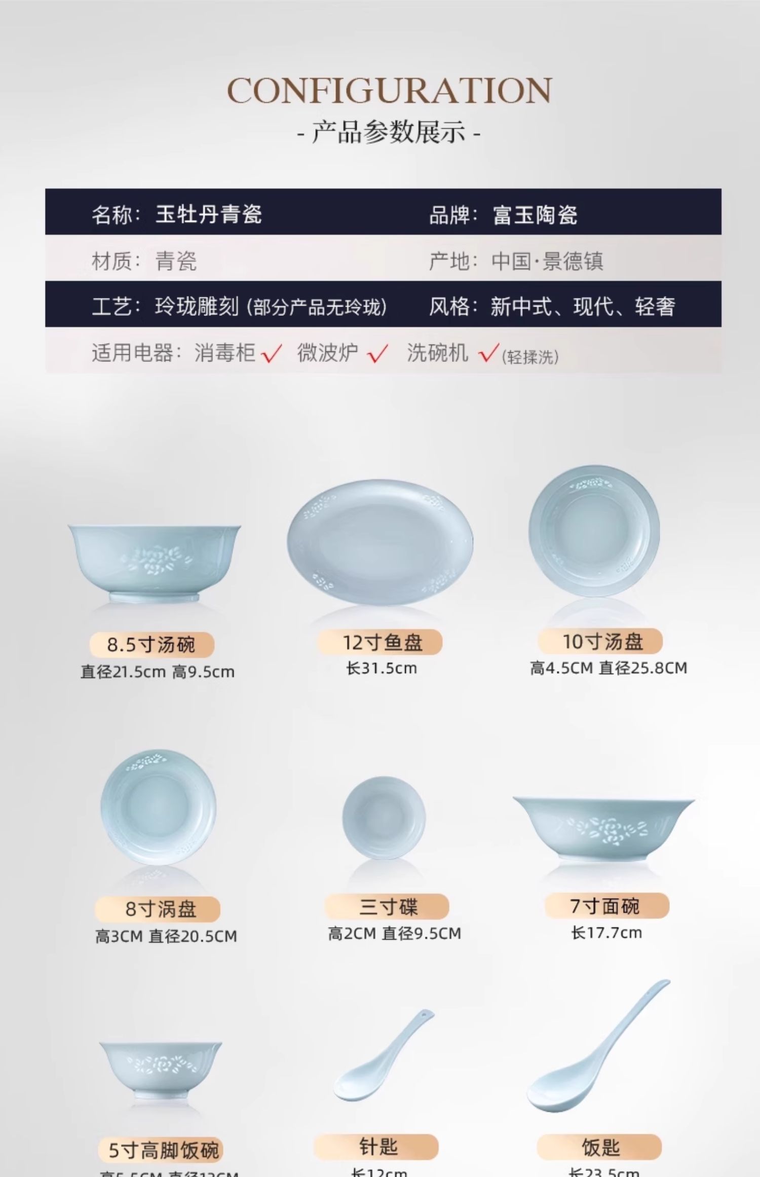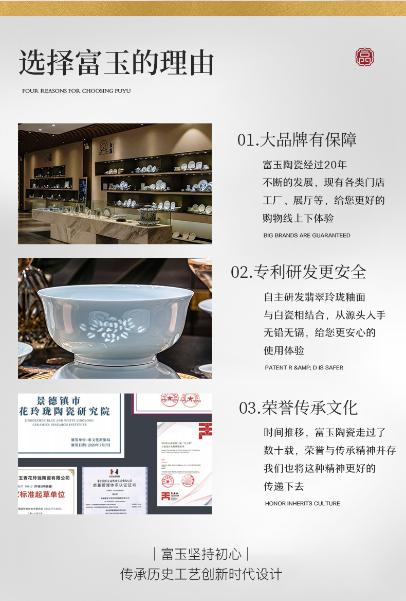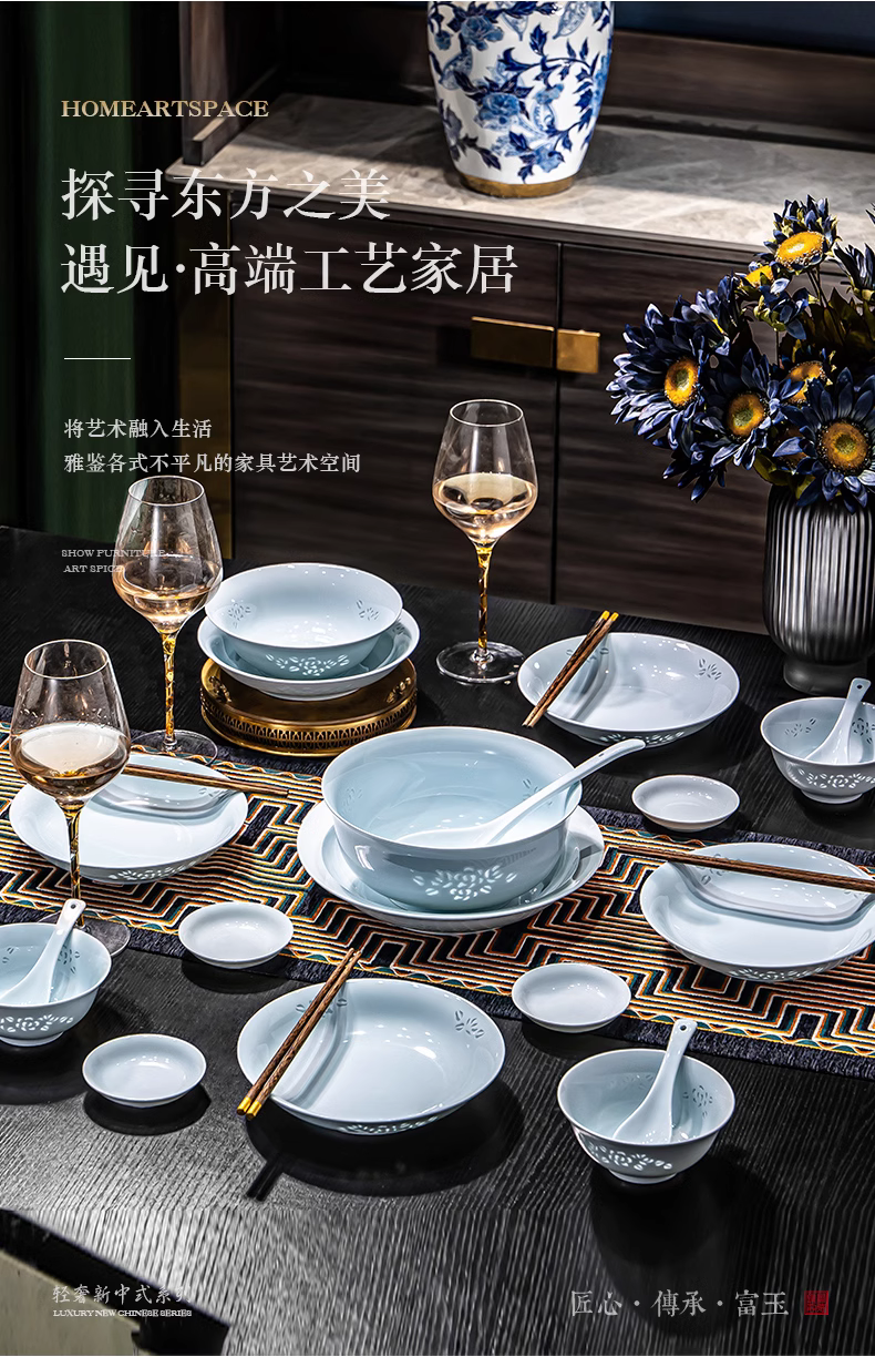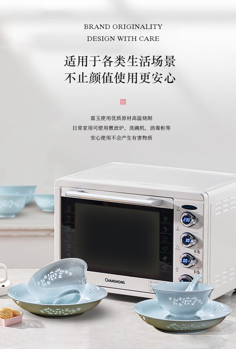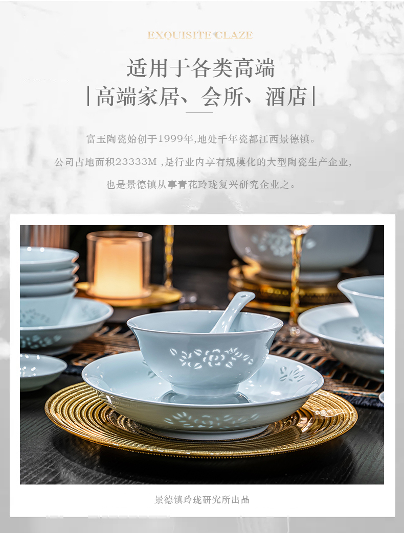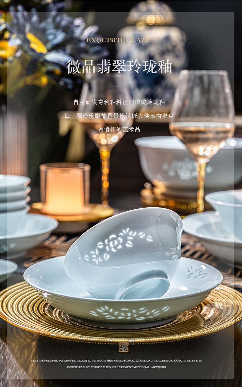 富玉 | 景德镇高温玲珑瓷青釉玉牡丹釉下餐具组合装礼盒装