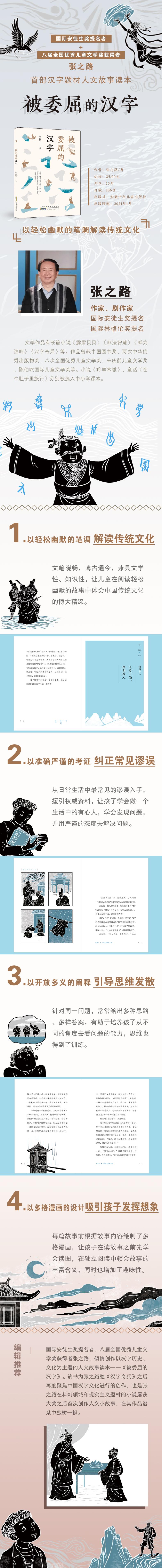 国际安徒生奖提名者、八届全国优秀儿童文学奖获得者张之路,倾情创作以汉字历史、文化为主题的人文故事读本——《被委屈的汉字》。该书为张之路继《汉字奇兵》之后再度聚焦中国汉字文化进行的创作,也是张之路在科幻领域和现实主义题材的小说屡获大奖之后首次创作人文小故事,在其作品谱系中独树一帜。