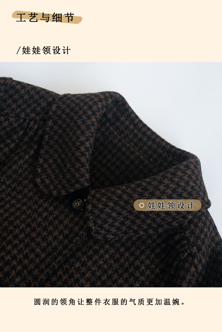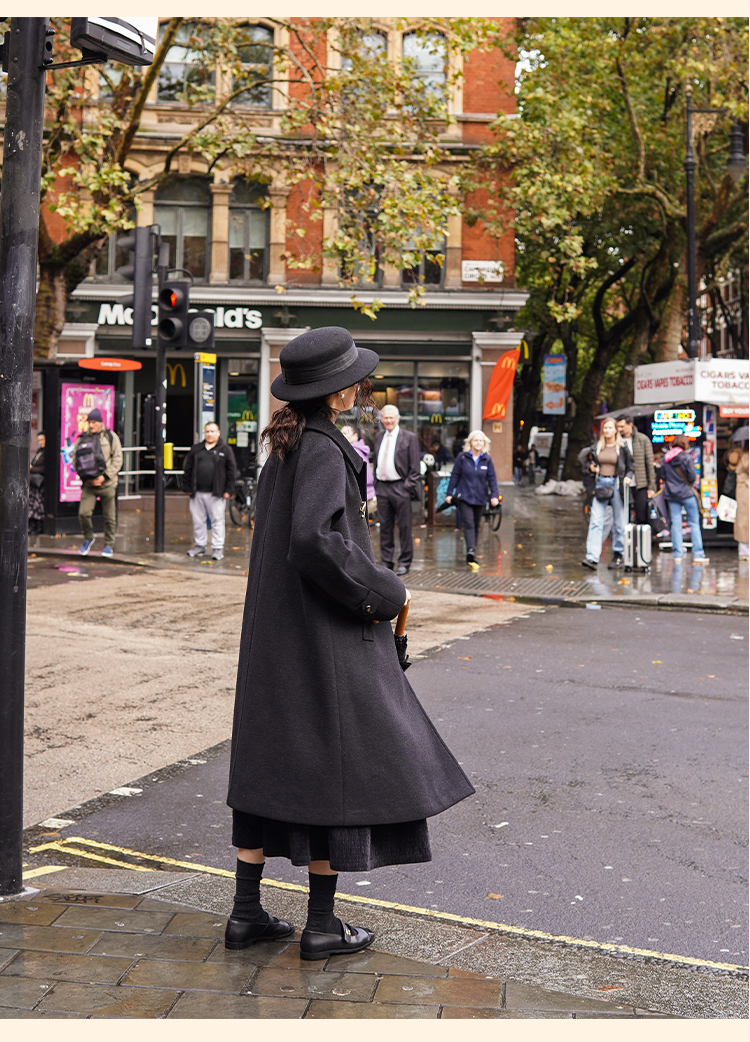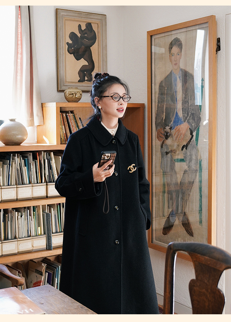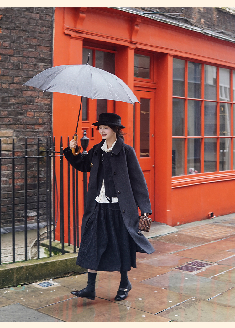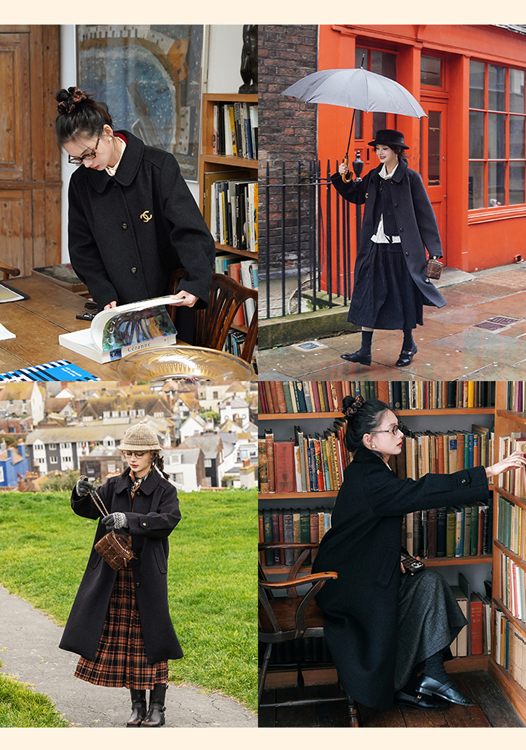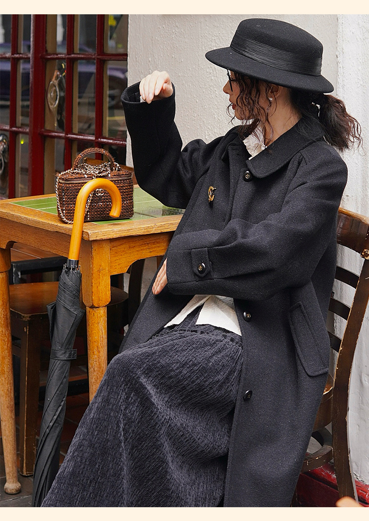 浮生八记/24C119/复古全羊毛娃娃领抽肩章收袖口古董金扣大衣