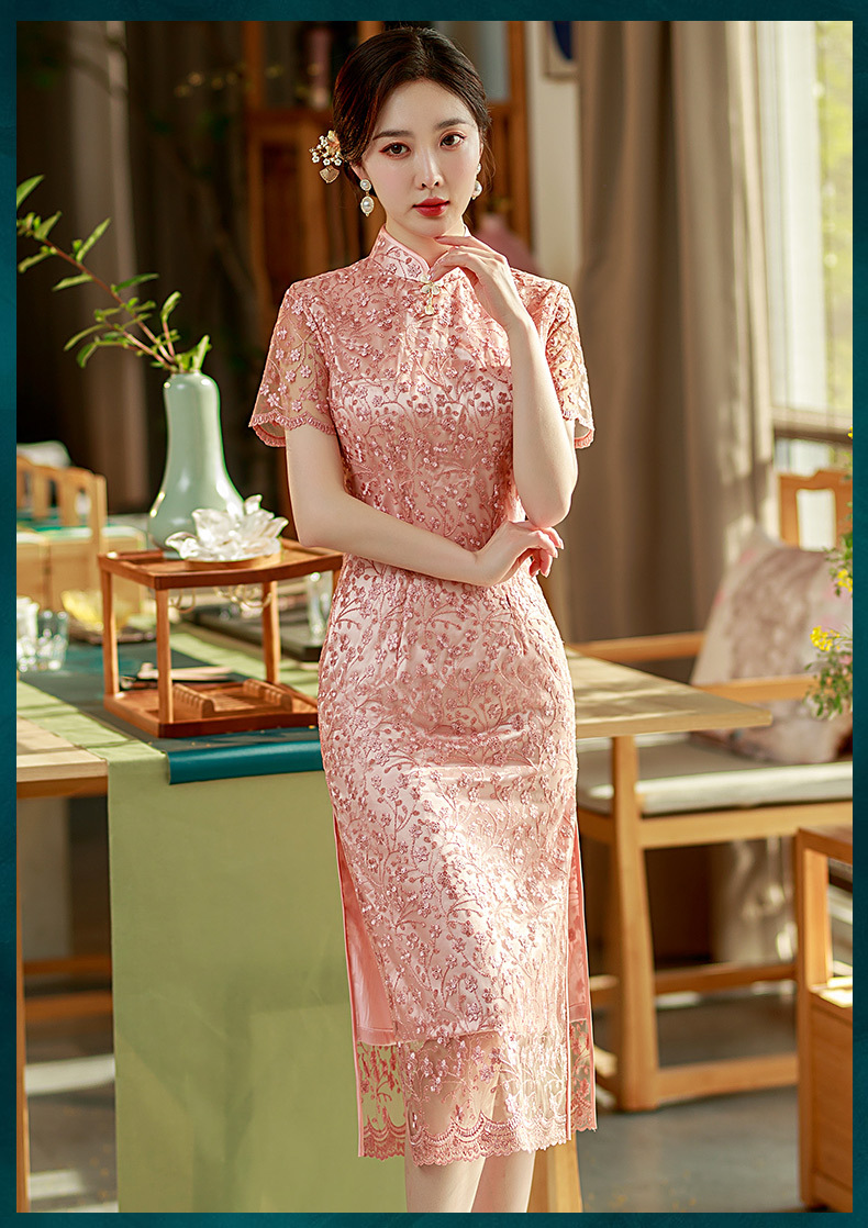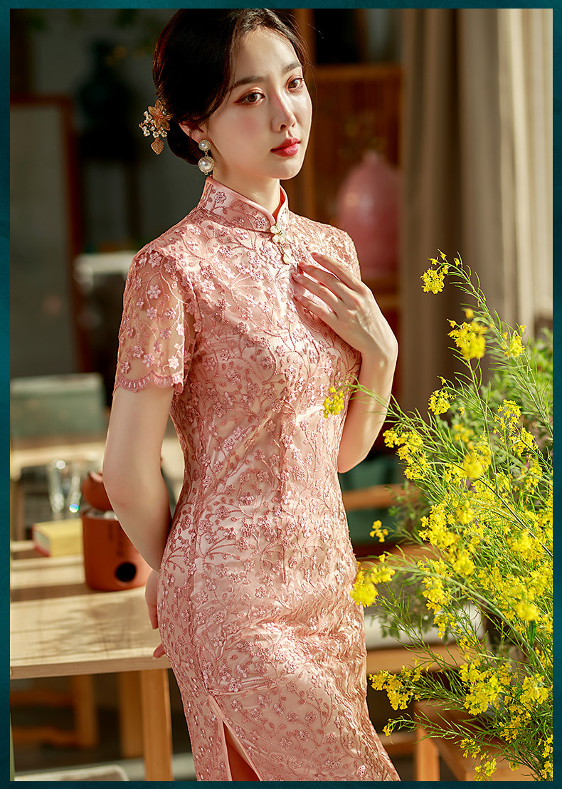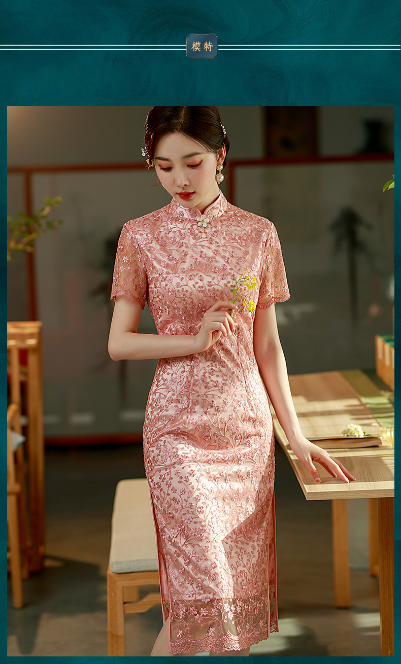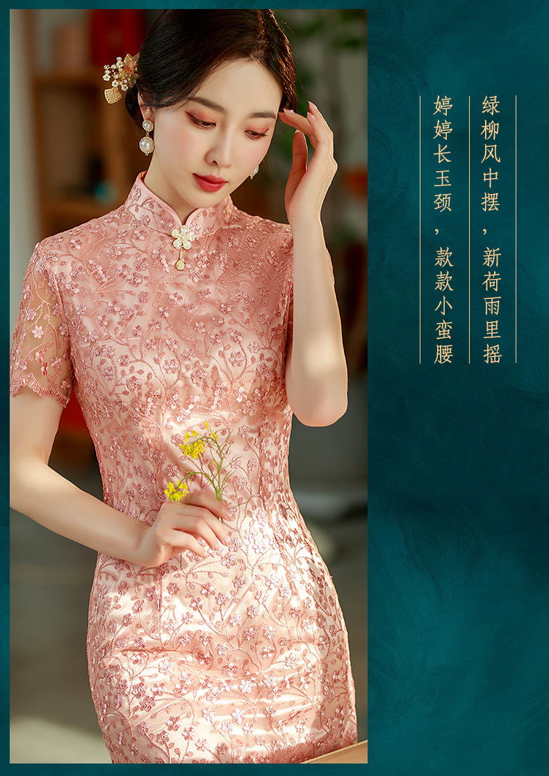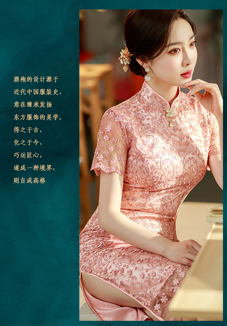 夏季新款,蕾丝绣花短袖立领走秀晚礼服性感旗袍ST- B2158