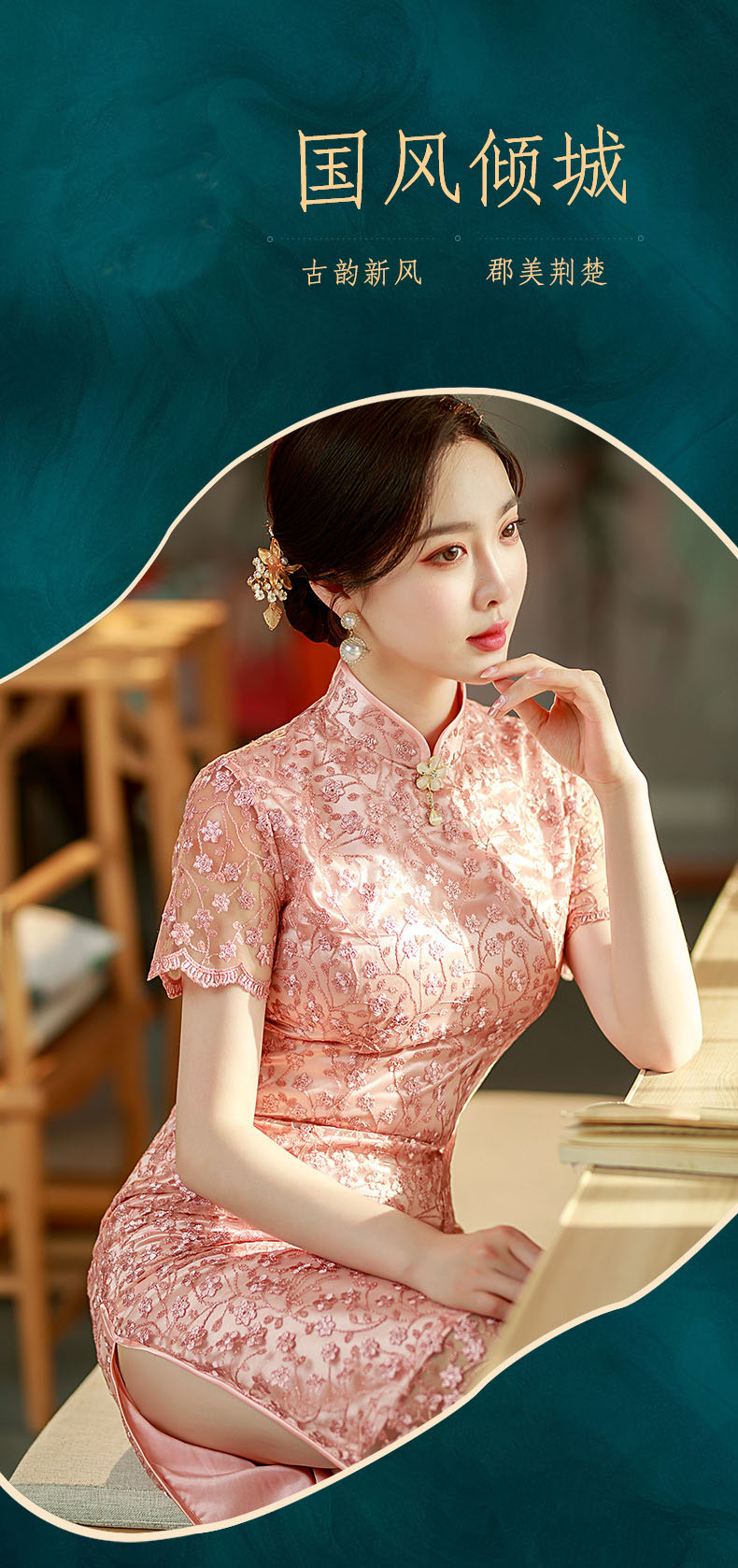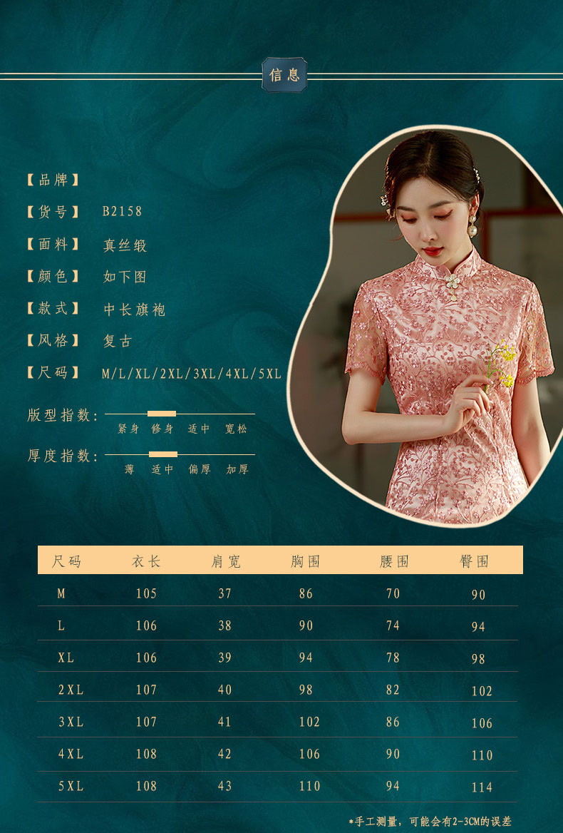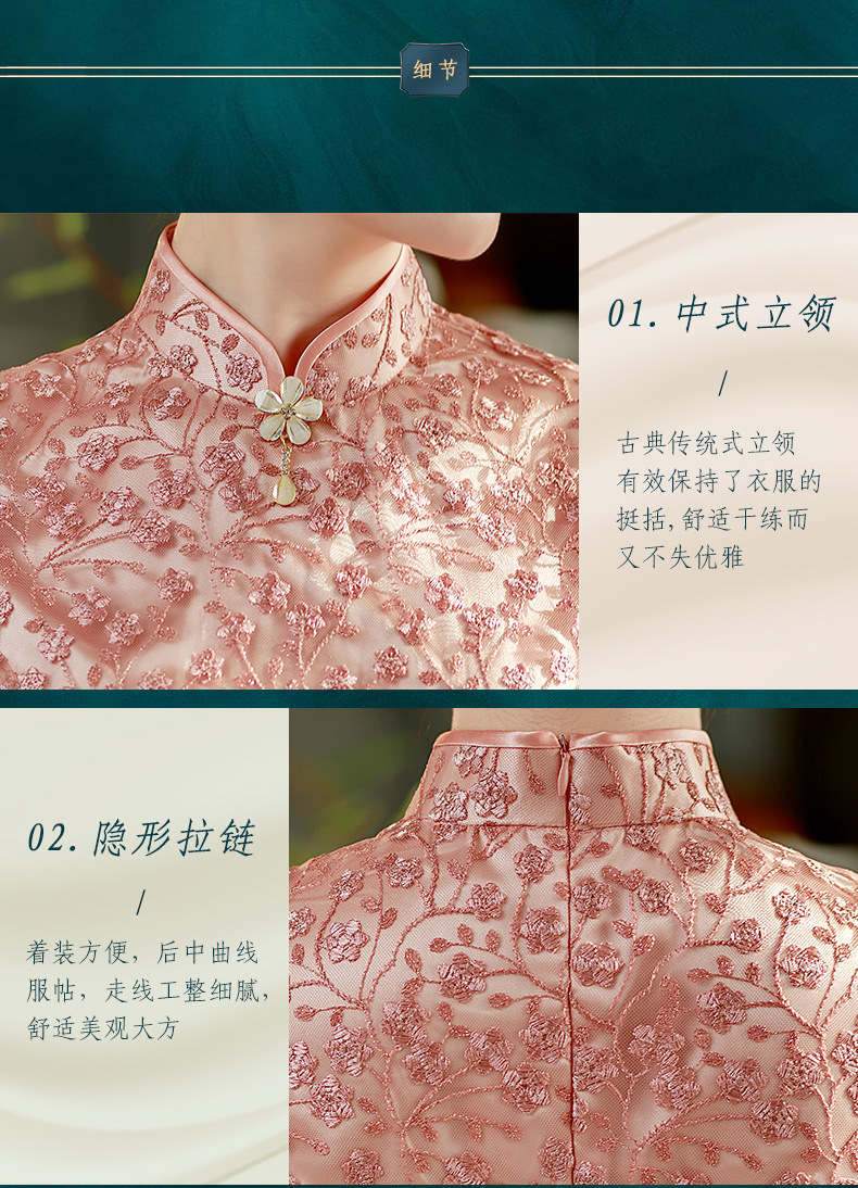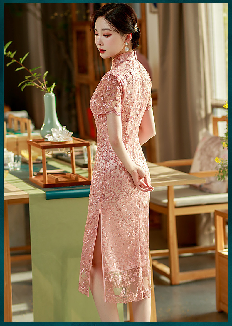 夏季新款,蕾丝绣花短袖立领走秀晚礼服性感旗袍ST- B2158