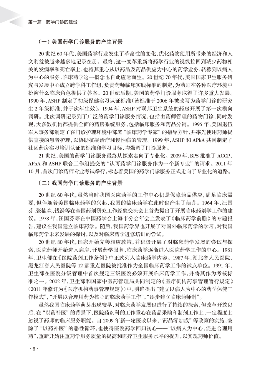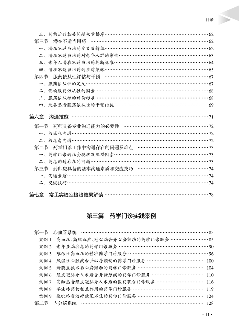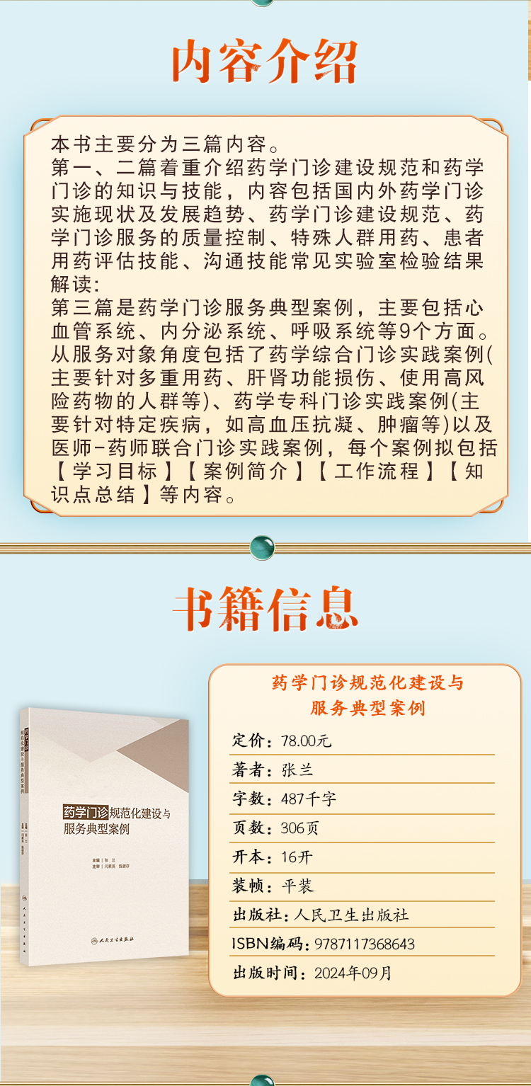 本书主要分为上下两篇,上篇着重介绍药学门诊建设规范,内容包括国内外药学门诊实施现状、我国药学门诊建设规范(包括组织管理、人员要求、软硬件设备、信息支持系统、服务标准、工作模式、工作流程、收费标准等)、药学门诊服务质量评价(包括质控体系建设、管理规范制定、临床和经济指标评价标准等),下篇是药学门诊服务典型案例,主要包括药学综合门诊实践案例(主要针对多重用药、肝肾功能损伤、使用高风险药物的人群等)、药学专科门诊实践案例(主要针对特定疾病,如高血压、抗凝、肿瘤等)、医师和药师联合门诊实践案例,每个案例拟包括【学习目标】【案例简介】【门诊服务】【知识点总结】【专家点评】等内容。