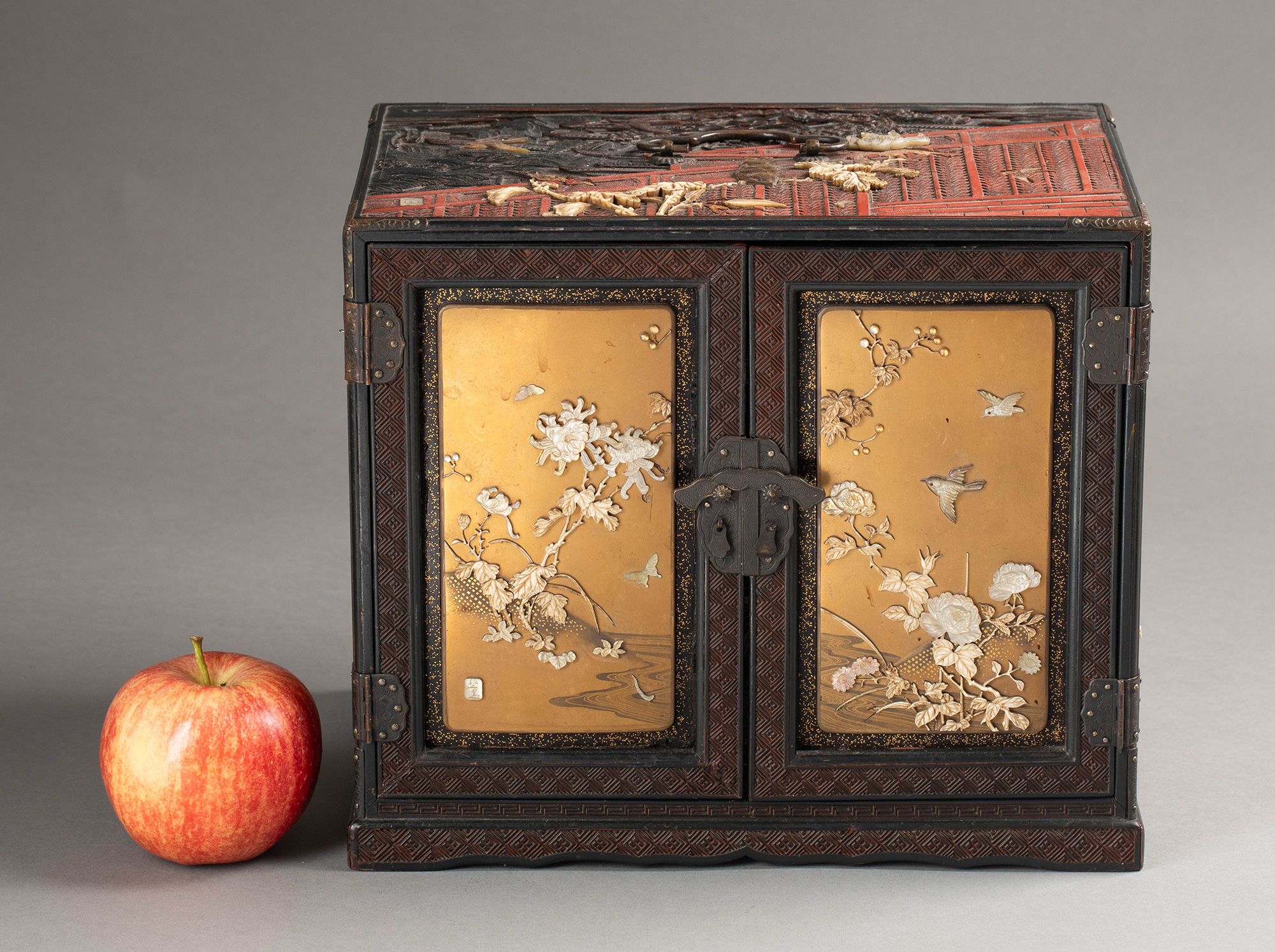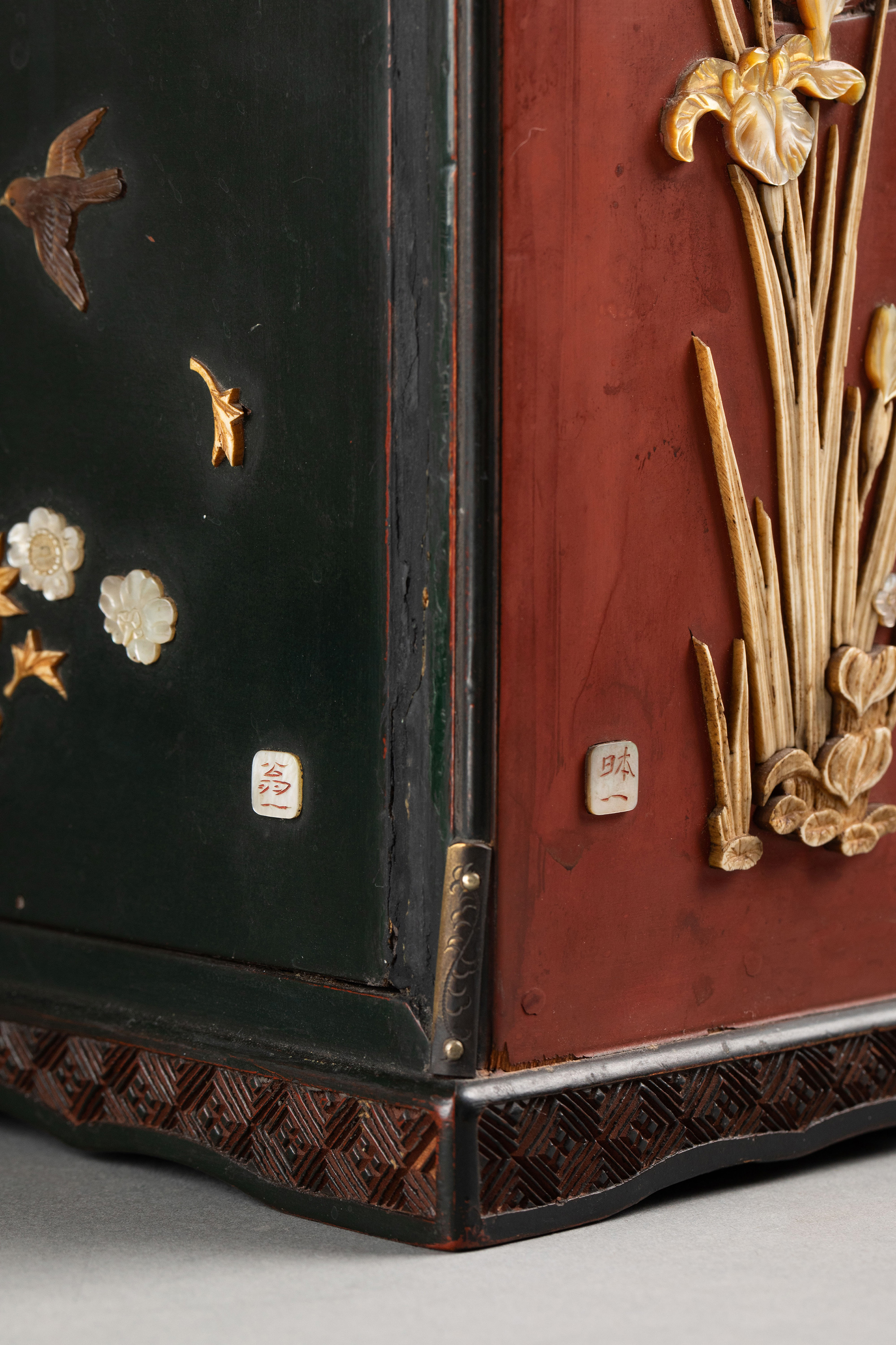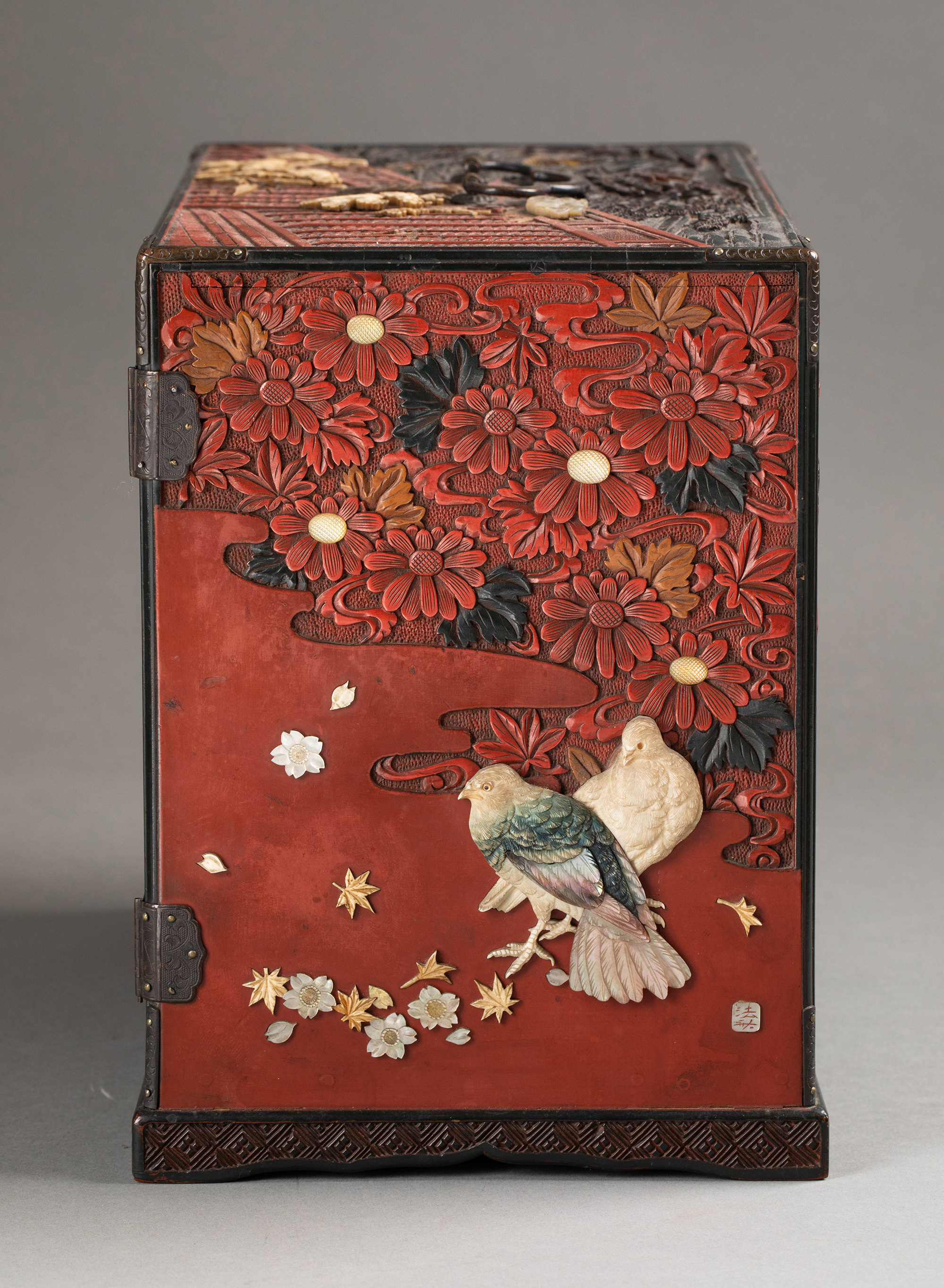 19世纪日本明治时期出品金漆莳绘装饰东方花鸟主题芝山镶嵌红地漆木精雕箪笥
