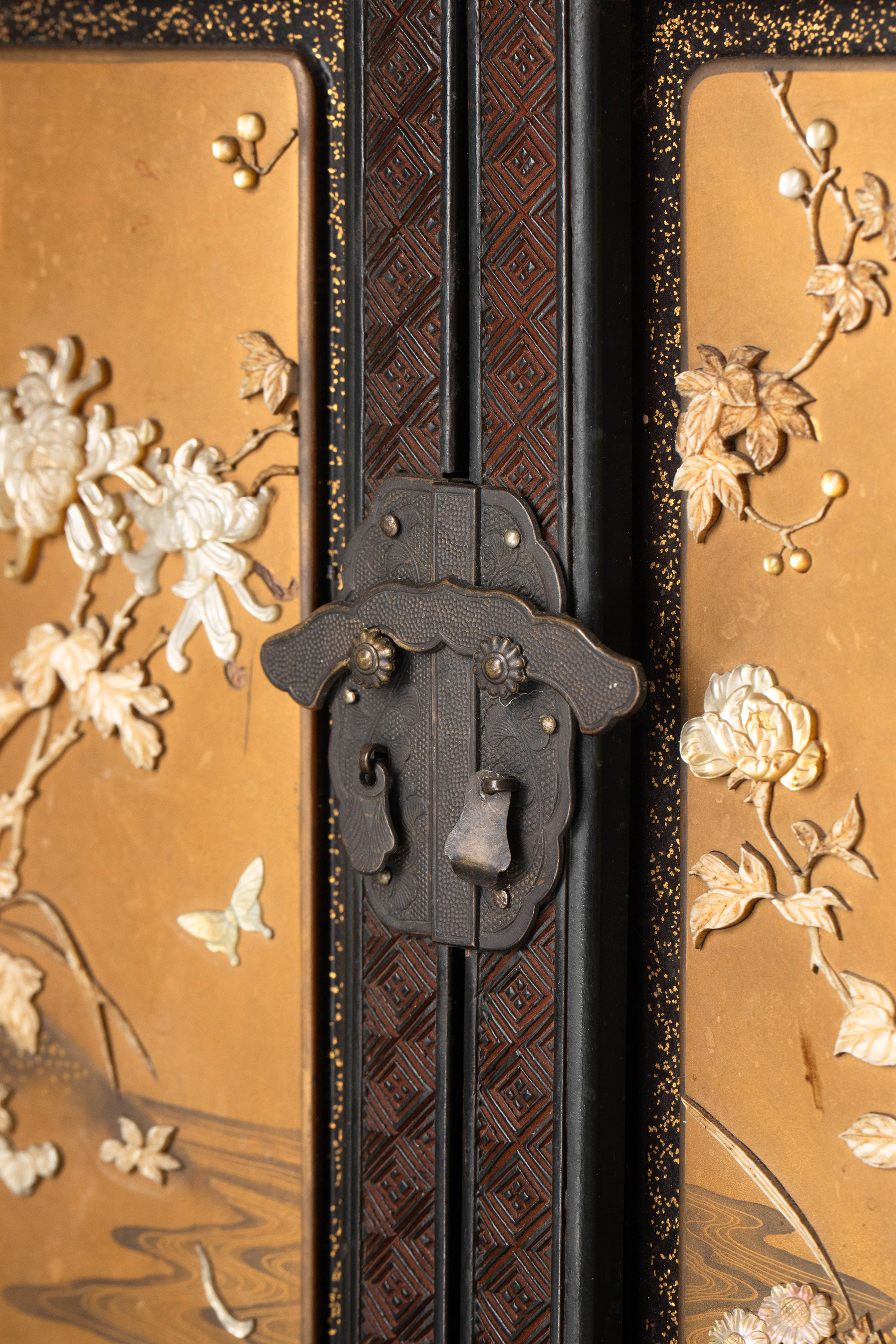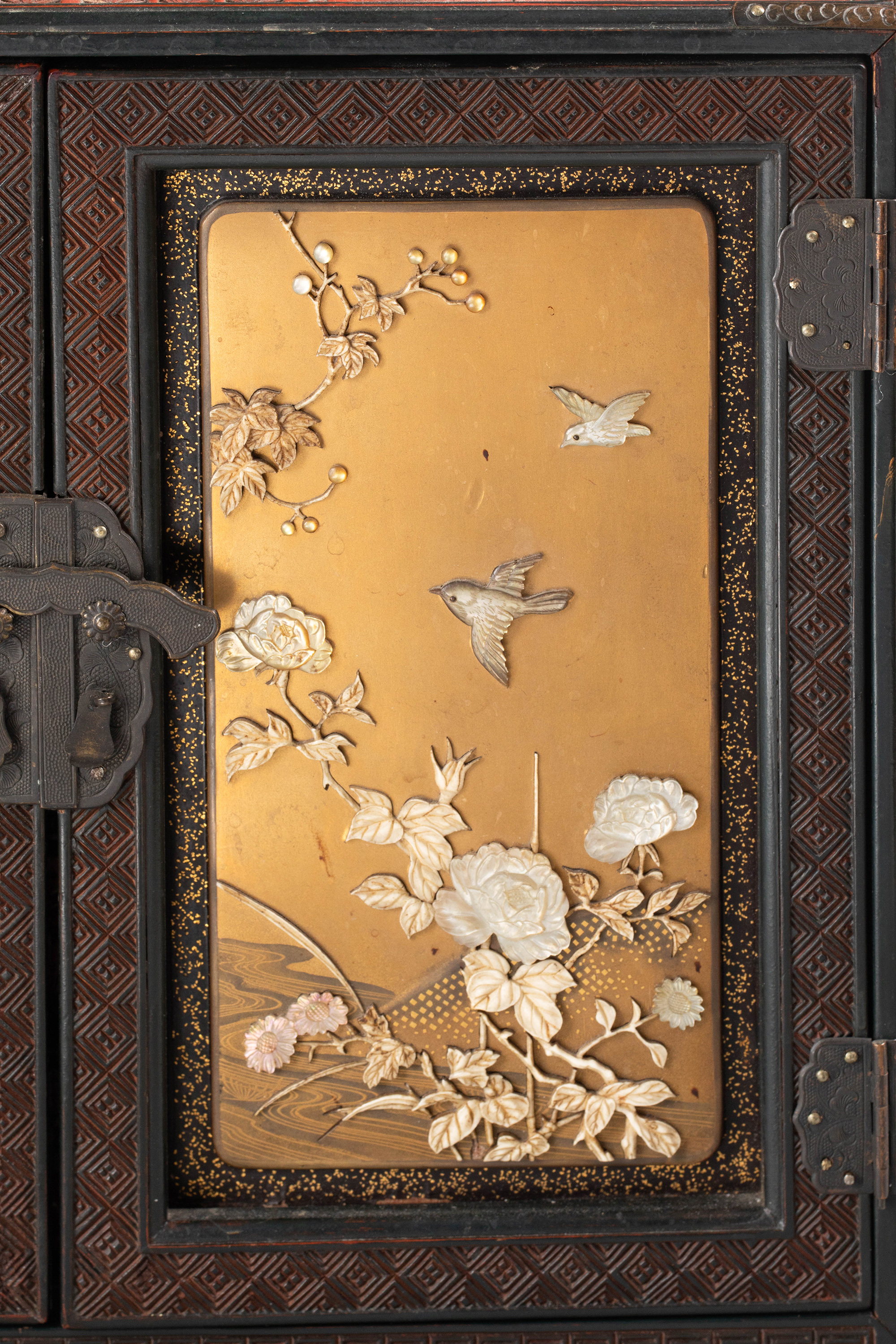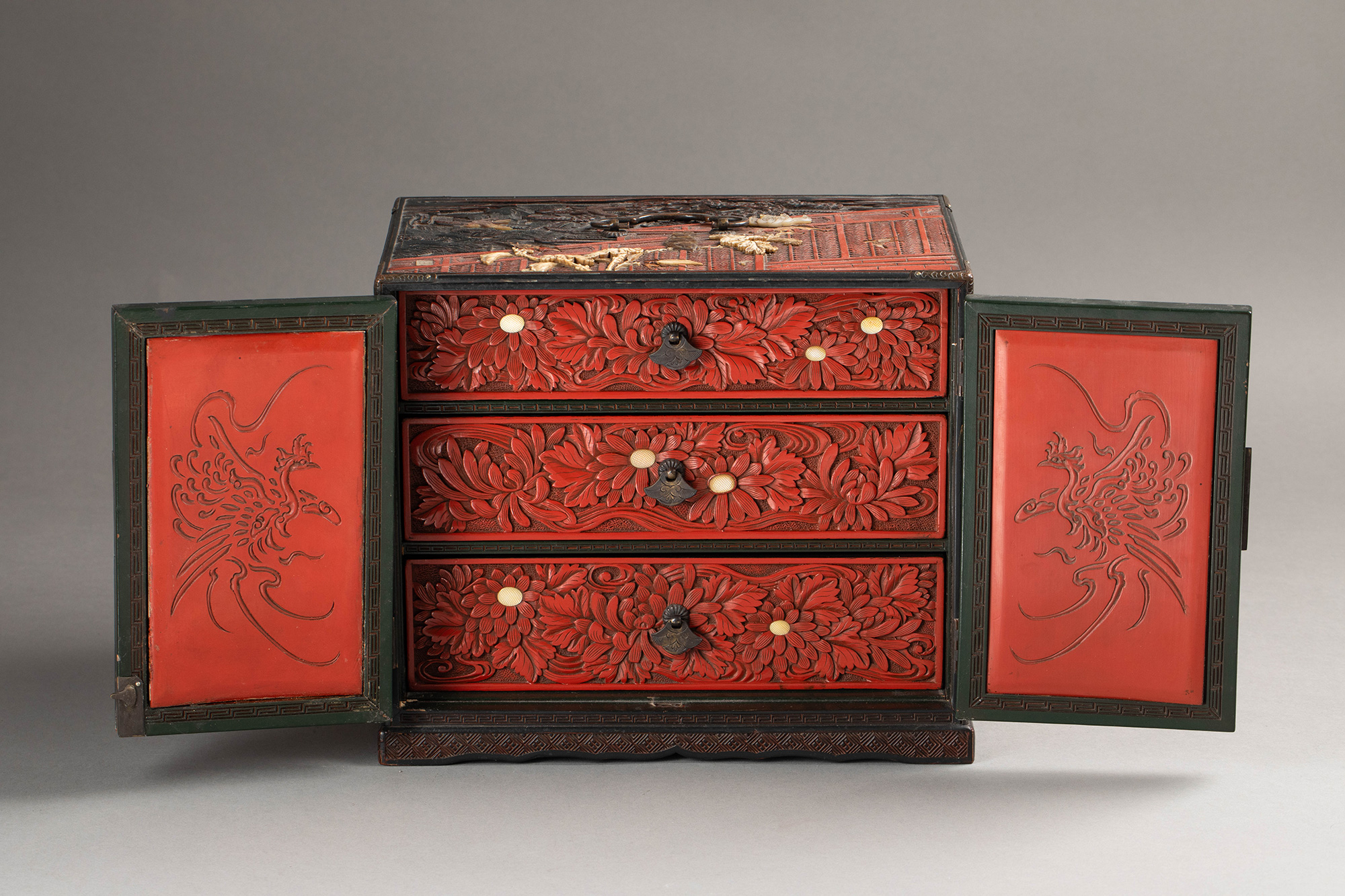 19世纪日本明治时期出品金漆莳绘装饰东方花鸟主题芝山镶嵌红地漆木精雕箪笥