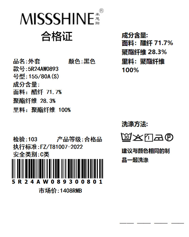 面料:醋纤 71.7%聚酯纤维 28.3%里料:聚酯纤维 100%