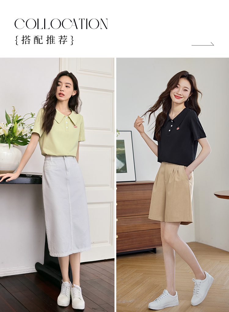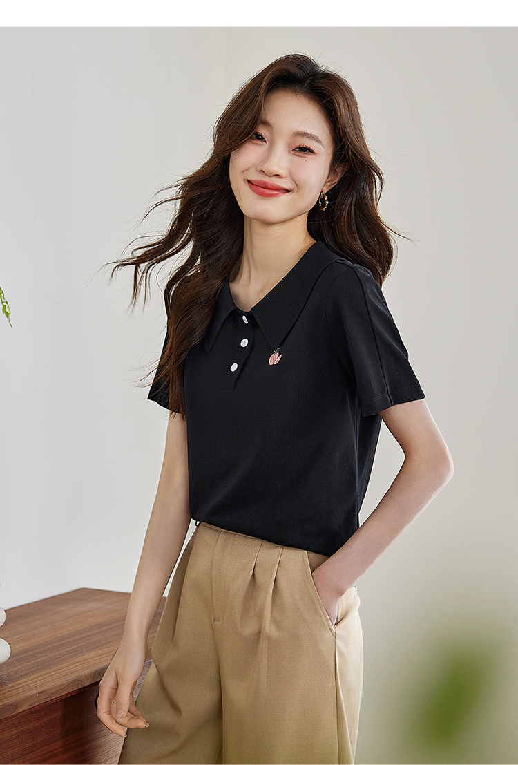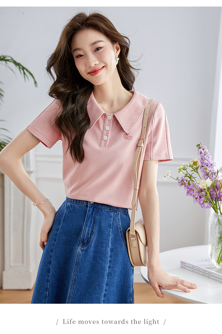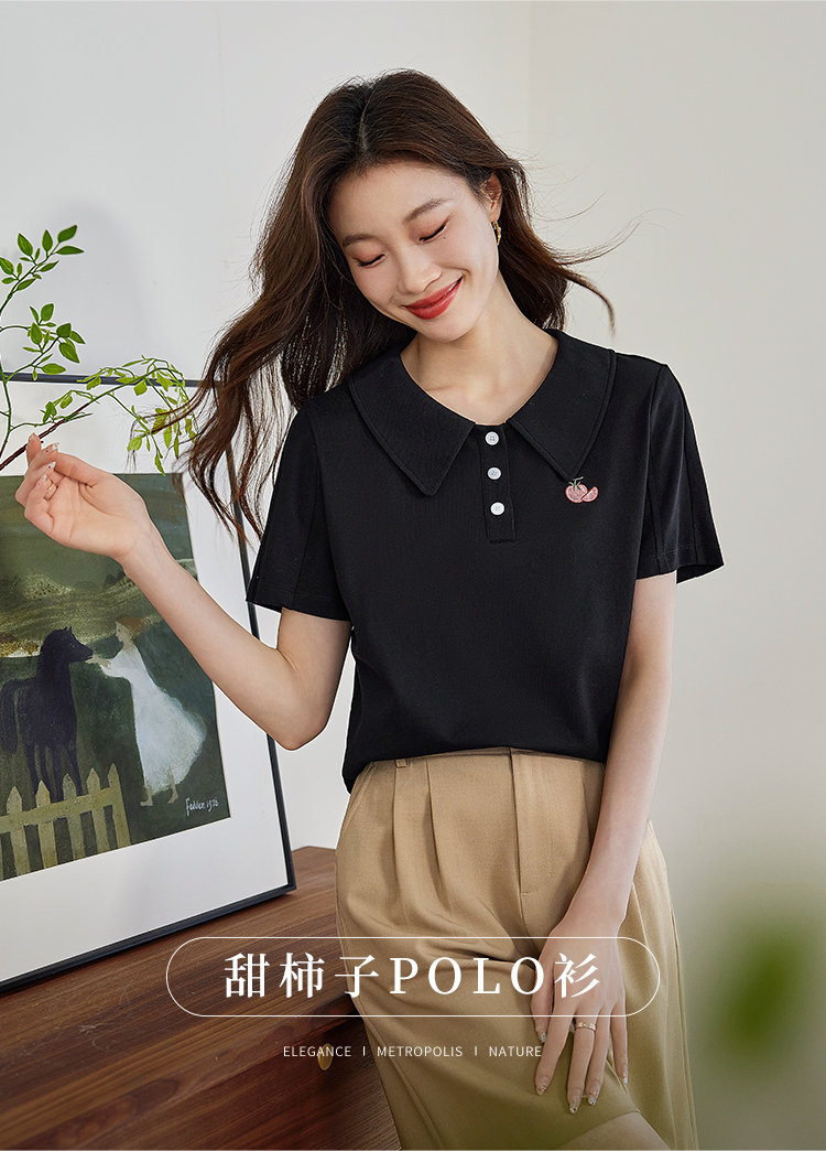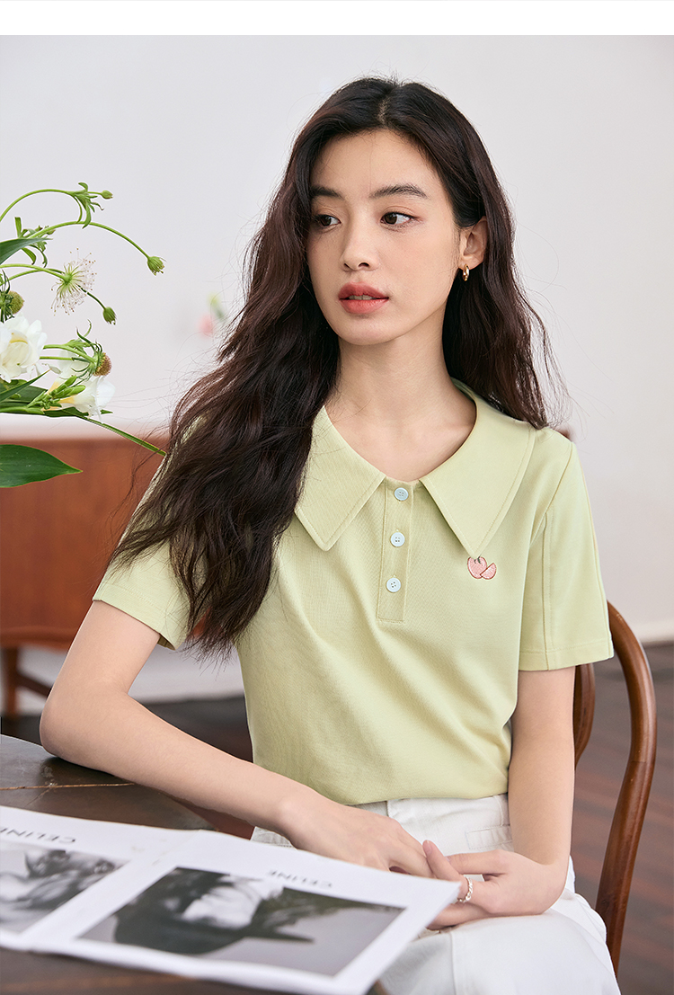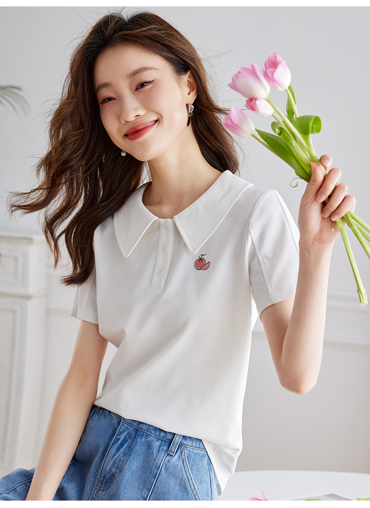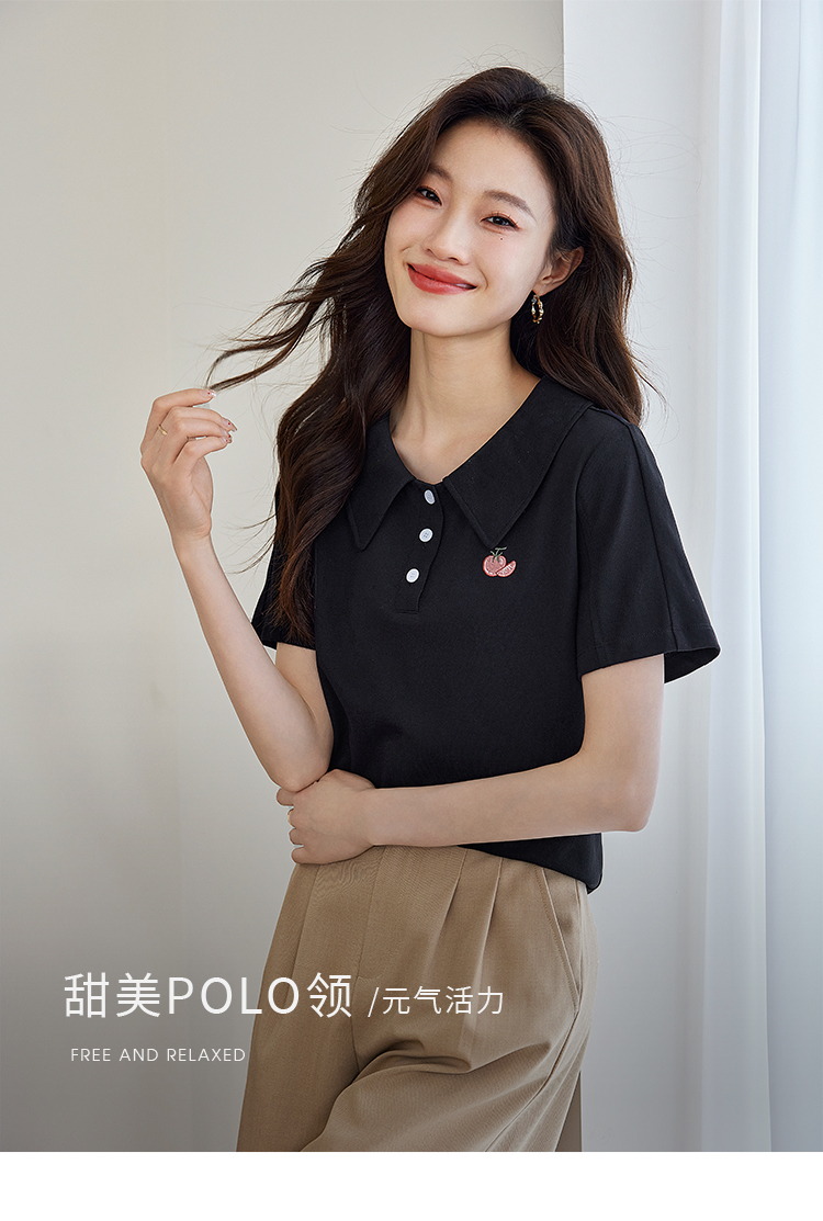 【专属特价】熙世界法式polo领正肩T恤夏2025新款甜美刺绣宽松显瘦短袖上衣