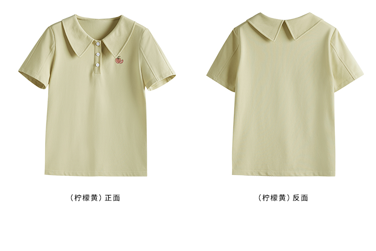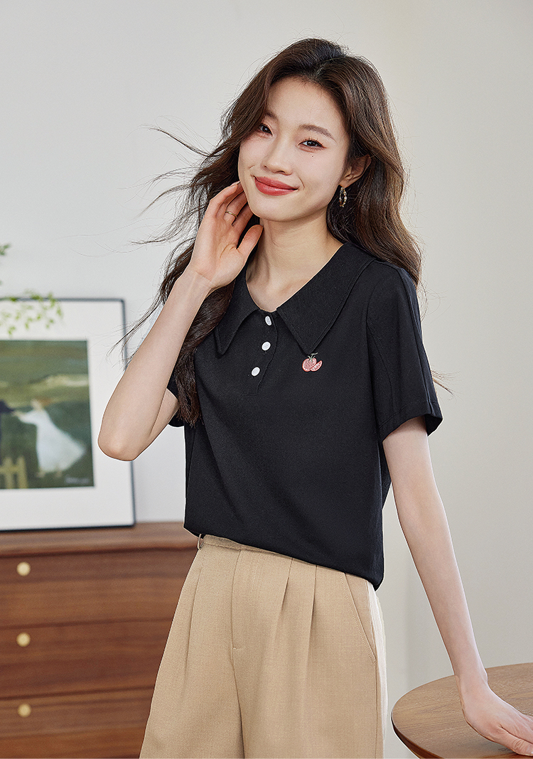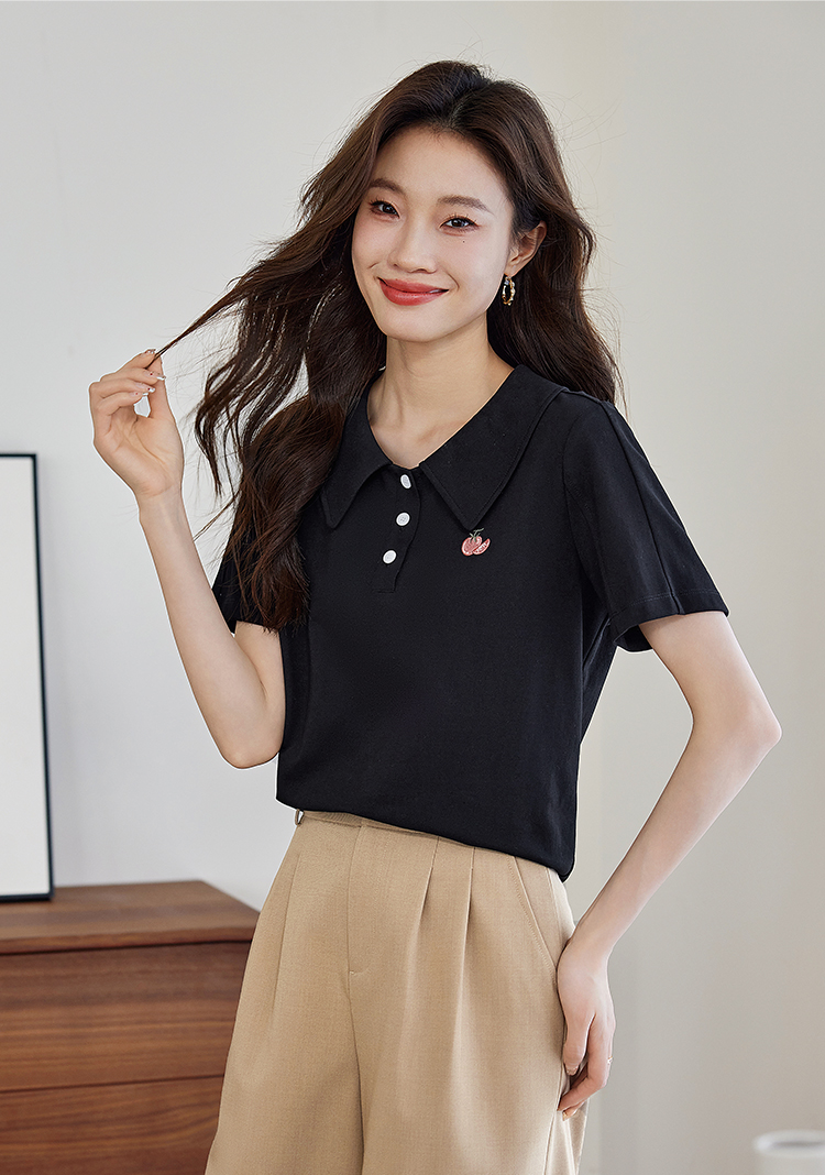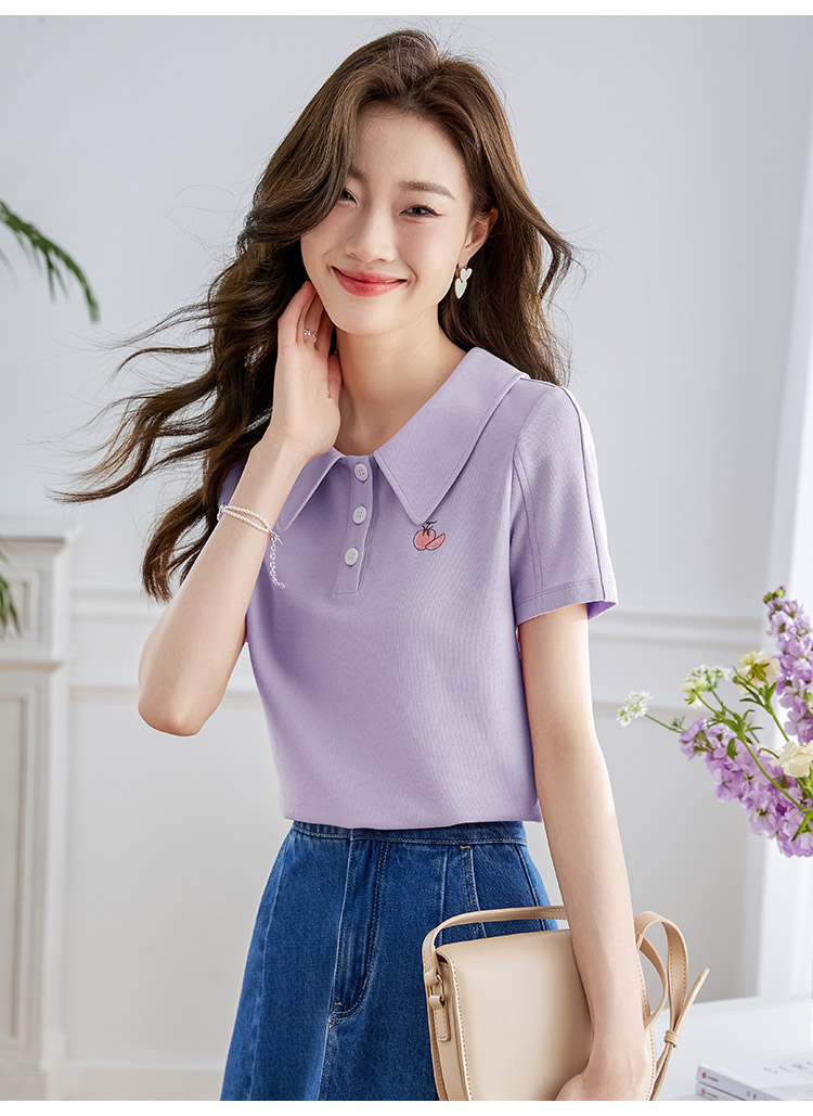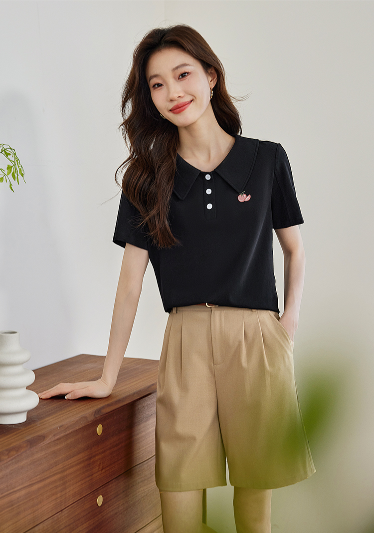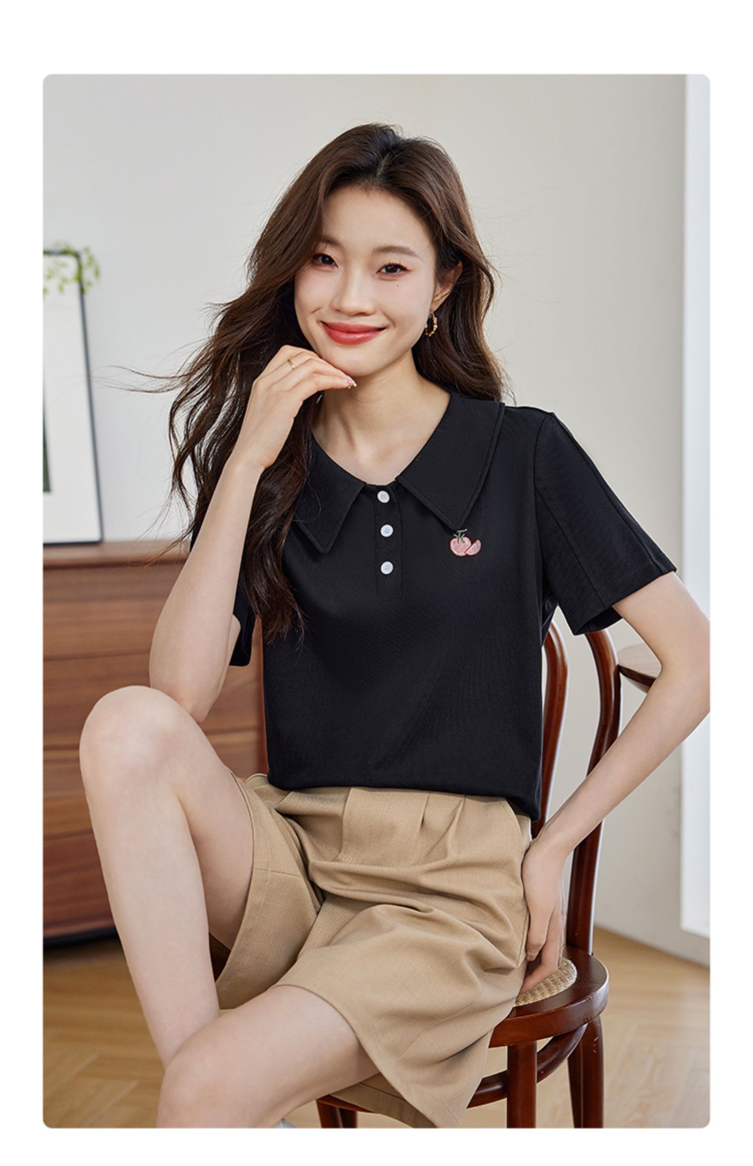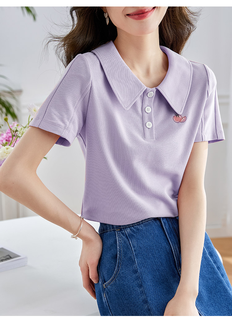 【专属特价】熙世界法式polo领正肩T恤夏2025新款甜美刺绣宽松显瘦短袖上衣