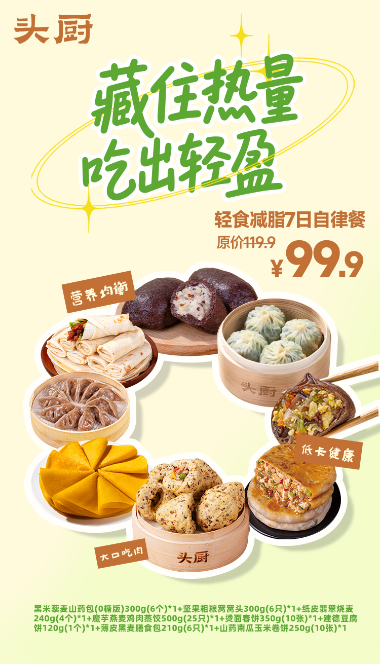 头厨|轻食减脂7日自律餐:黑米藜麦山药包+坚果粗粮窝窝头+纸皮翡翠烧麦+魔芋燕麦鸡肉蒸饺+烫面春饼+建德豆腐饼+薄皮黑麦膳食包+山药南瓜玉米卷饼