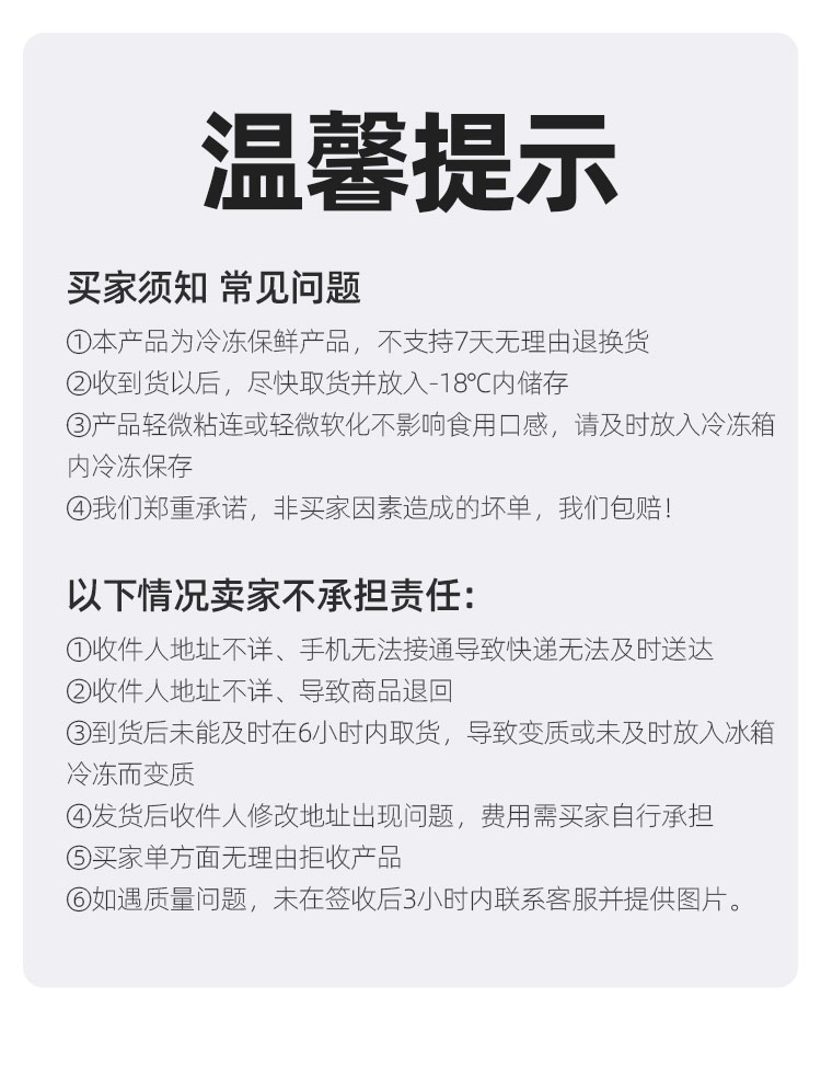 1.生鲜产品不适用7天无理由退换货,有问题签收后48小时内和客服沟通;